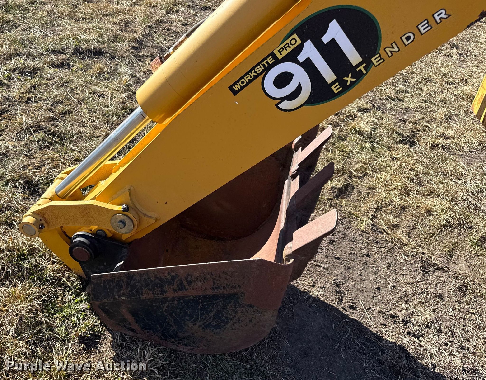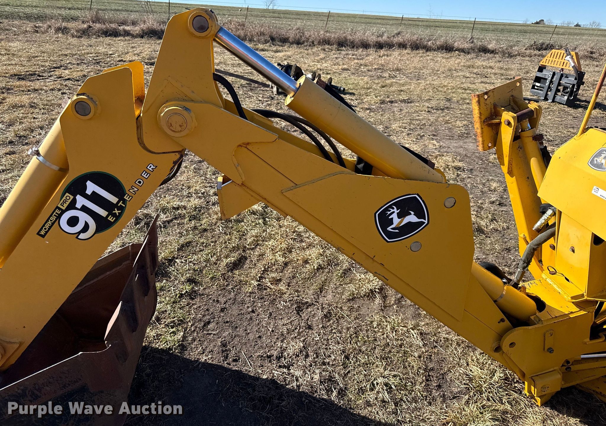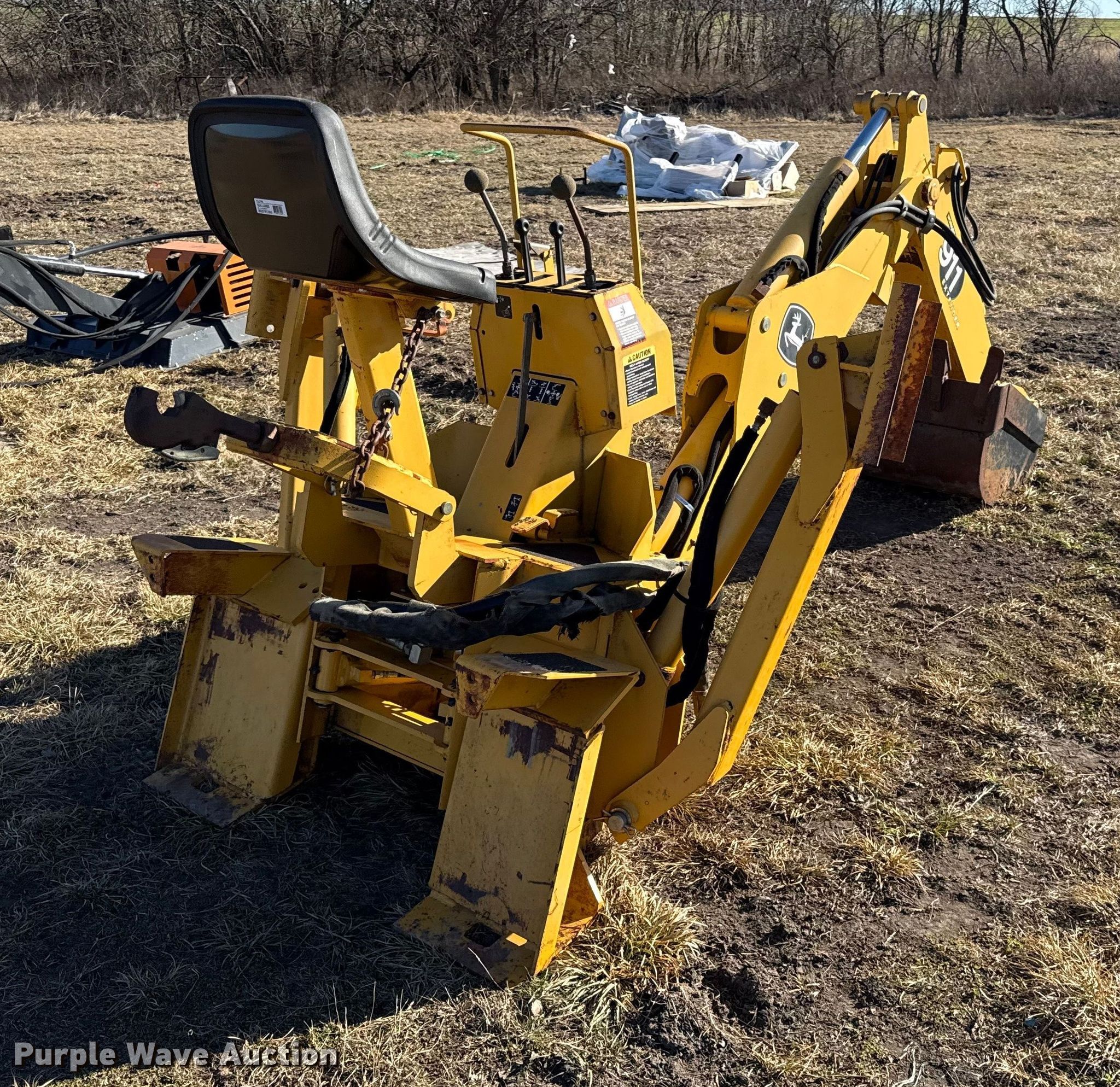 Purple Wave is selling a used Skid Steer Attach. in Kansas. This item is a John Deere 911 extender skid steer backhoe with the following: Width: 24", Teeth: Weld-on, Extendable stick