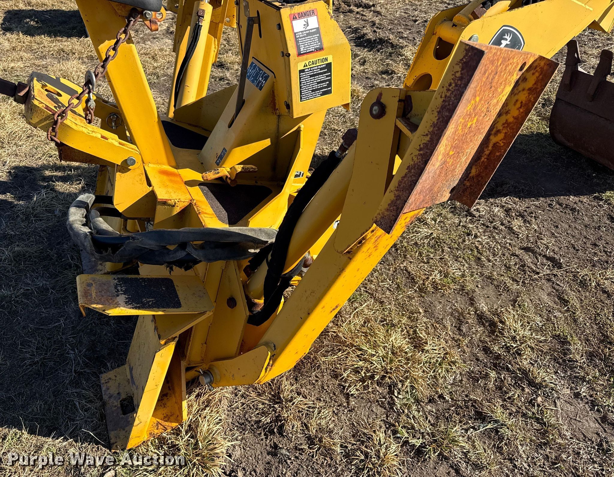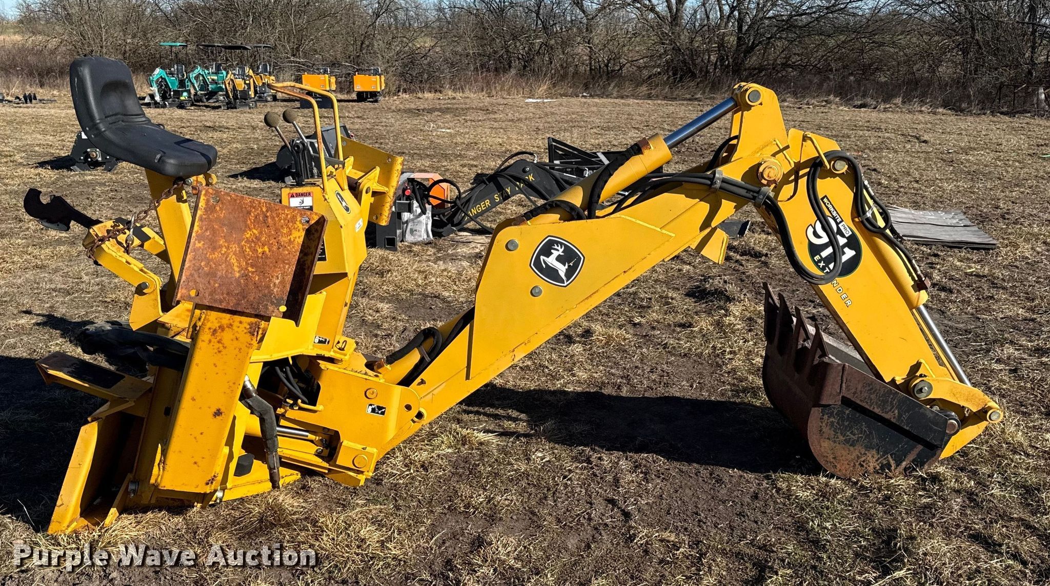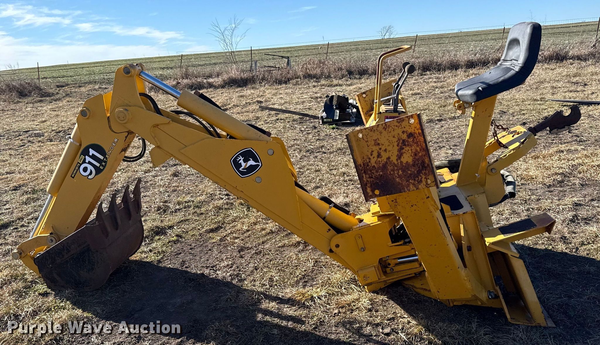 Purple Wave is selling a used Skid Steer Attach. in Kansas. This item is a John Deere 911 extender skid steer backhoe with the following: Width: 24", Teeth: Weld-on, Extendable stick