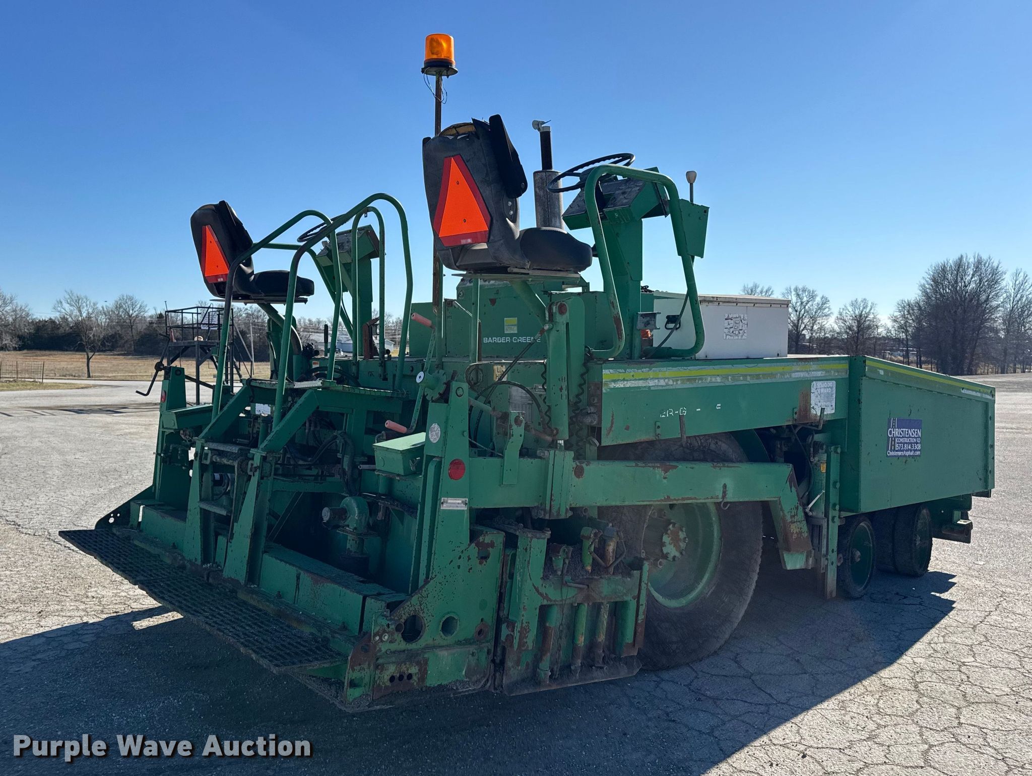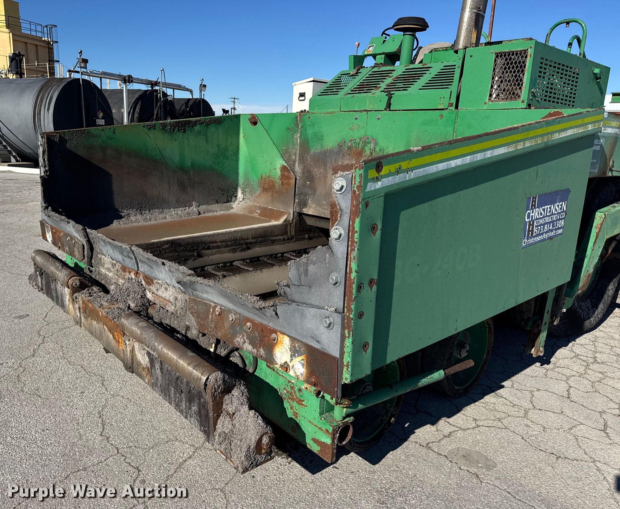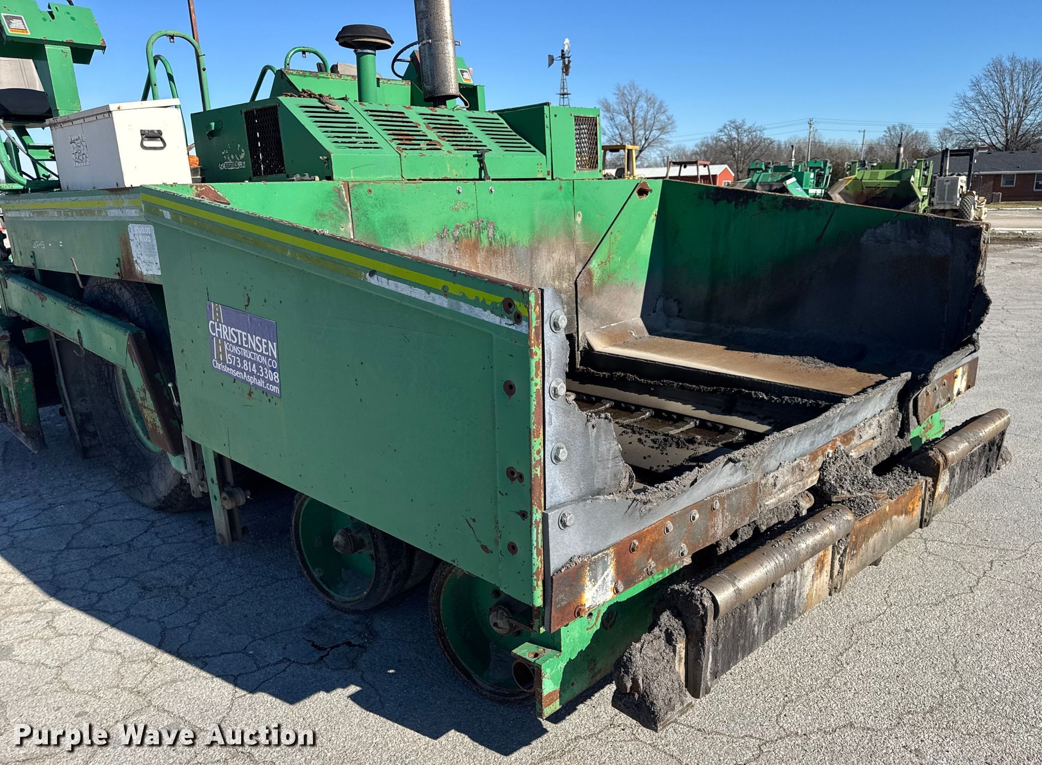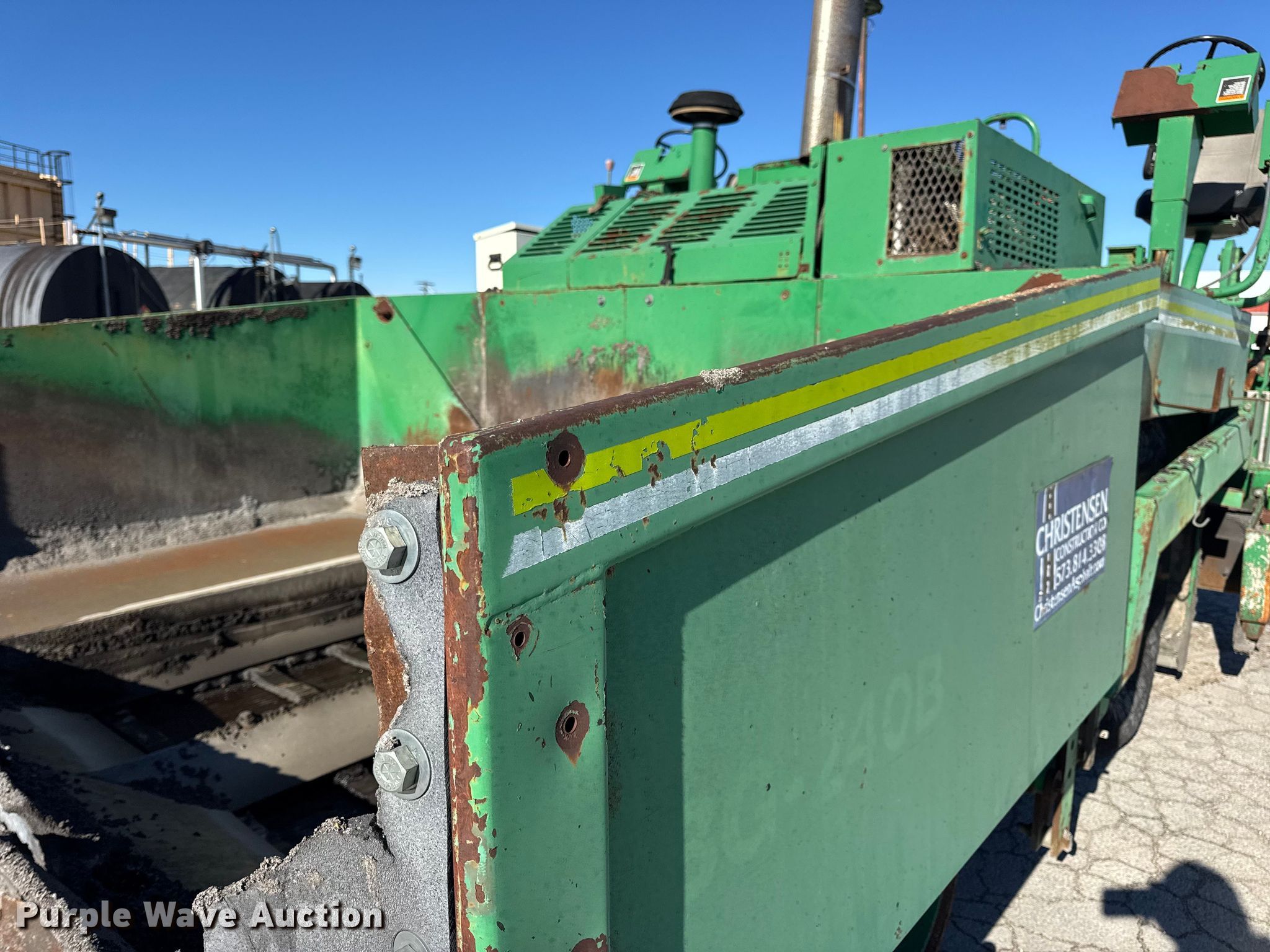 Barber-Greene BG240B screed. Hours: 5,290 on meter, Serial: BG240B666. Engine John Deere 4239TF001, Serial: T04239T221000, Cylinders: 4, Fuel type: Diesel. Transmission Hydrostatic. Features Screed Barber-Greene, Serial: SV100719, Paving width: 10' to 16', Extensions Quantity: 2, Screed heater: Diesel, Material conveyor Width: 57", Grade and slope controls. Tires Size: 16.00-24. Notes Hydraulic Leak, Non-operational Right side throttle controls. Christensen Construction. Columbia, MO 65202