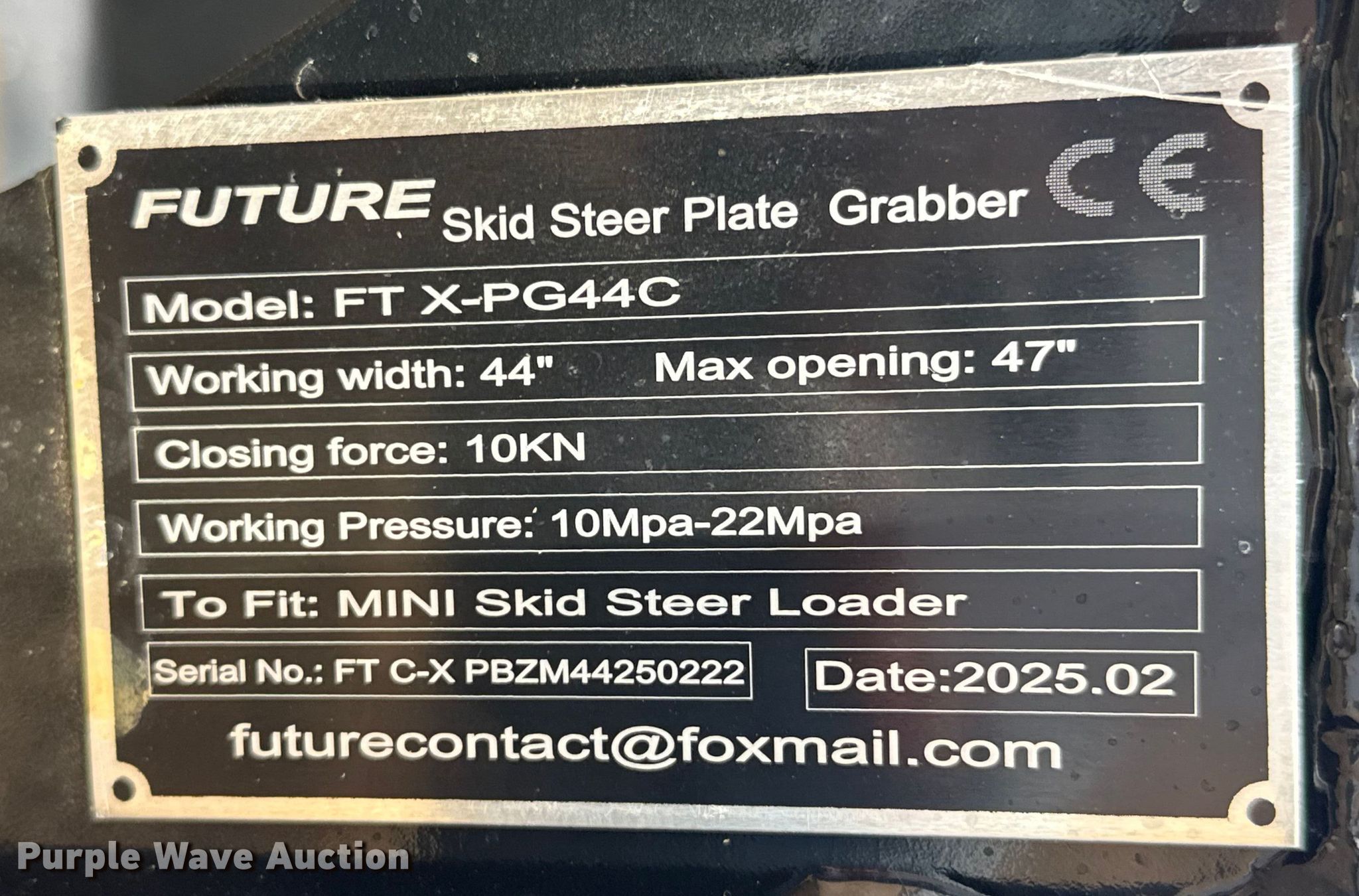Purple Wave is selling a used Skid Steer Attach. in Oklahoma. This item is a 2025 Future FT X-PG44C skid steer grapple bucket with the following: Serial: FT C-X PBZM44250222, Width: 44"