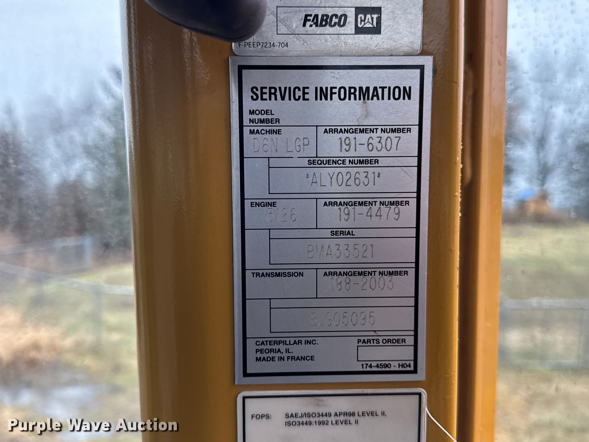 2006 Caterpillar D6N LGP dozer. Hours: 14,776 on meter, Serial: CAT00D6NAALY02631. Engine Caterpillar 3126, Cylinders: 6, Fuel type: Diesel, HP: 145, kW: 108.2. Transmission Powershift. Operators station Enclosed cab, AC, Heat, Steering: Differential. Features Rear drawbar, Dozer blade Blade type: 6-way, Blade shape: Straight, Width: 13' 2". Tracks Width: 34", Grouser pads: Single, Bottom rollers: 8, Track guards. CK Contractors LLC. Union Grove, WI 53182