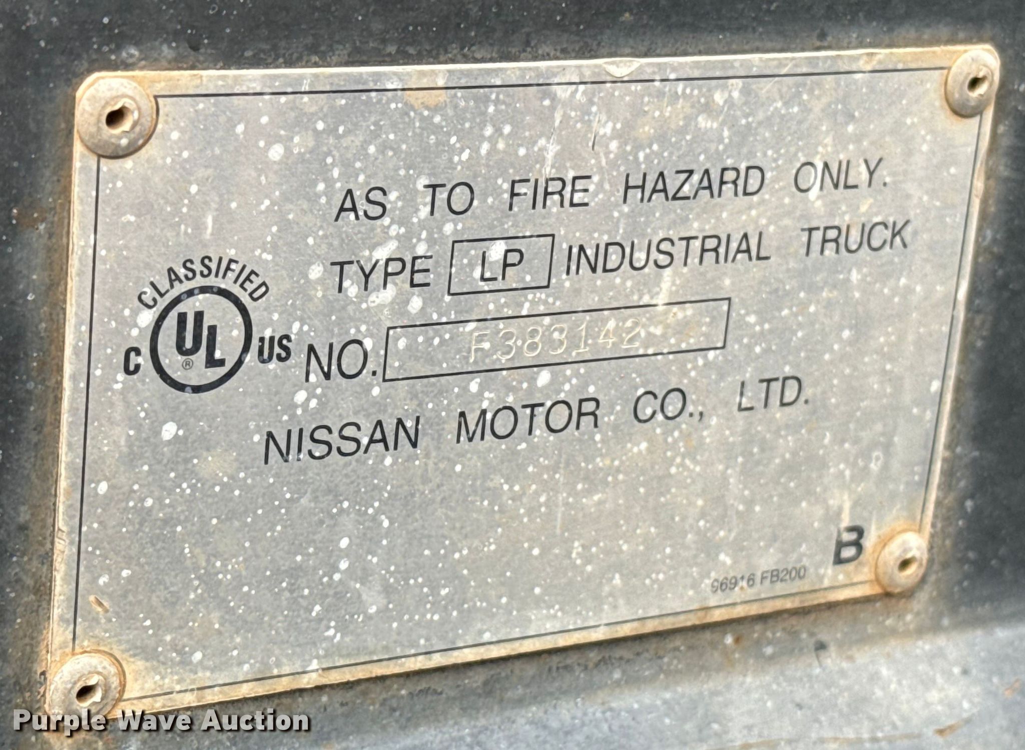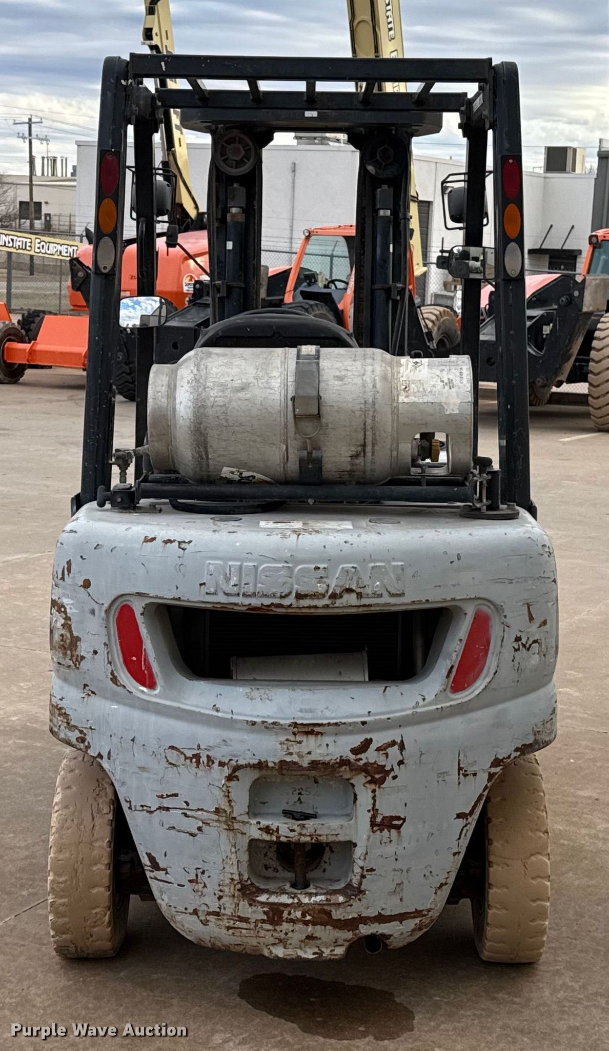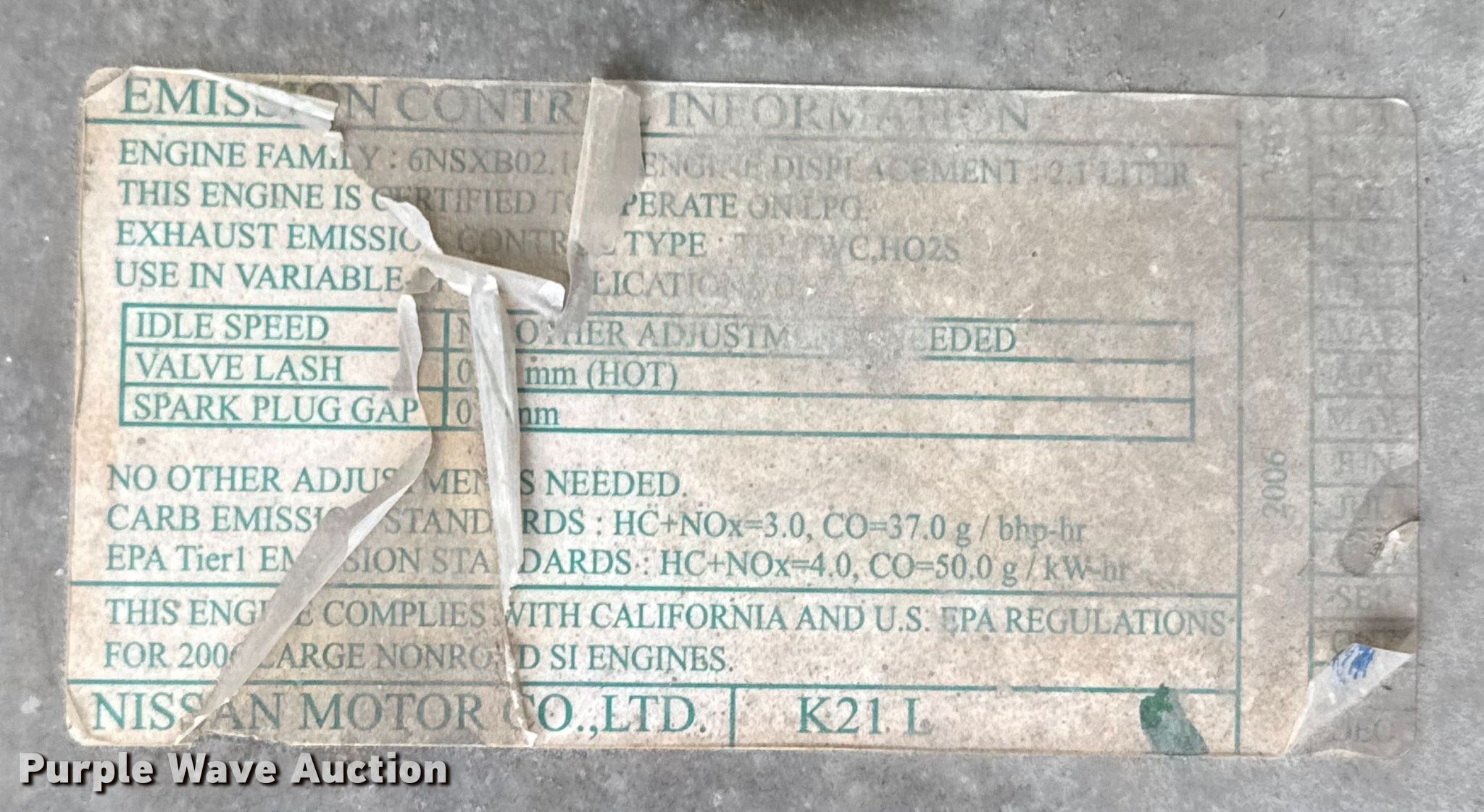 2006 Nissan MPL02A25LV forklift. Hours: 2,913 on meter, Serial: PL02-9H3126, Unit #: 78873. Engine Nissan K21L, Displacement: 2.1L, Cylinders: 4, Fuel type: LPG LP bottle: Included. Transmission Powershift. Operators station OROPS. Features Maximum lift capacity: 4,050 lbs, Maximum lift height: 187", Collapsed mast height: 80", Mast stages: 3, Side shift, Mast tilt, Fork length: 72". Tires Front: 7.00-13/5.00, Rear: 6.00-9/4.00, Solid. Notes Possible engine issues, intermittently misfires under load , Warning indicator: Code E-36. Sunstate. Oklahoma City, OK 73149