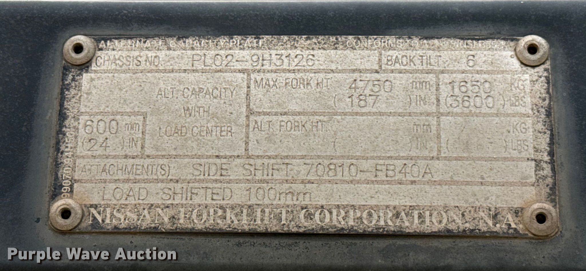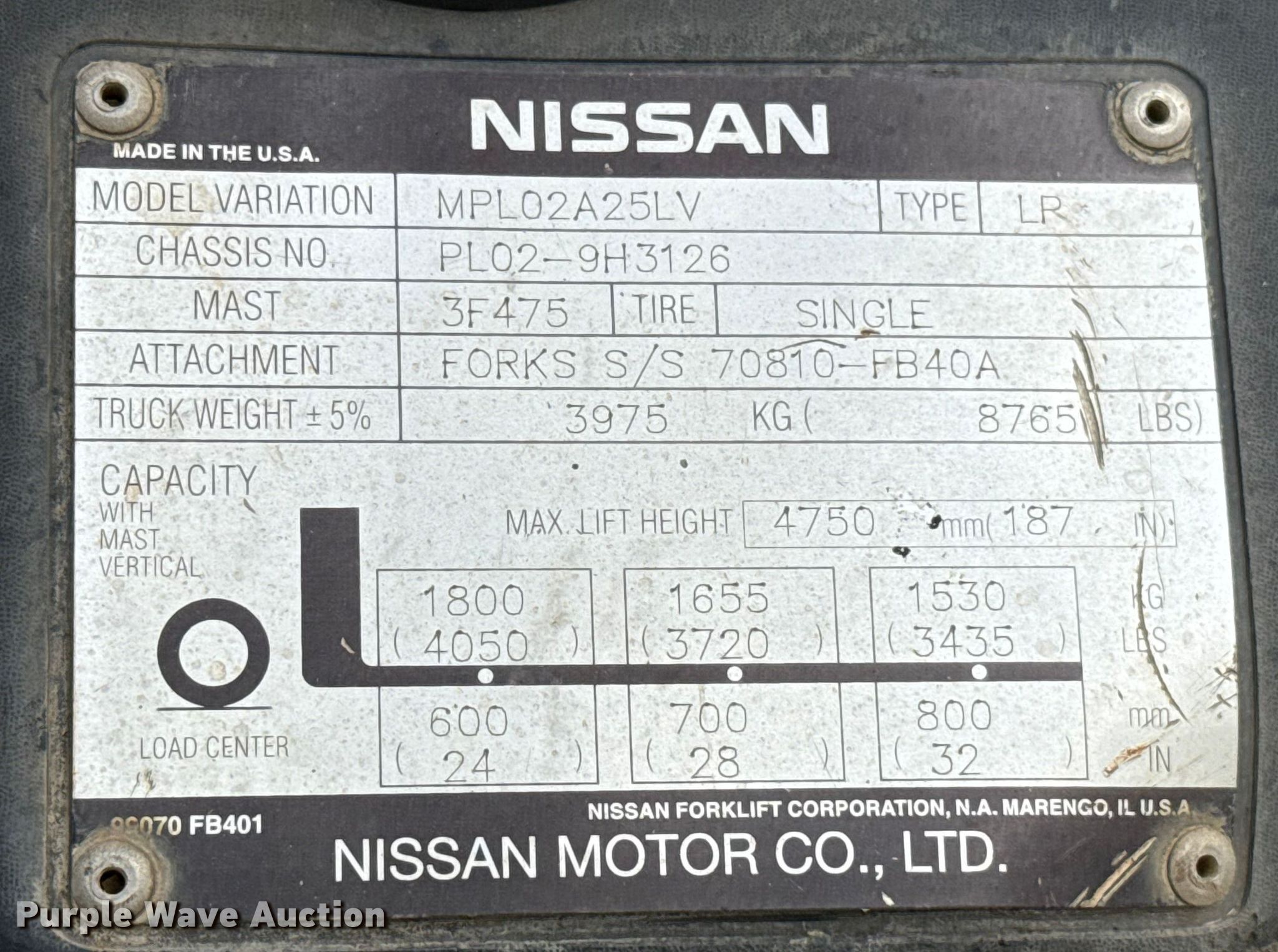Purple Wave is selling a used Cushion Tire or Pneumatic Forklift in Oklahoma. This item is a 2006 Nissan MPL02A25LV forklift with the following: Hours: 2,913 on meter, Serial: PL02-9H3126, Unit #: 78873
