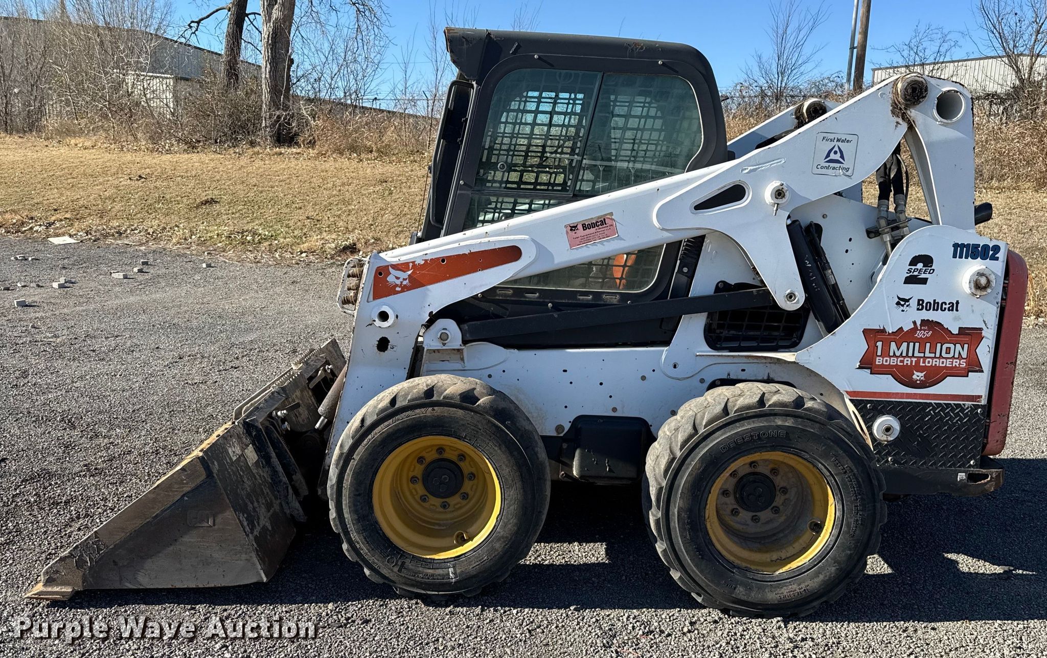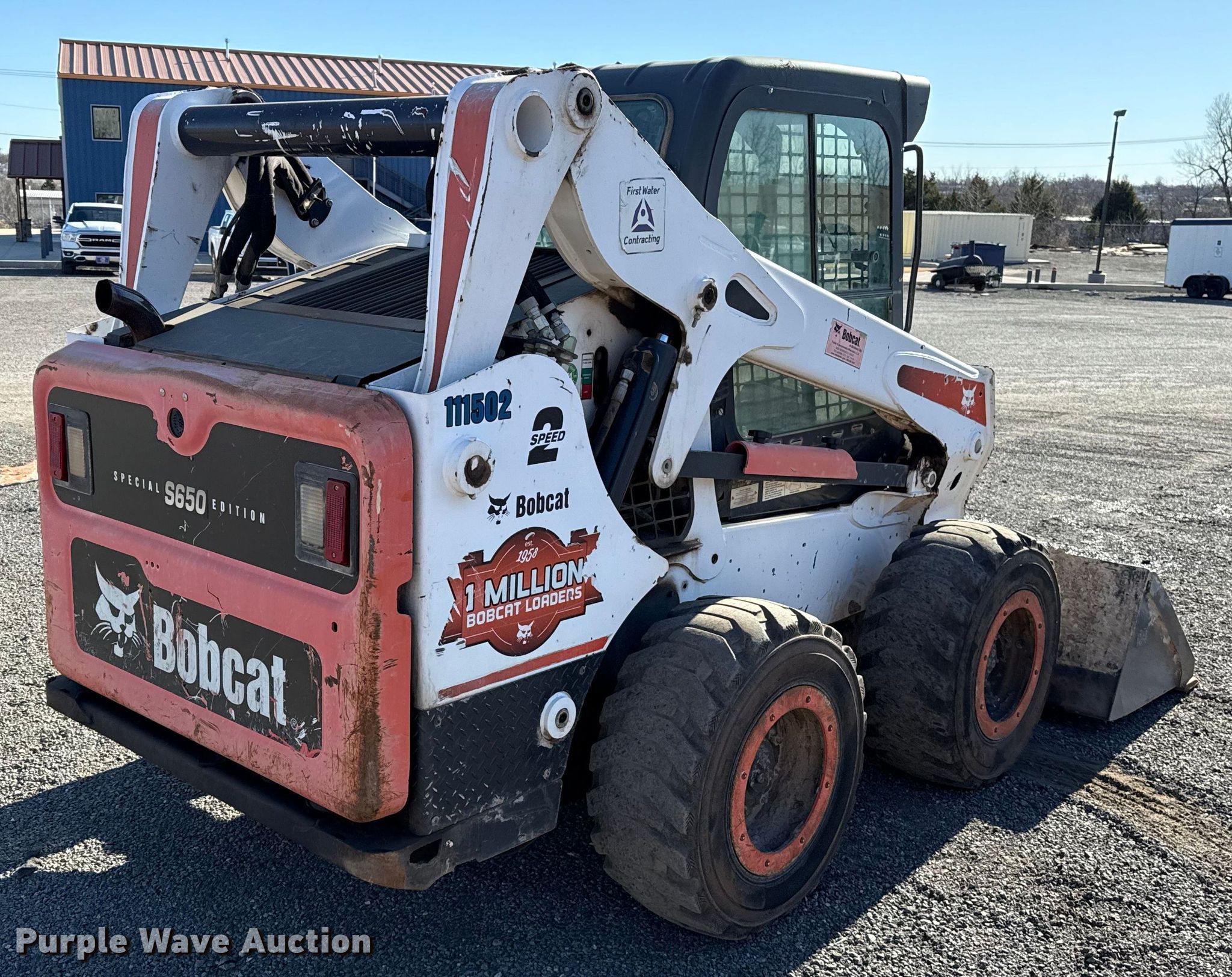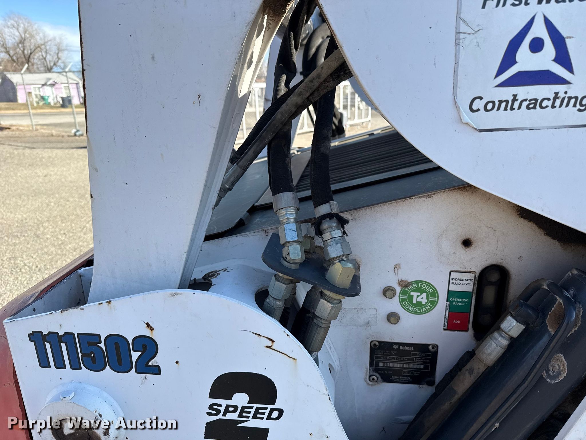 2014 Bobcat S650 skid steer loader. Hours: 4,499 on meter, Serial: S1ML11041. Engine Bobcat, Displacement: 2.4L, Cylinders: 4, Fuel type: Diesel. Transmission Hydrostatic, Two speed travel. Operators station Enclosed cab, AC, Heat, Bucket control: Foot, Electronic Monitoring System panel. Features Auxiliary hydraulics, Auxiliary electrical outlet, Bucket Caterpillar, Width: 80", Low profile, Cutting edge: Bolt-on. Tires Size: 12-16.5. Notes Warning indicator: Water in fuel system, Engine Issues, engine derate , Unknown operating condition of fuel gauge. First Water Contracting. Oklahoma City, OK 73129