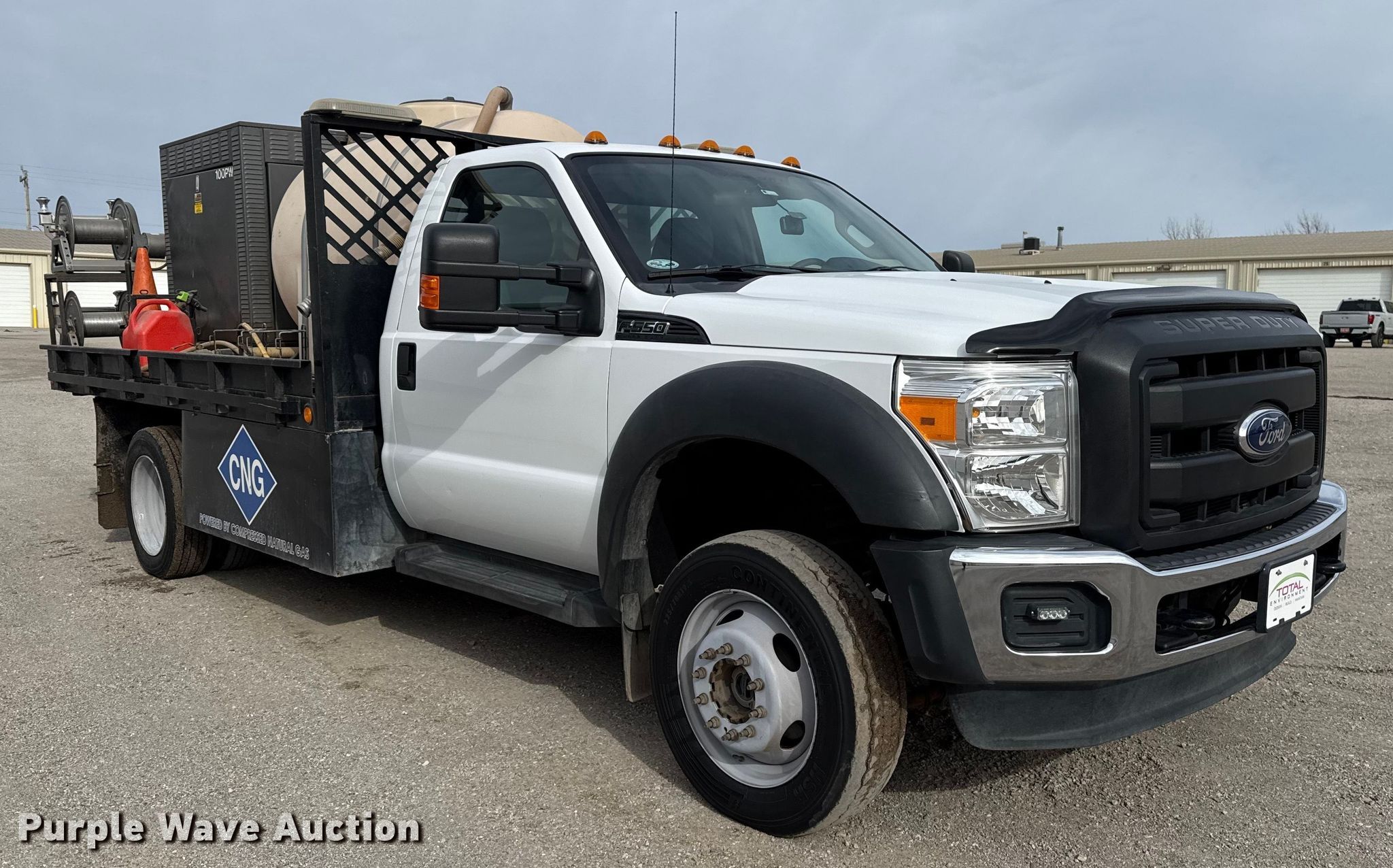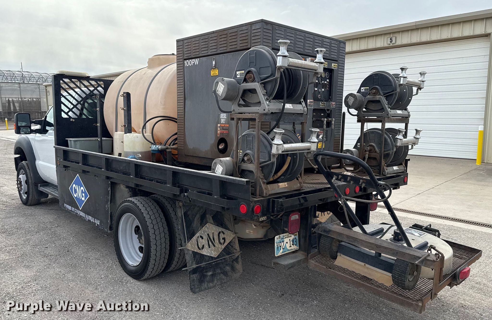 2011 Ford F550 Super Duty XL flatbed truck. Miles: 20,162 on odometer, Hours: 713 on meter, VIN: 1FDUF5HY9BEC24778. Engine Displacement: 6.8L, Cylinders: 10, Fuel type: CNG, HP: 362. Transmission Automatic, Four wheel drive. Interior AC, Heat, Heated mirrors, Power windows, Power locks, Cruise control, Auxiliary controls, Brake controller. Features Bed Flatbed, Length: 12', Width: 92", AaLadin pressure washer Isuzu 3CE1-BDZP1 engine, Serial: 002867, Cylinders: 3, Displacement: 1.642L, Fuel type: Diesel, Hours: 713 on meter, Hose reels: 4, (2) spray wands, Water tank Capacity: 525 gallons, Concrete pressure washer. Tires Size: 225/70R19.5. Notes Jump start required during on-site data collection, Engine stalls , Possible battery issues, weak, Camera not included. Oklahoma title. Total Environment. Edmond, OK 73013