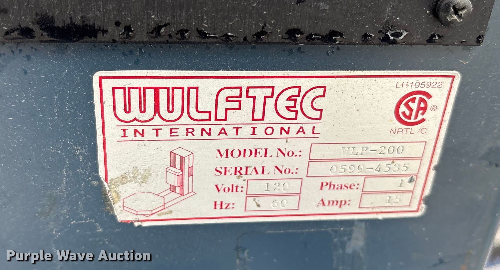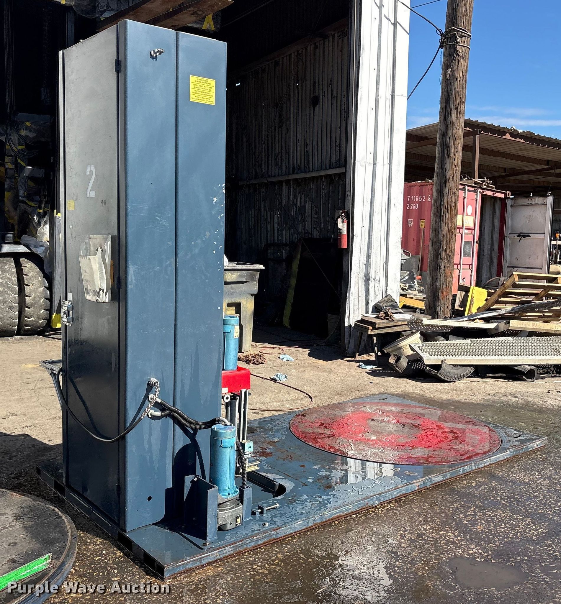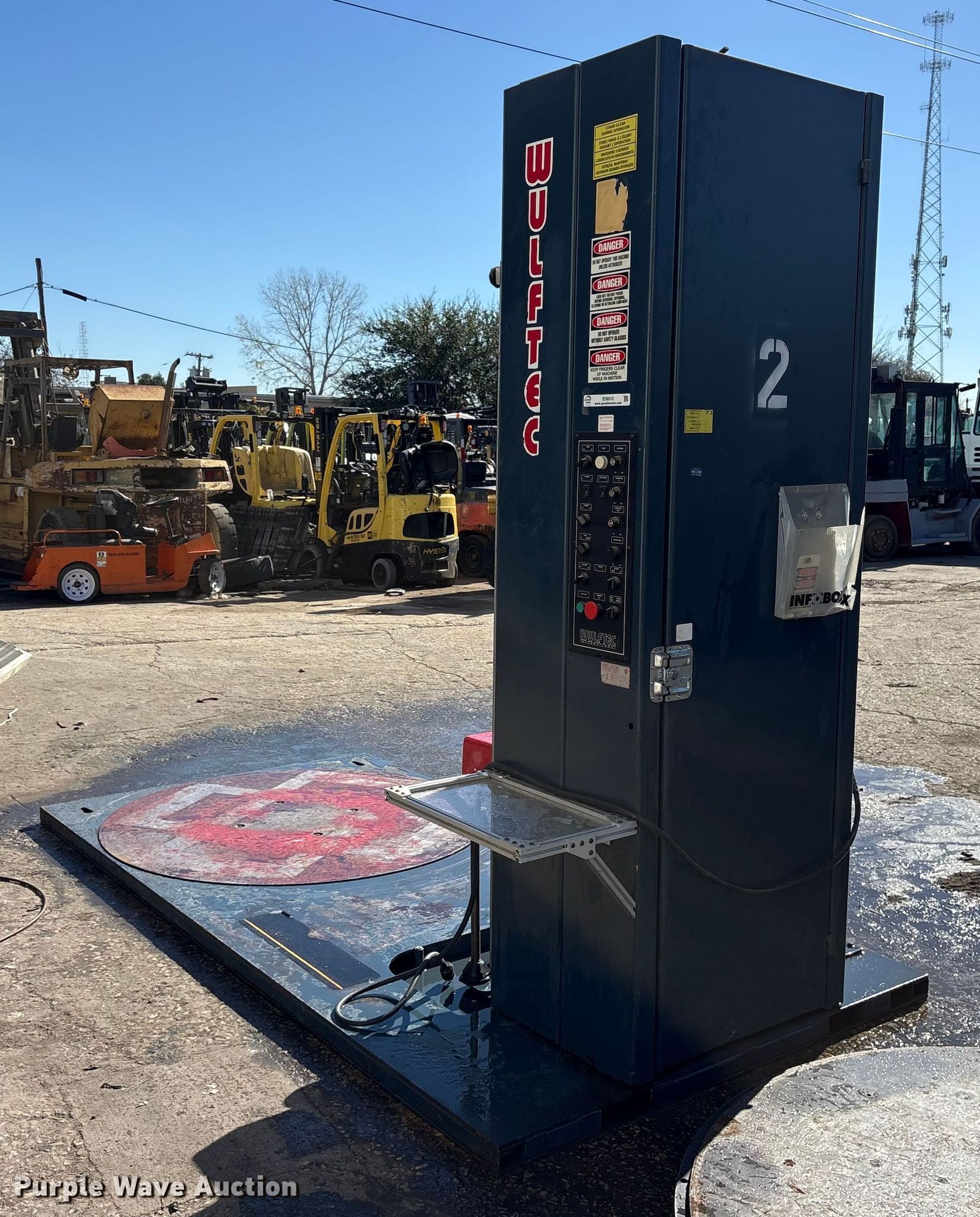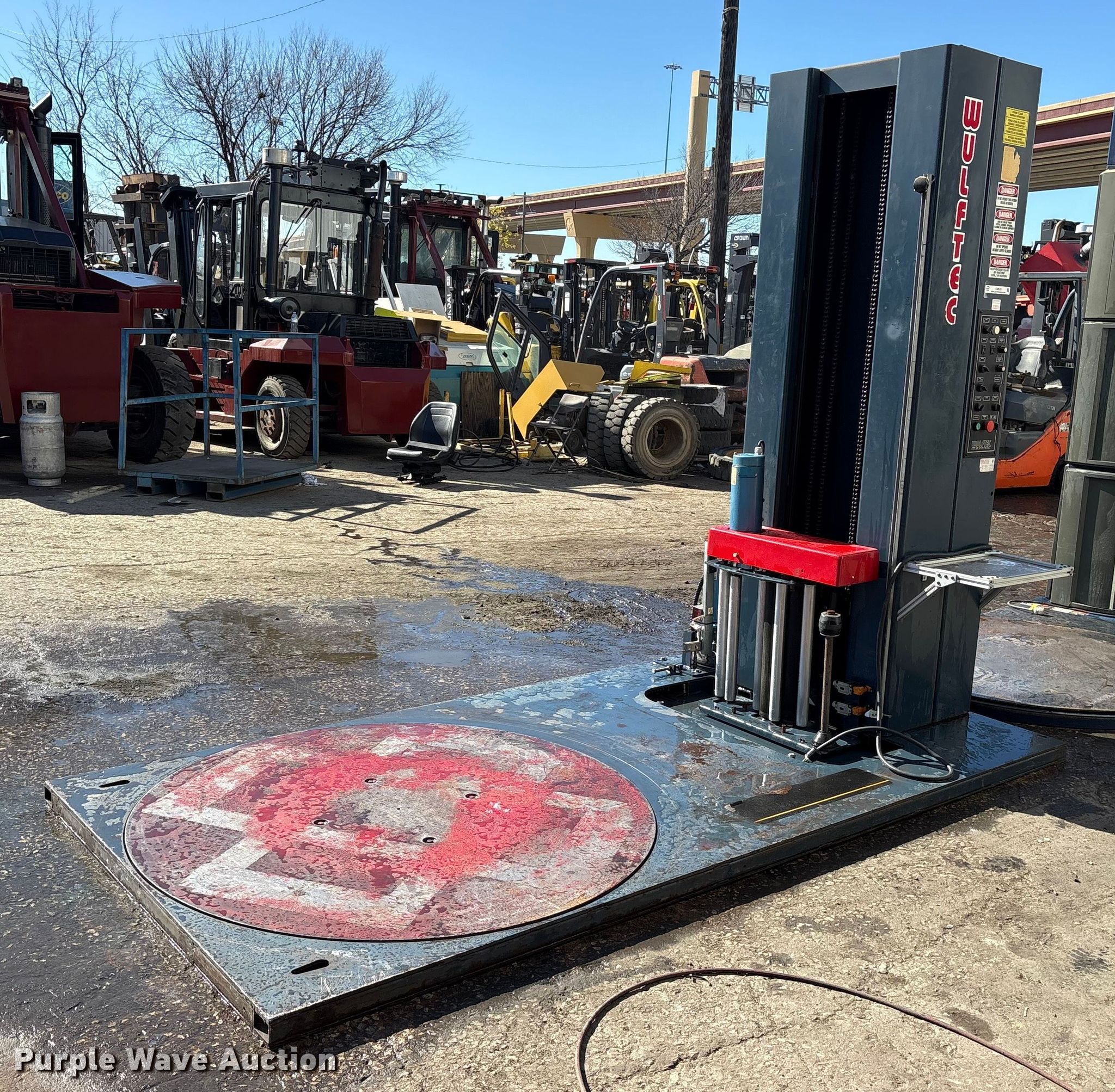 Purple Wave is selling a used Tools in Texas. This item is a Wilfred International WLP-200 pallet wrap machine with the following: Wheel size: 4'10", Volts: 120, Phase: 1, Serial: 0599-4535