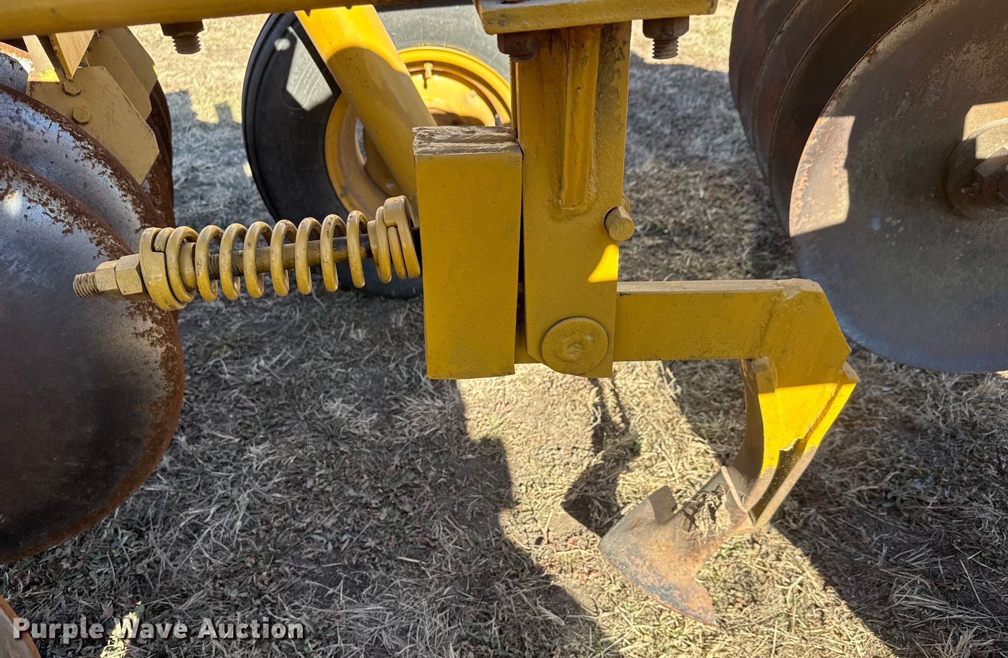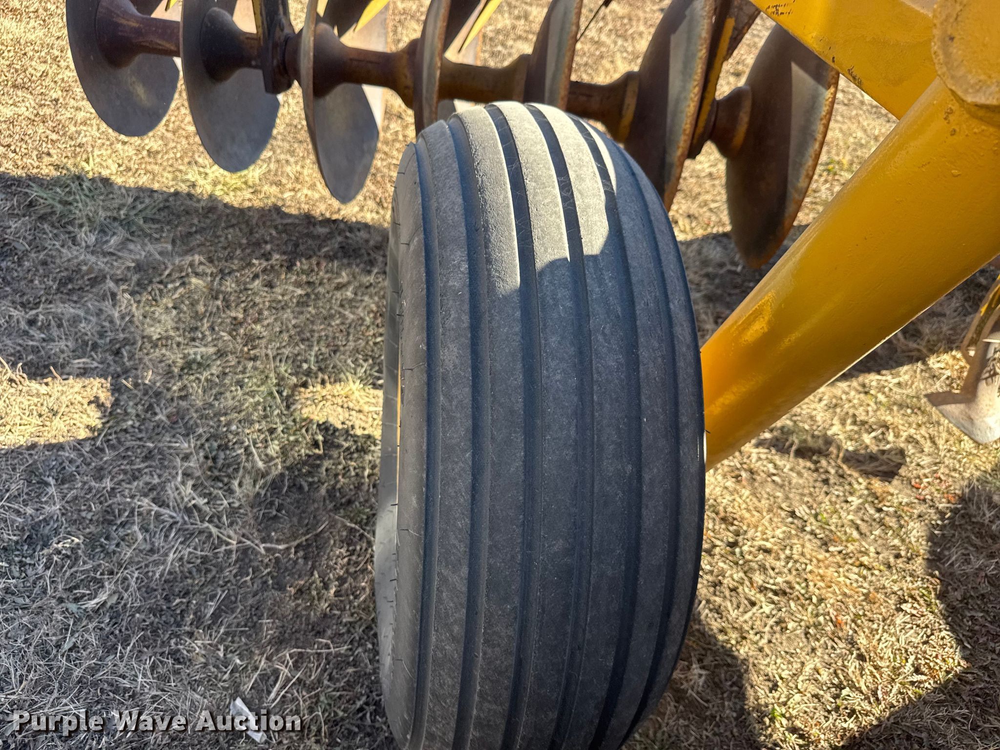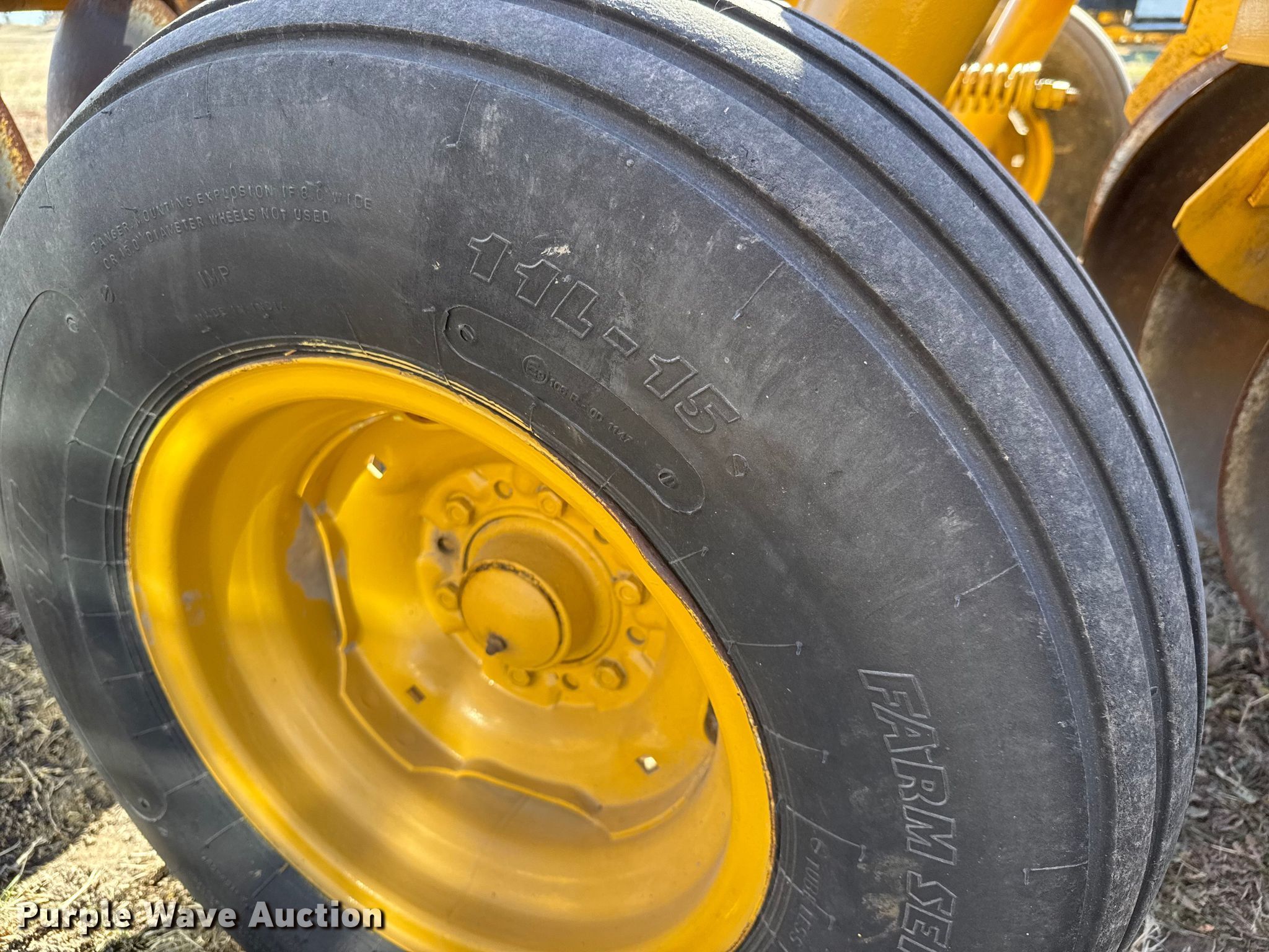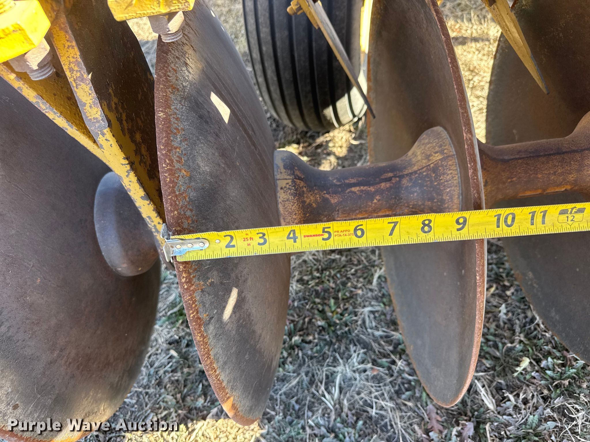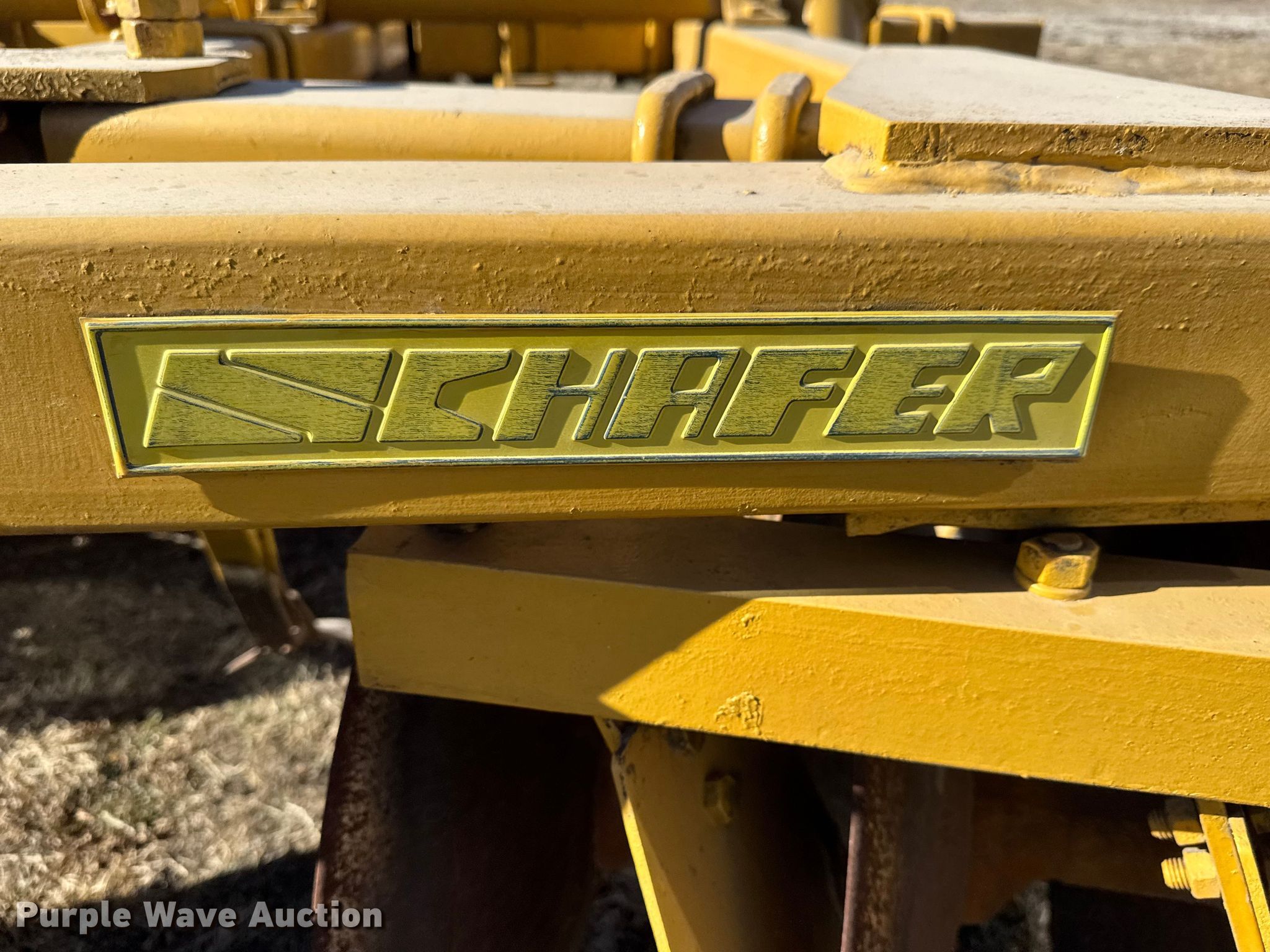 Schafer tandem disk. Overall width: 11' 10". Features Front blades Diameter: 22", Spacing: 9", Rear blades Diameter: 23", Spacing: 9", Disk scrapers, Operation Hydraulic lift, Attachments Rear hitch. Tires Tire size: 11L-15. Stands Farms, LLC. El Dorado, KS 67042