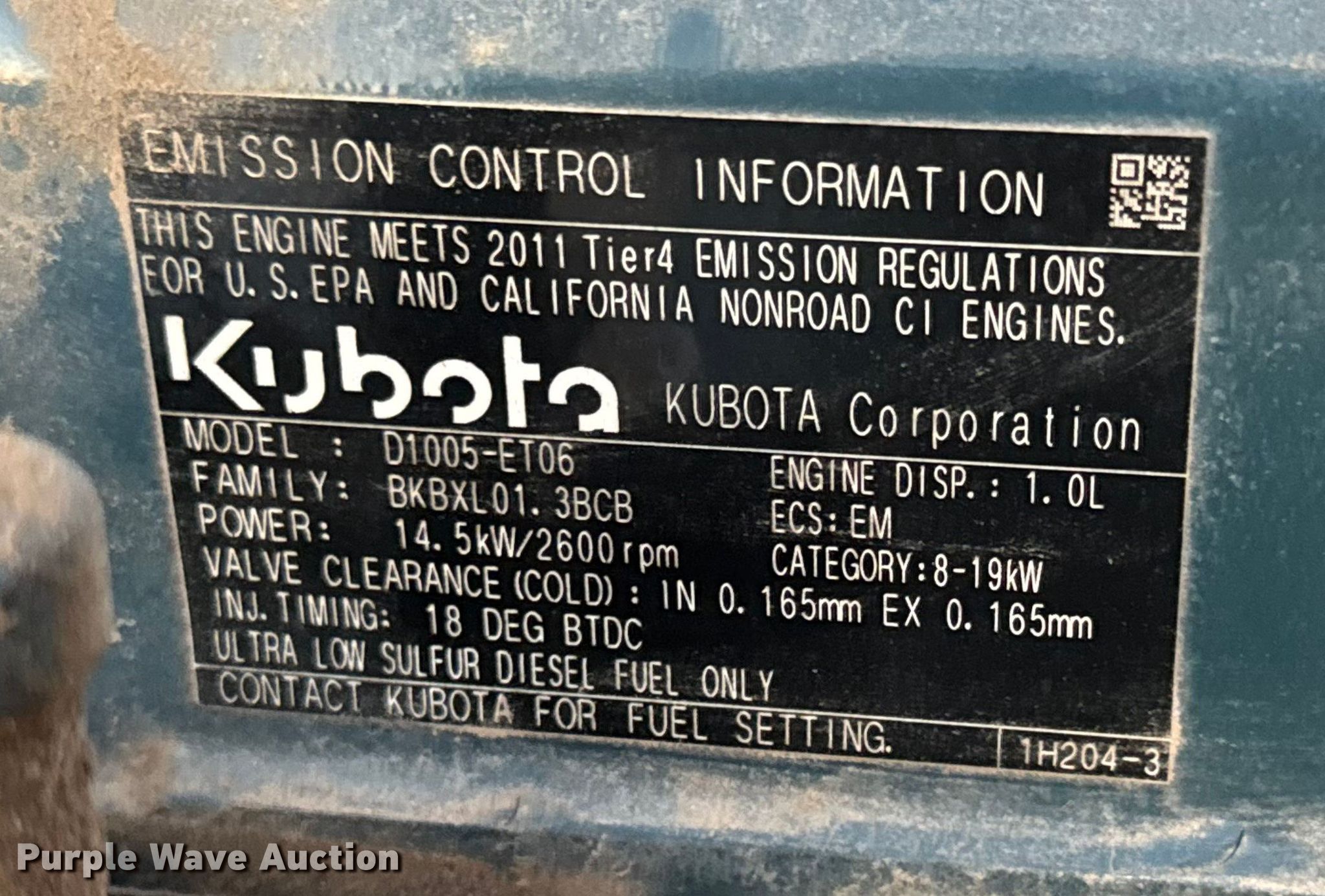 2011 Bomag BMP 8500 trench compactor. Hours: 1,037 on meter, Serial: 101720111725, Unit #: 64.105L. Engine Kubota D1005, Serial: BG1899, Displacement: 1.0L, Cylinders: 3, Fuel type: Diesel. Transmission Hydrostatic. Features Vibratory system, Drum: Padfoot Width: 24", Diameter: 20", Drum scrapers: Front, Rear, Remote control. Sherwood Construction Company. Wichita, KS 67277