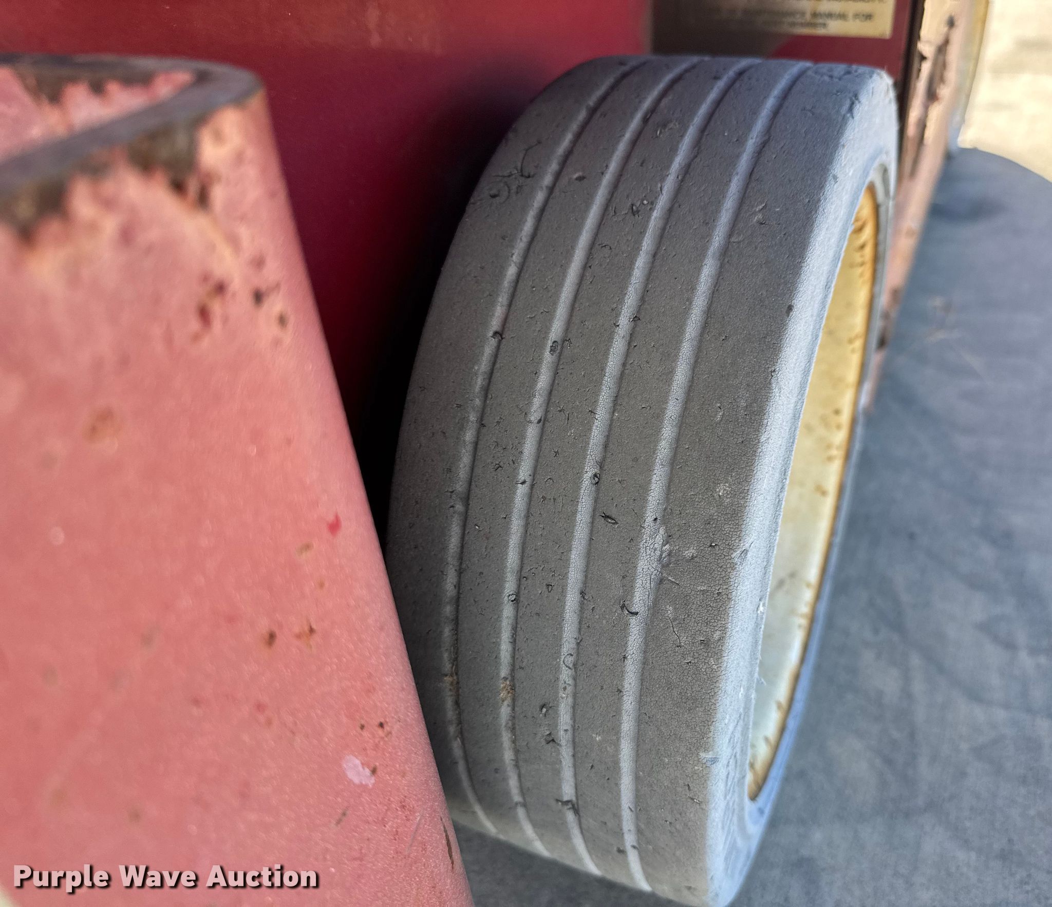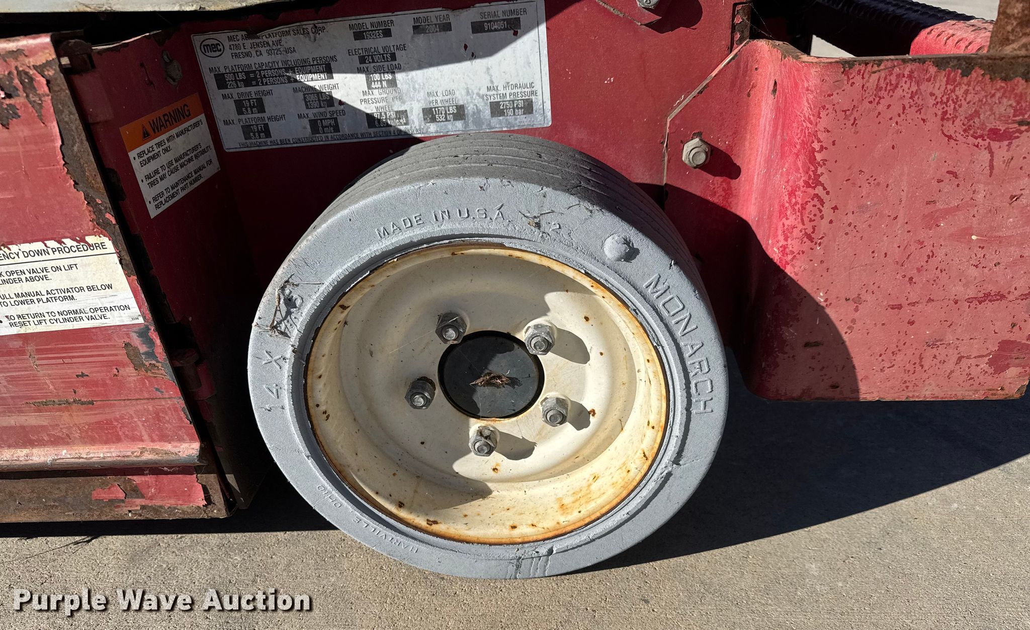 2004 MEC 1932ES scissor lift. Serial: 9104051. Electric Motor Volts: 24. Features Maximum lift capacity: 500 lbs, Maximum lift height: 19', Platform: 65" L x 30" W, AC power outlet, Controls: Platform, Ground, Platform extensions: Manual. Tires Tire size: 4x4.5, Solid. Notes Unknown operating condition of hour meter. CM3 Mechanical Contractor. Wichita, KS 67209
