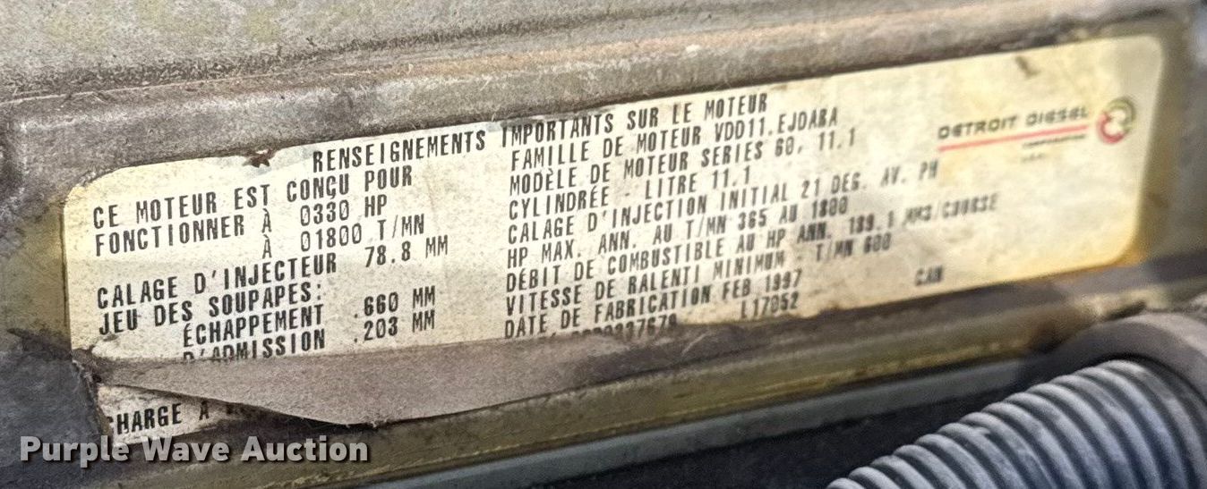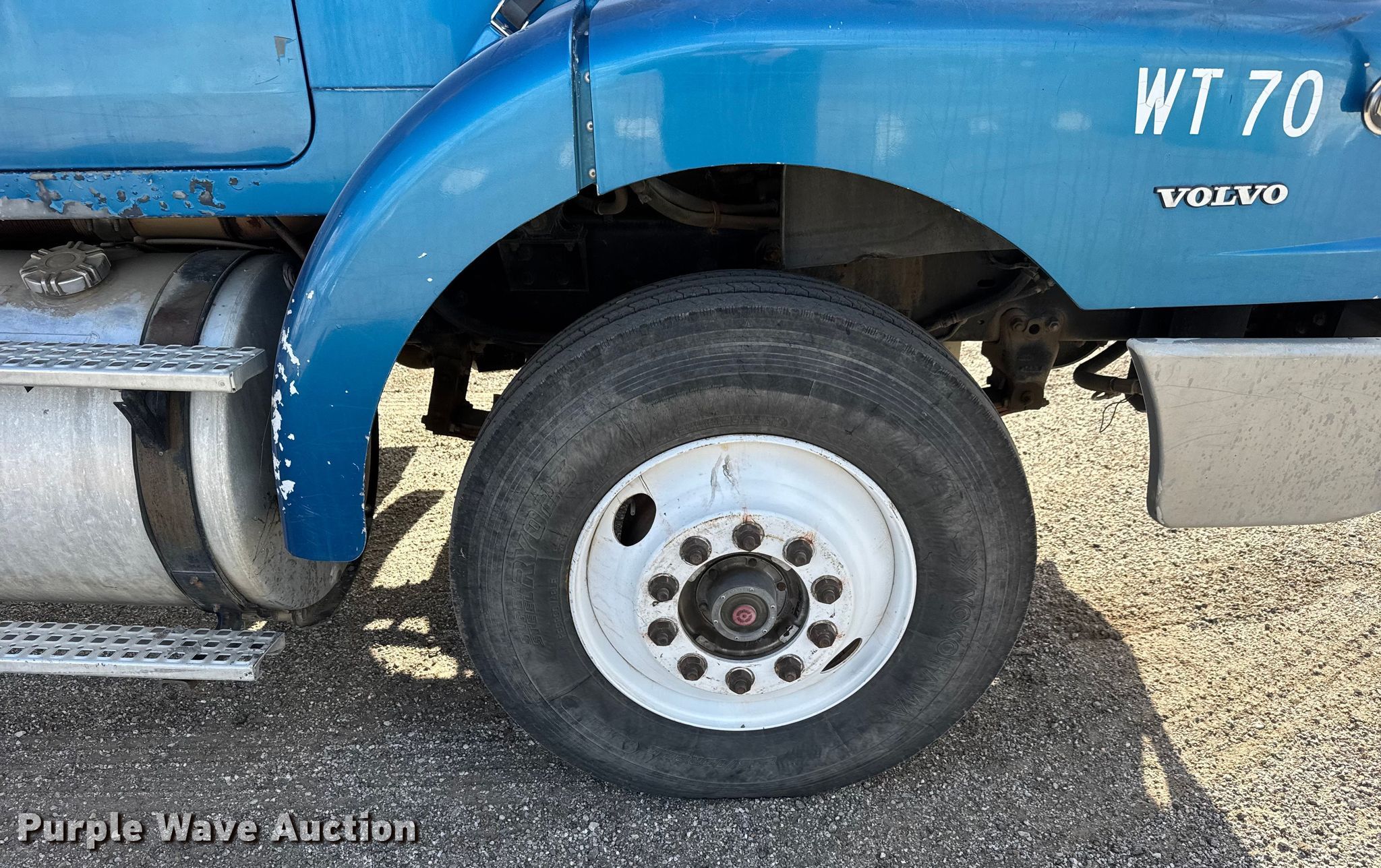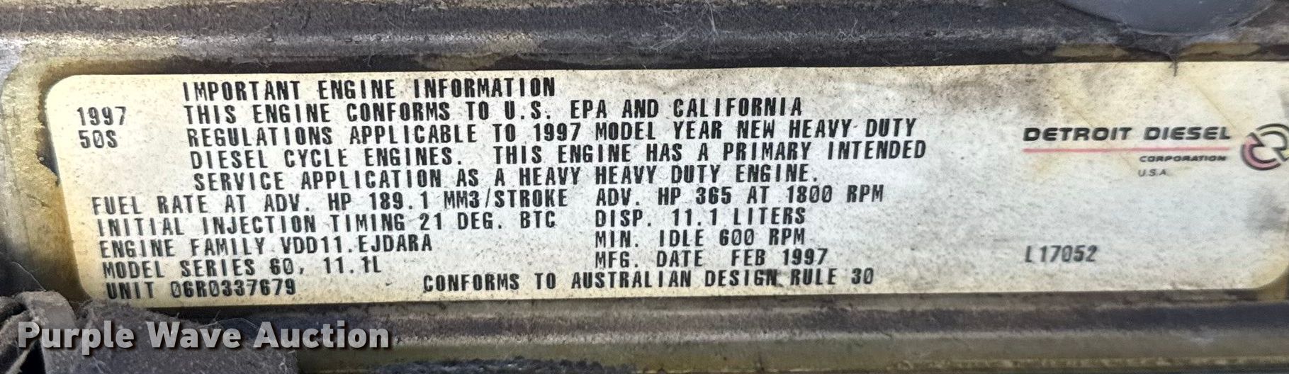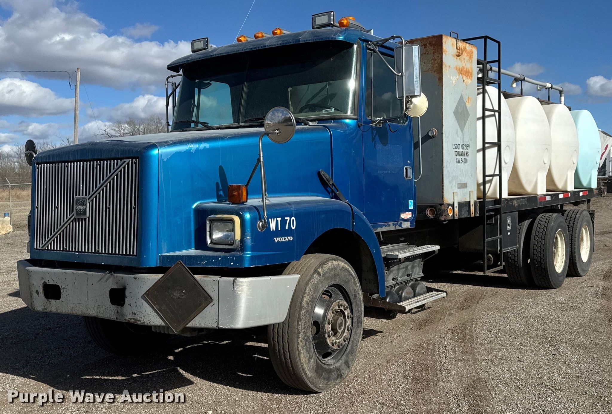 1997 Volvo WG64T tank truck. Miles: 11,279 on odometer, VIN: 4VGJDARF6VN858077. Engine Detroit Diesel Series 60, Serial: 06R0337679, Displacement: 11.1L, Cylinders: 6, Fuel type: Diesel, HP: 325. Transmission Eaton Fuller RTX-13609B, Manual, Speed: 9. Chassis Axles: Tandem, Differential lock: Inter-axle, Suspension: Air, Brakes: Air, GVWR: 50,000 lbs. Interior AC, Heat, Cruise control. Features Bed Flatbed, American Standard, Serial: 182594, Length: 20' 6", Width: 96", Capacity: 3,000 gallons, Top fill, (4) 750 gallon poly tanks, Banjo pump, Briggs and Stratton Displacement: 288cc, Cylinders: 1, Fuel type: gas. Tires Size: 295/75R22.5. Notes Windshield chipped or cracked, Unknown operating condition of pump engine. Kansas title. Title distribution may be delayed up to 14 days from verification of funds. Dustrol Inc... Towanda, KS 67144