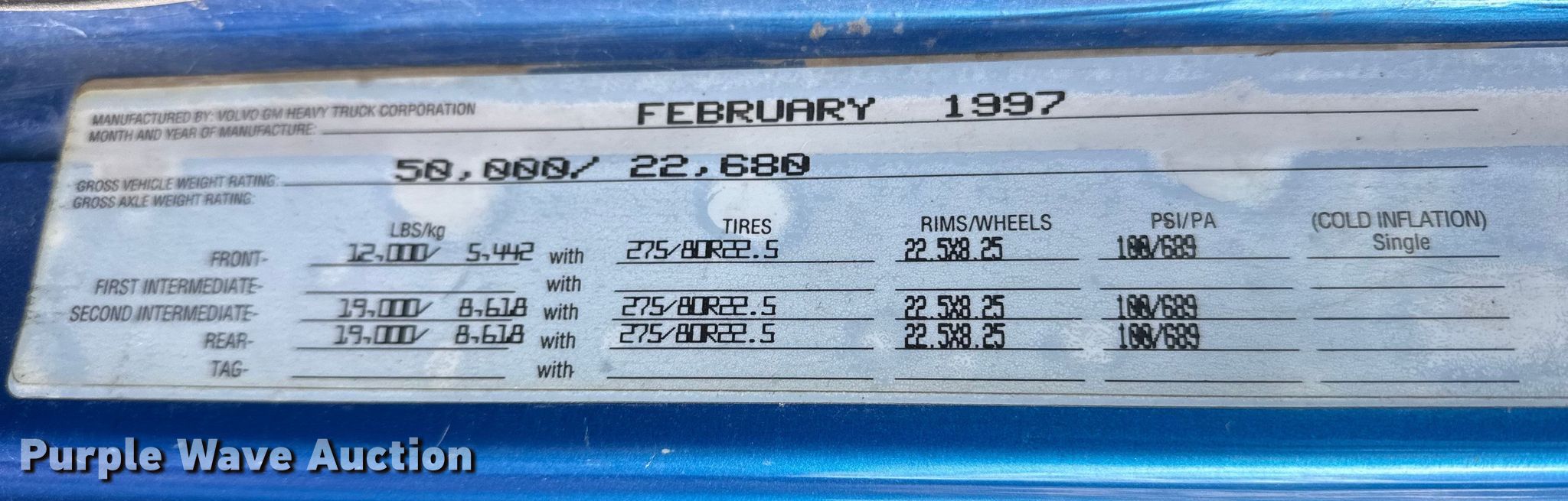 Take a look at this used 1997 Volvo WG64T tank truck being sold on February 12th, 2026 in the Thursday February 12 Construction Equipment Auction made by Volvo. Take a look at all of the item information below or take a look at similar auctions for Trucks.
