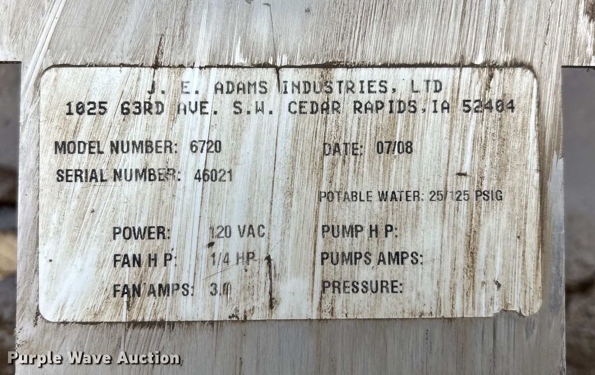 Purple Wave is selling a used Portable Heater or Fan in Missouri. This item is a 2008 I.E. Adam's 6720 mister fan with the following: Serial: 46021