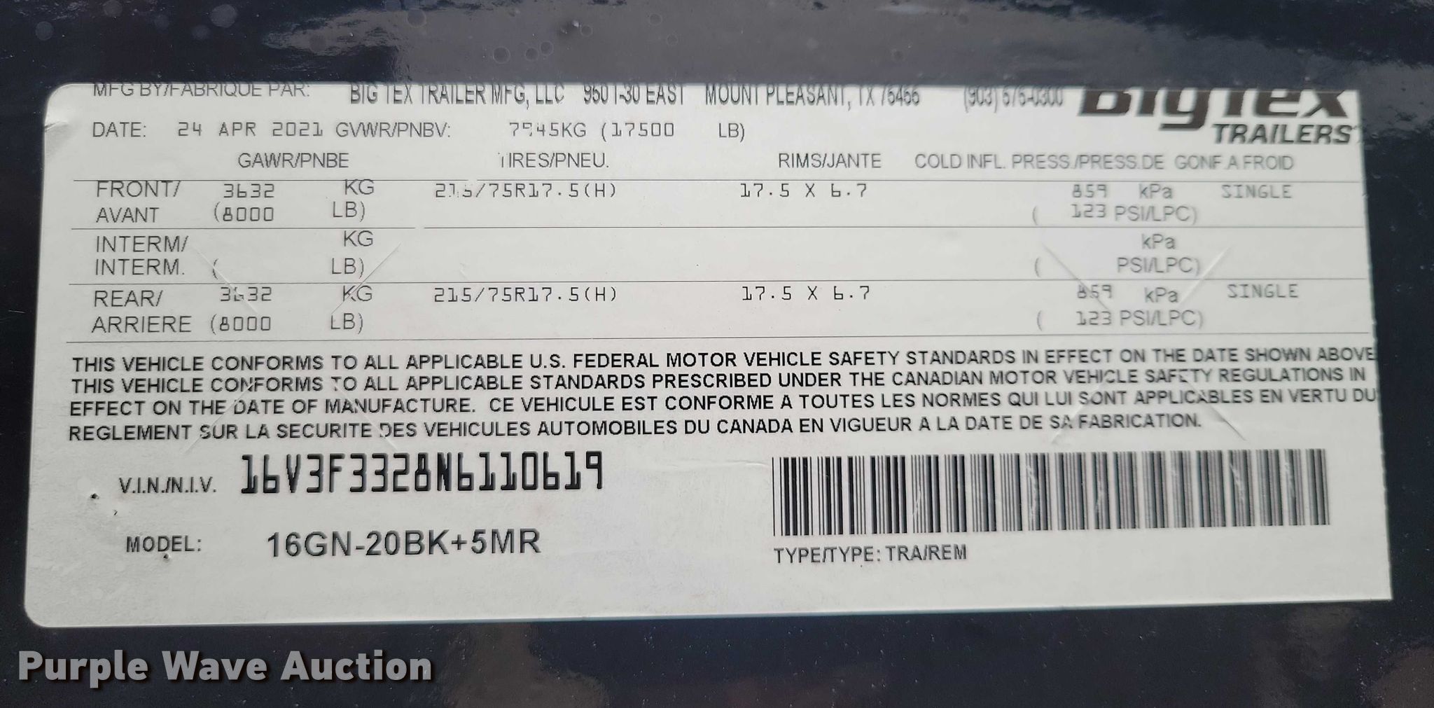 Purple Wave is selling a used Equip. Trailer in Iowa. This item is a 2022 BigTex 16GN equipment trailer with the following: VIN: 16V3F3328N6110619, Unit #: 2014