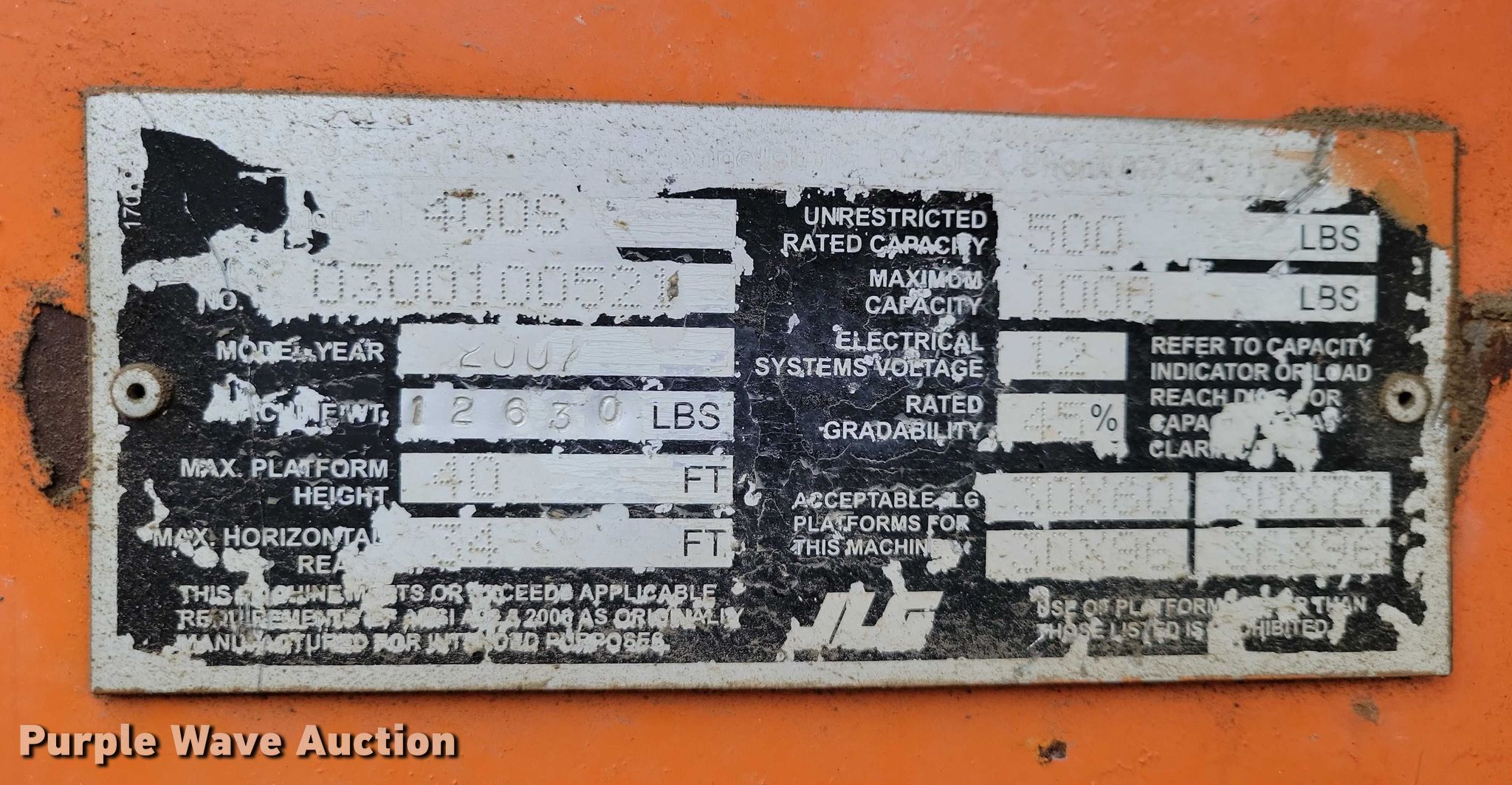Purple Wave is selling a used Boom Lift in Iowa. This item is a 2007 JLG 400S boom lift with the following: Hours: 2,287 on meter, Serial: 0300100521
