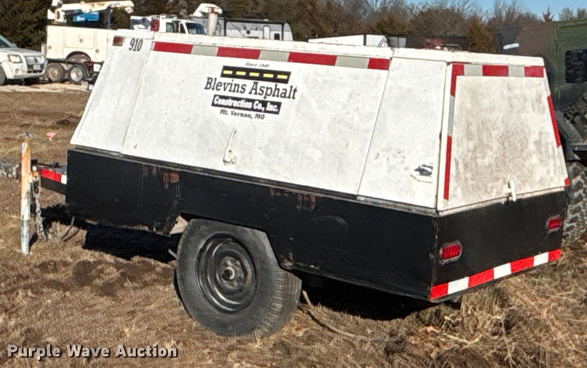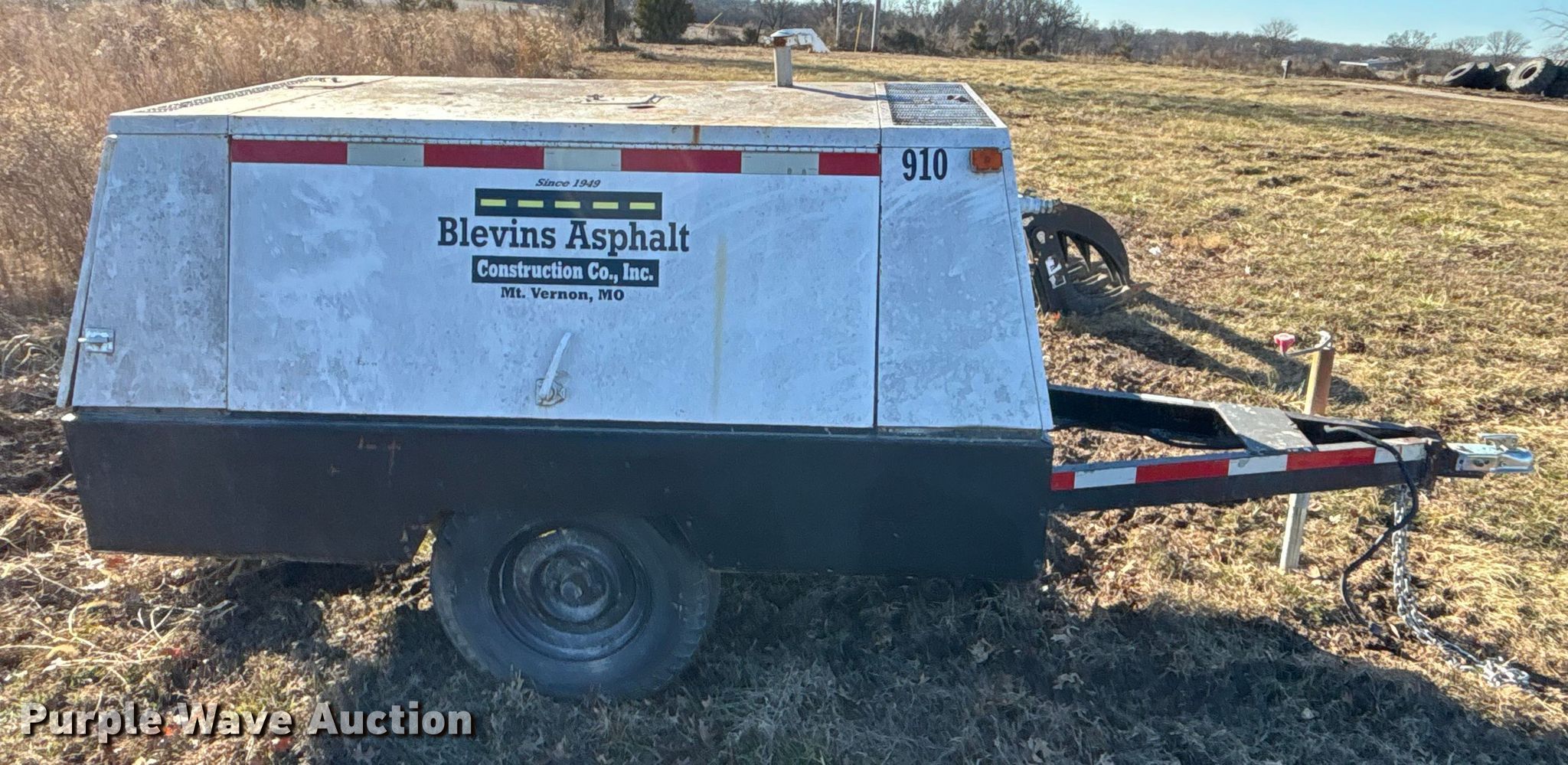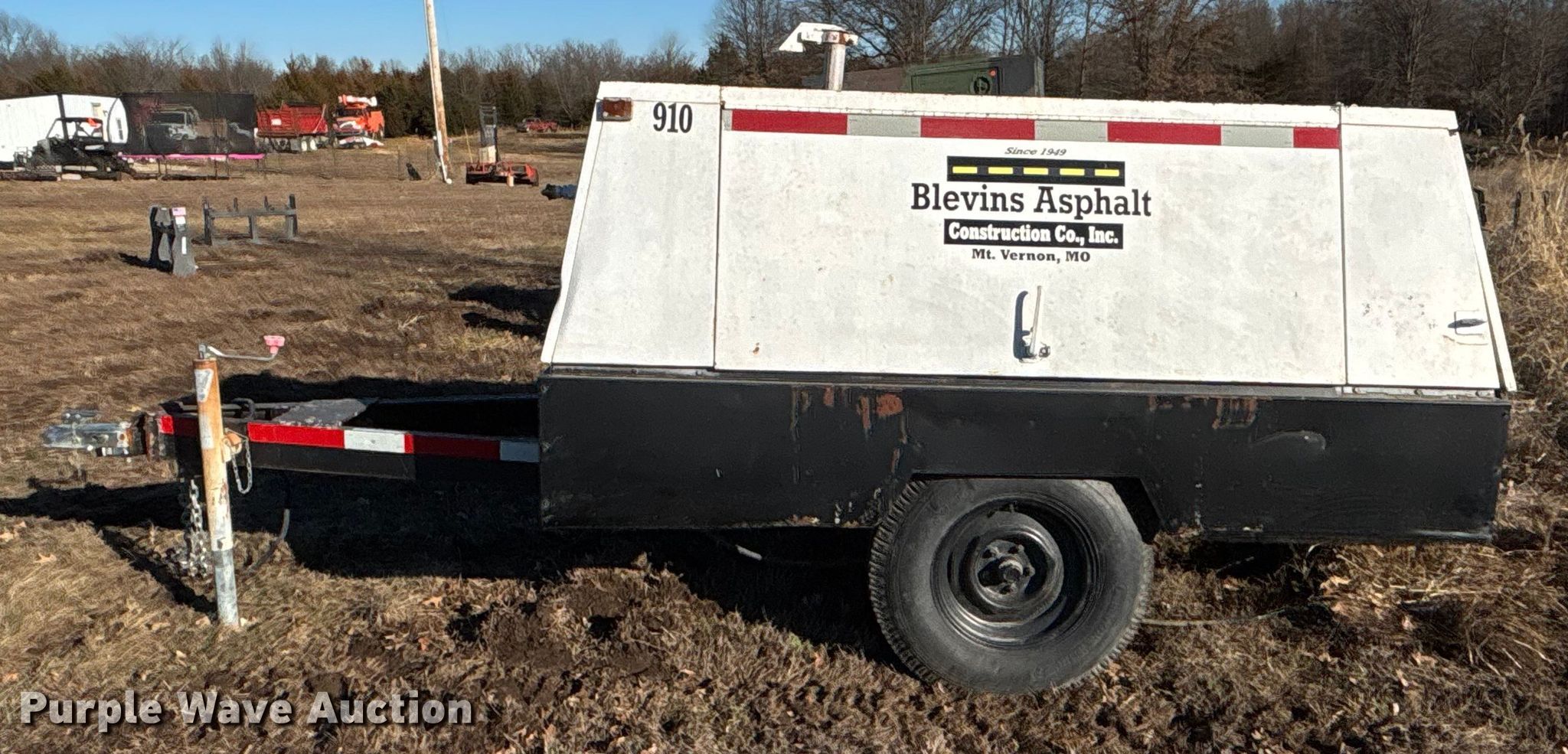 Cooper industries D0190ER7A air compressor. Hours: 1,908 on meter, Serial: 1903977. Engine Perkins, Cylinders: 4, Fuel type: Diesel. Trailer 12' L x 56" W, Suspension: Spring, Axles: Single, Tire size: 7.00-15. Notes Engine issues, cranks but does not start , Unknown operating condition. This is worksite support equipment and will not come with a title. Transfer of ownership documentation will be a bill of sale. Owen LLC. Holden, MO 64040