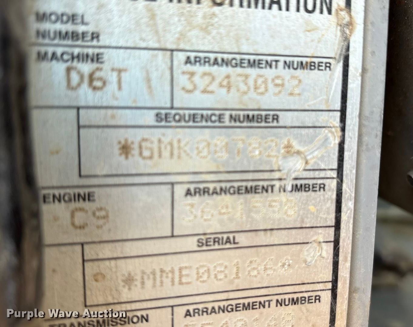 2012 Caterpillar D6T dozer. Hours: 14,834 on meter, Serial: CAT00D6TAGMK00782, Unit #: 10256340. Engine Caterpillar C9, Serial: MME08186, Displacement: 8.8L, Cylinders: 6, Fuel type: Diesel. Transmission Powershift, 3F - 3R. Operators station Enclosed cab, AC, Heat, Electronic Monitoring System panel, Steering: Joystick. Features Screen guards, Sweeps, Dozer blade Blade type: Single-tilt, Blade shape: Semi-U, Width: 127", Attachments Ripper Caterpillar D6, Serial: 1EH006483, Shanks: 3.. Tracks Width: 24", Grouser pads: Single, Bottom rollers: 7, Track guards. Notes Key not included, Possible blade issues, loose, Possible hydraulic issues, slow to engage blade, Right track sprocket segment missing, Possible sprocket segment bolt issues, stripped. Construction inventory reduction, stored at a secured facility. Please review REQUIRED REMOVAL INSTRUCTIONS. RG. Wilmer, TX 75172