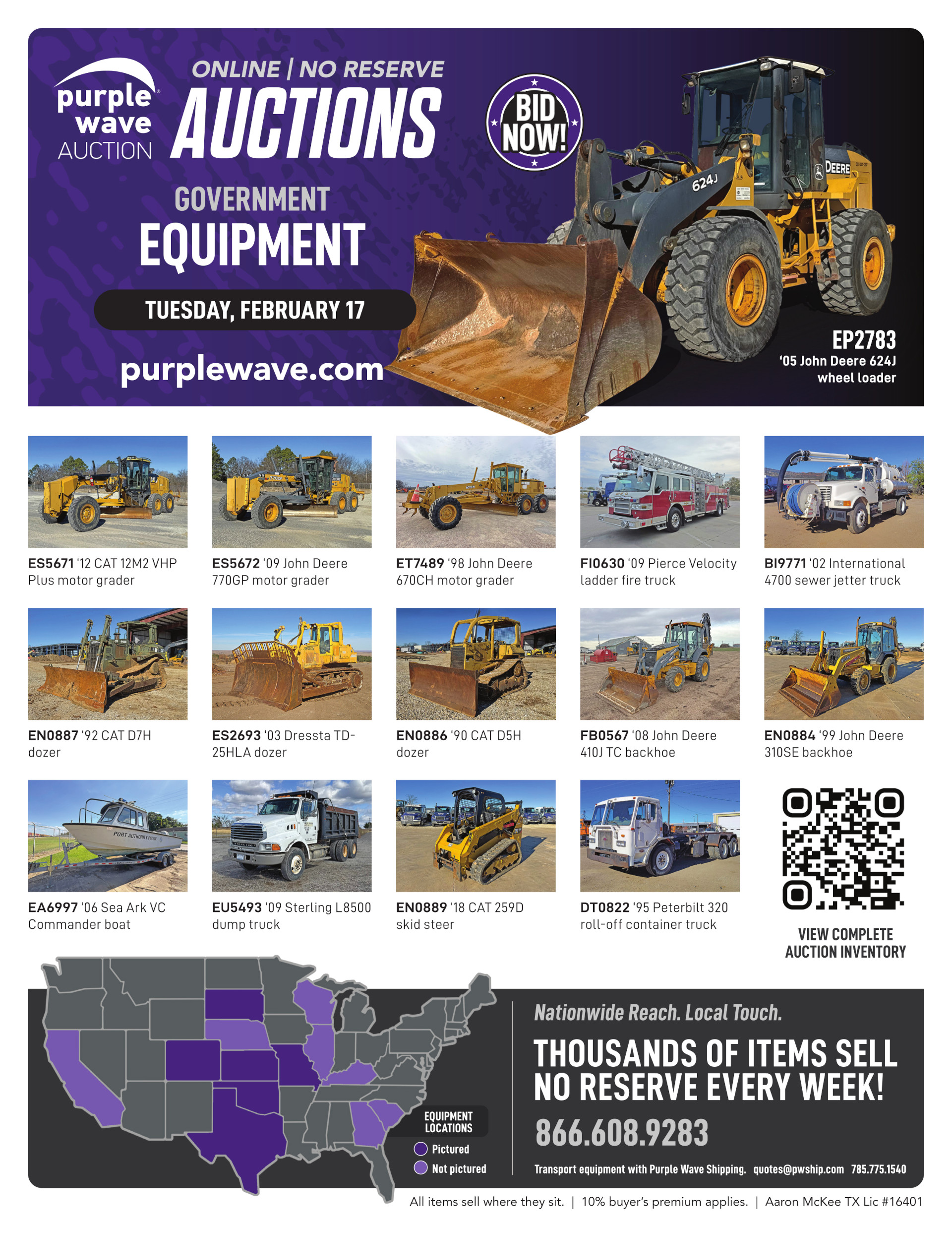 Purple Wave attempts to give its customers an industry leading experience by providing detailed equipment listings. Listings include written descriptions, photographs, location, and consignor information. Equipment descriptions are based on our direct observation and information provided by our selling customer. All information is intended to be as accurate as possible. However, we recommend customers inspect prior to bidding. Purple Wave listings are not intended to be substitutions for inspection. The details provided may differ on equipment based on information provided by the consignor. An error or omission in the listing will not change the results of the bid. It is the responsibility of the buyer to conduct any inspection and examination necessary to satisfy the buyer of all material facts before placing a bid. Purple Wave is not responsible for any statements about the item made by the Seller.