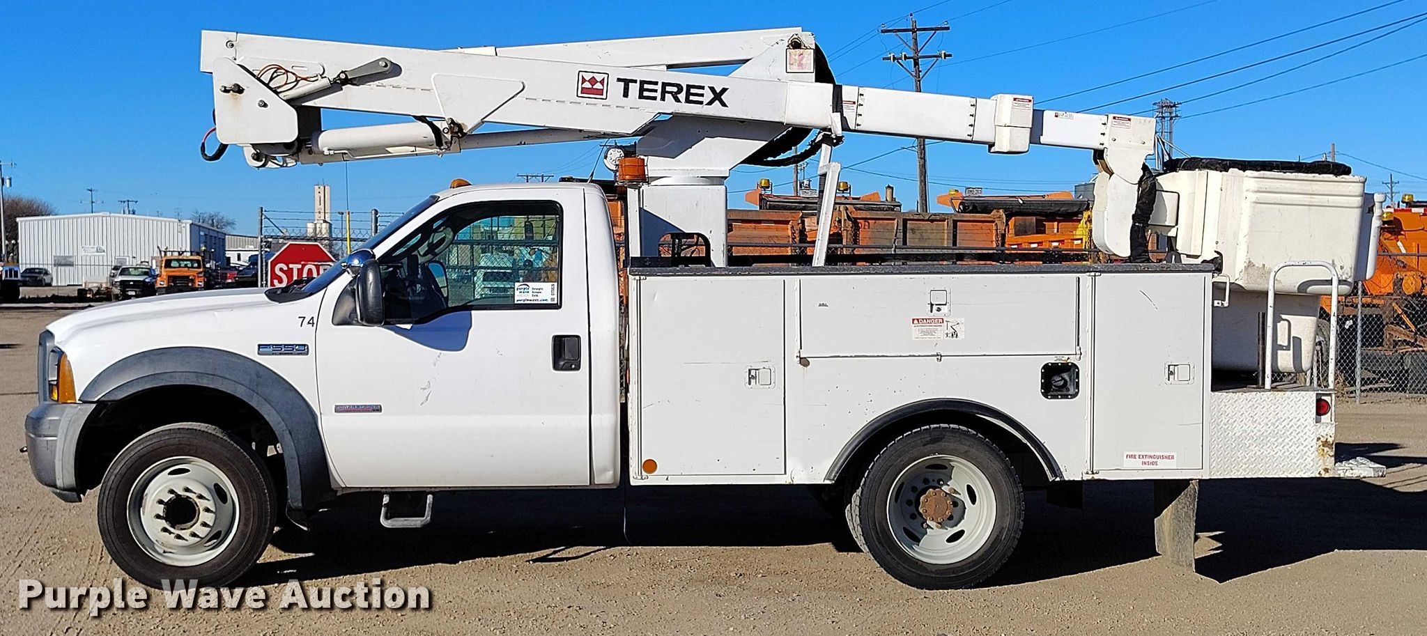 2006 Ford F550 Super Duty bucket truck. Miles: 185,721 on odometer, Hours: 10,000 on meter, VIN: 1FDAF56P96EC84675, Unit #: 74. Engine Ford, Displacement: 6.0L, Cylinders: 8, Fuel type: Diesel. Transmission Automatic. Chassis Axles: Single, Suspension: Spring, Brakes: Hydraulic, PTO, GVWR: 17,950 lbs. Interior AC, Heat, Auxiliary controls. Features Bed Utility bed, Terex IN, Serial: 11636, Length: 11' 9", Width: 94", Boom 2006 Terrex HI Ranger TL 38P, Serial: 2060329511, Maximum lift capacity: 300 lbs, Maximum lift height: 38', Boom type: Articulating, Insulated, Telescopic, Man basket, Boom controls Ground, Platform/ basket.. Tires Size: 225/70R19.5. Notes Dash warning indicator: Airbag, Unknown operating condition of boom, Boom damage. Colorado title. Title distribution may be delayed up to 30 days from verification of funds. City of Lamar. 103 North 2nd Street. Lamar, CO 81052