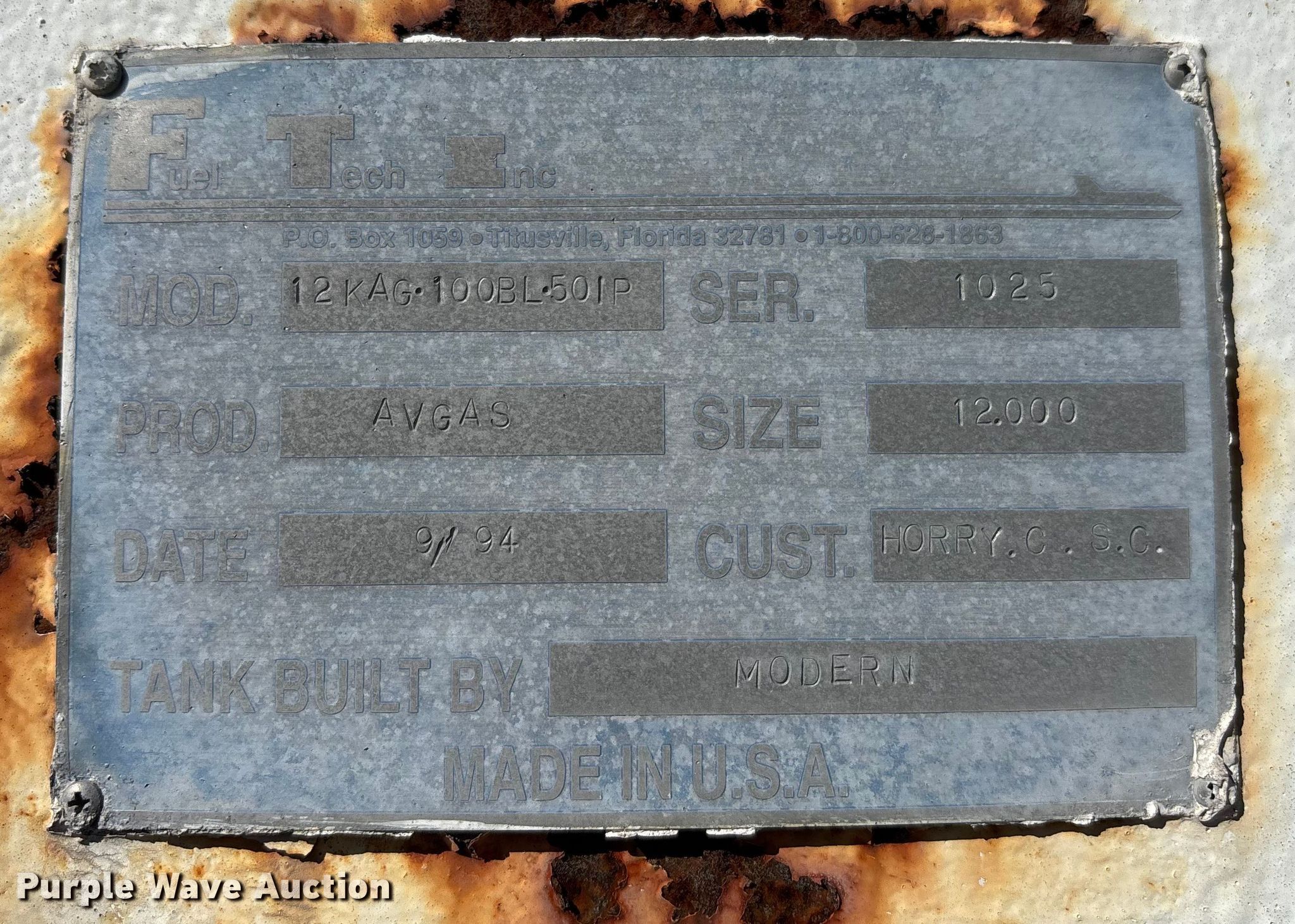 Purple Wave is selling a used Fuel and Lube in South Carolina. This item is a 1994 FTI 12KAG-100BL 50IP fuel tank with the following: Serial: 1025, Capacity: 12,000 gallons, Fuel pump