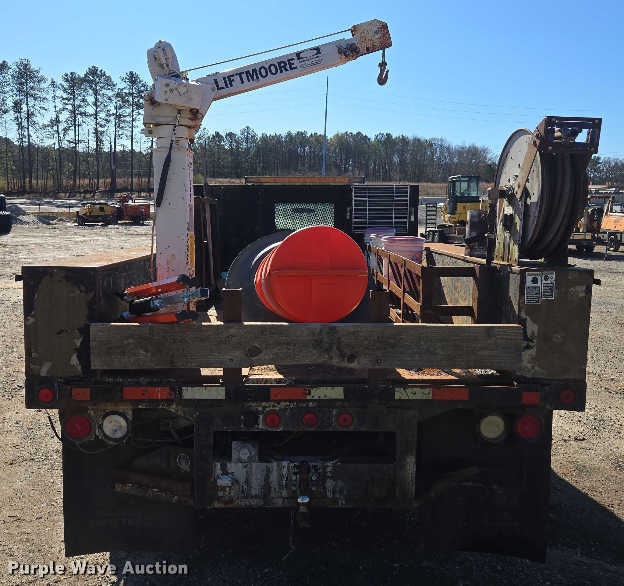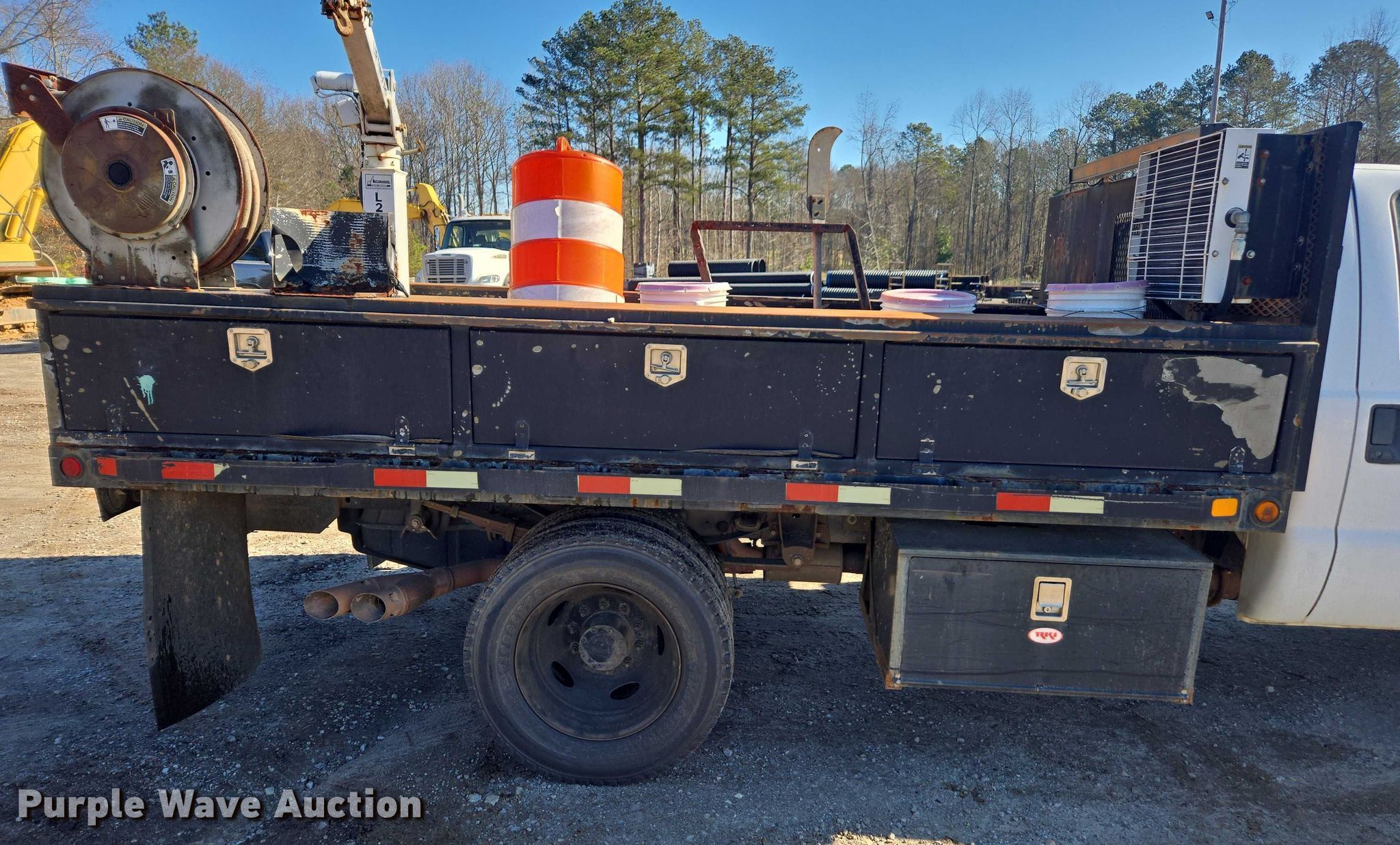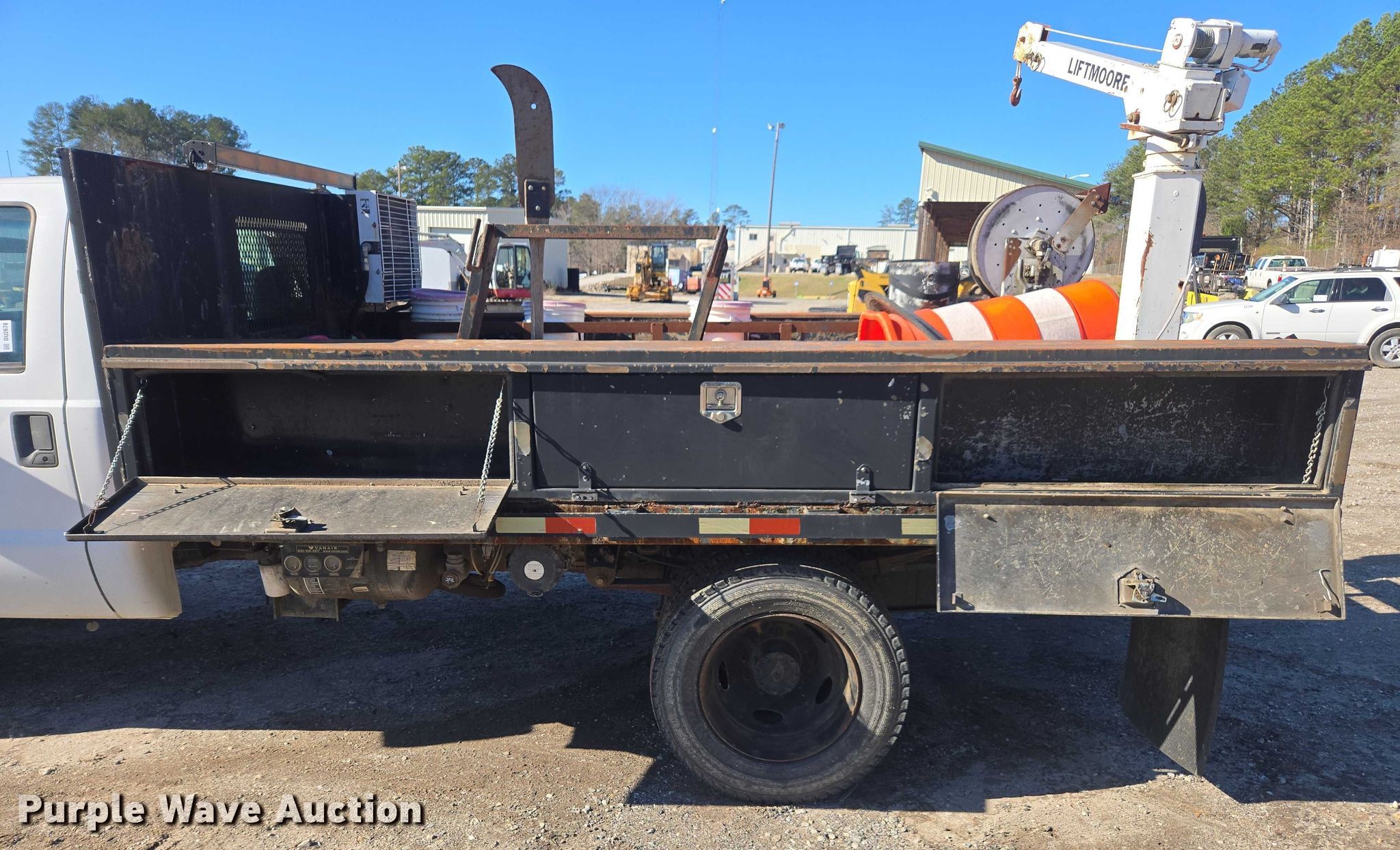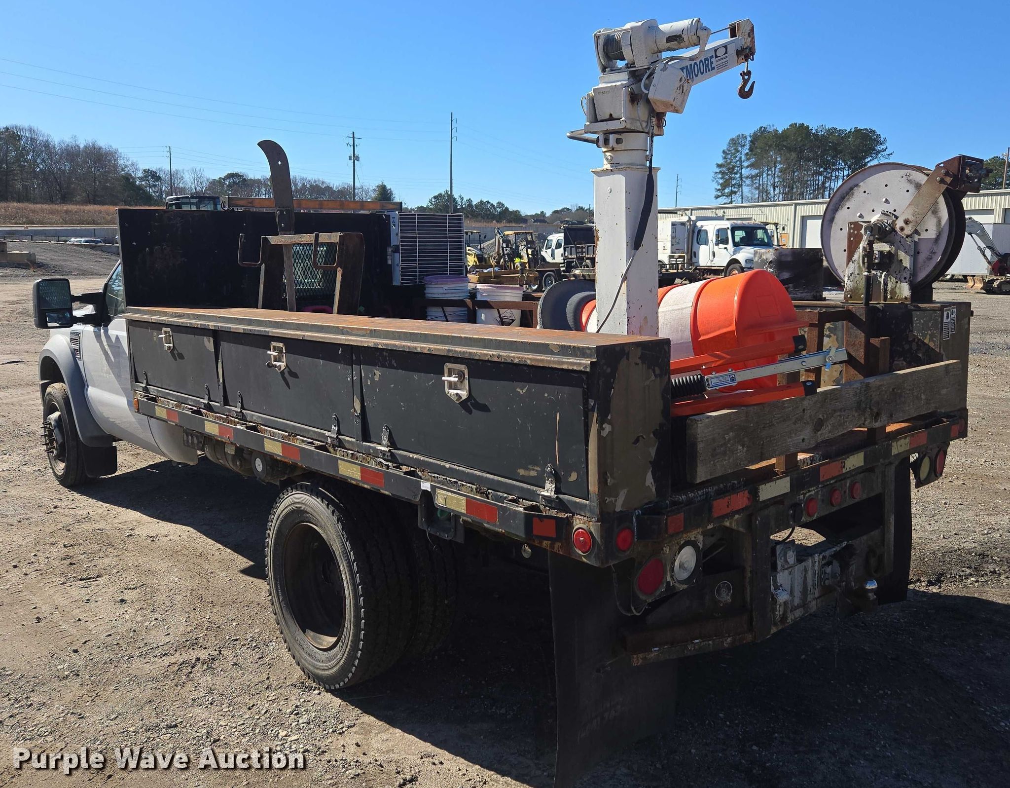 2008 Ford F450 Super Duty XL flatbed truck. Miles: 92,098 on odometer, VIN: 1FDXF46R98EC82658, Unit #: 1882. Engine Powerstroke, Displacement: 6.4L, Cylinders: 8, Fuel type: Diesel. Transmission Automatic. Chassis Axles: Single, Suspension: Spring, Brakes: Hydraulic, PTO, GVWR: 16,000 lbs. Interior AC, Heat, Auxiliary controls. Features Bed Flatbed, Fontaine 12311, Serial: 1298P474911, Length: 12', Liftmoore crane Model: L-21, Serial: Z105R11. Tires Size: 245/70R19.5. Notes Bed contents will be removed prior to auction, Dash warning indicator: Check engine, Jump start required during on-site data collection. Georgia title. Title distribution may be delayed up to 14 days from verification of funds. Clayton County Water Authority. 7340 Southlake Parkway. Morrow, GA 30260