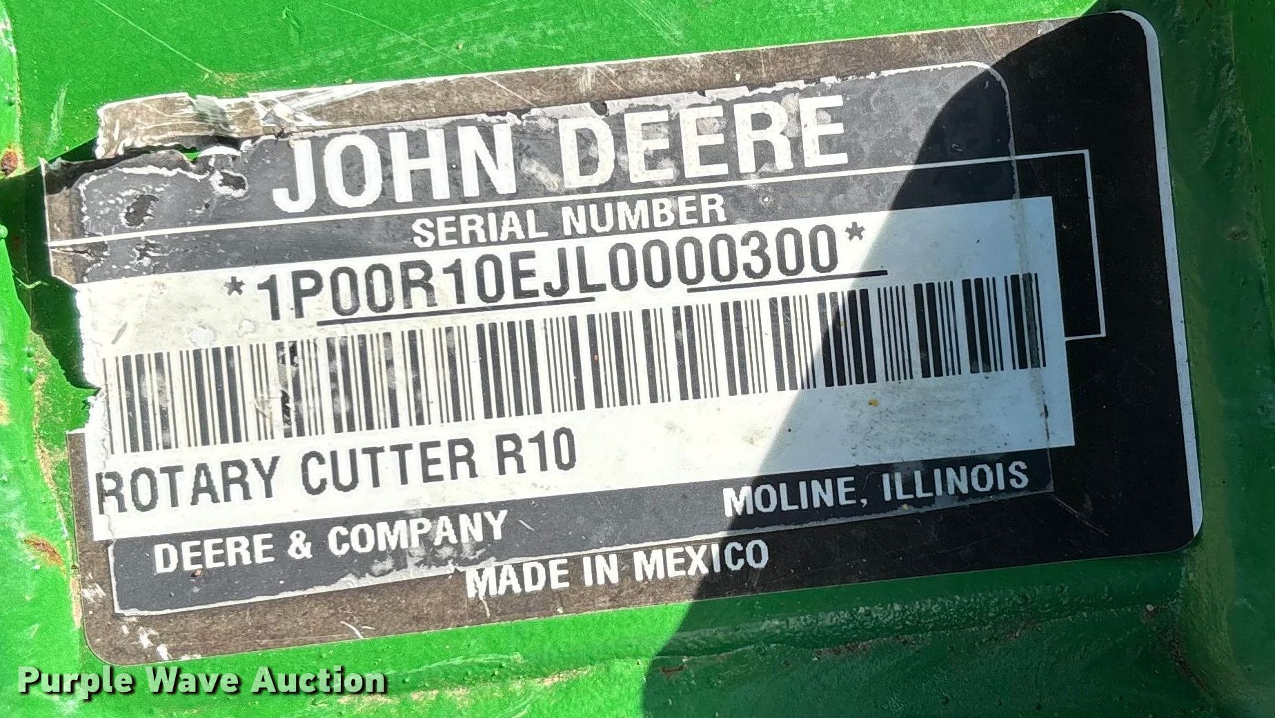 John Deere R10 batwing rotary mower. Serial: 1P00R10EJL0000300. Features Width: 12', Hydraulic lift, Hydraulic fold, PTO: 540. Tires Size: 26x9-14.5. Todd County, KY. Elkton, KY 42220