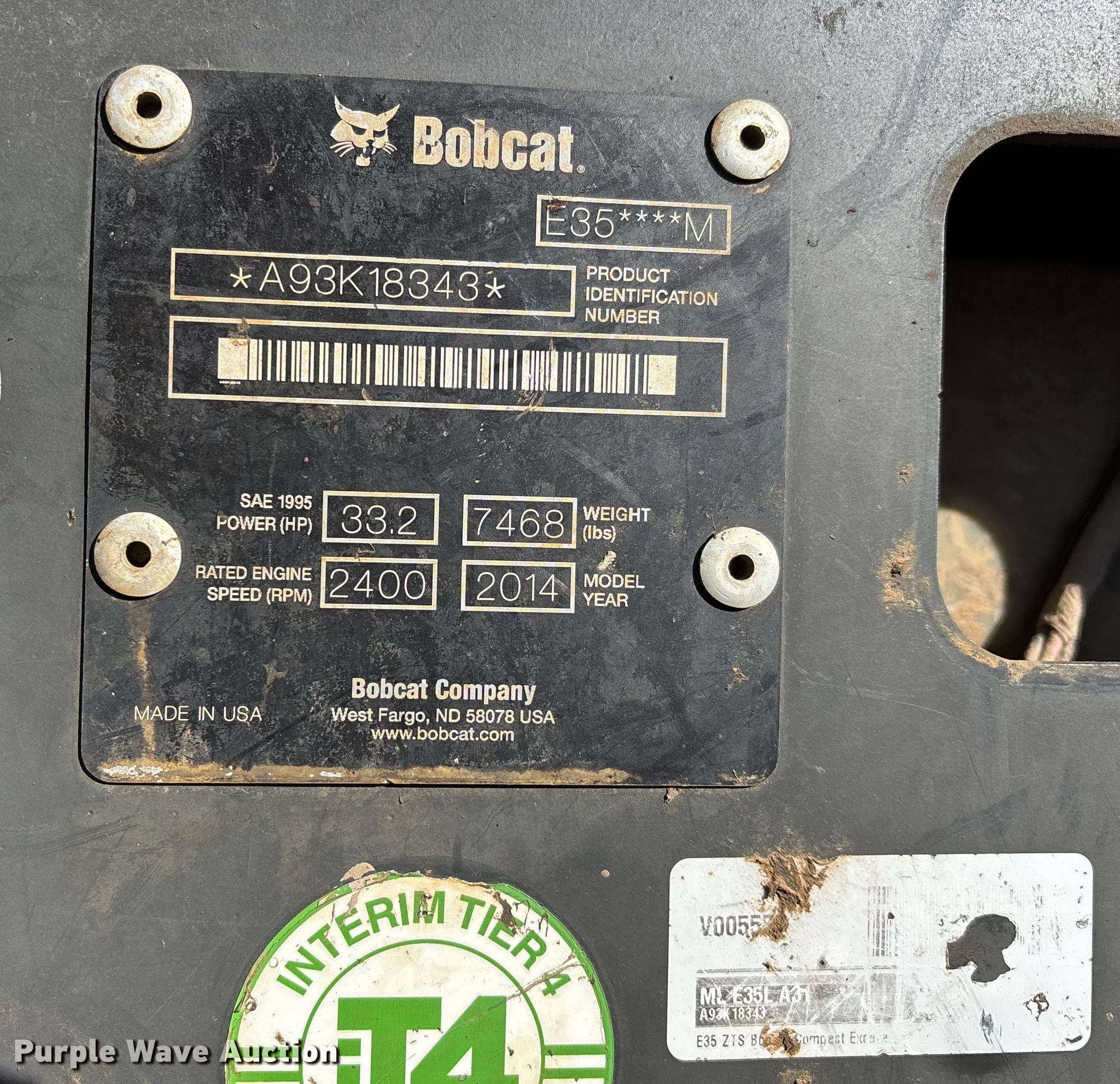 Purple Wave is selling a used Mini Excavator in Missouri. This item is a 2014 Bobcat E35 mini excavator with the following: Hours: 3,613 on meter, Serial: A93K18343