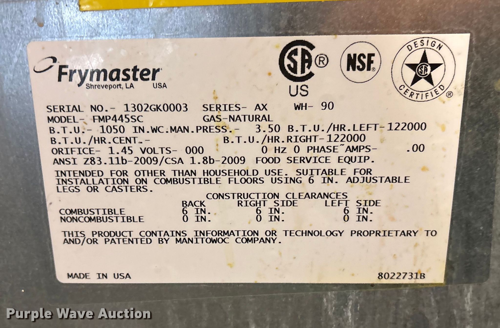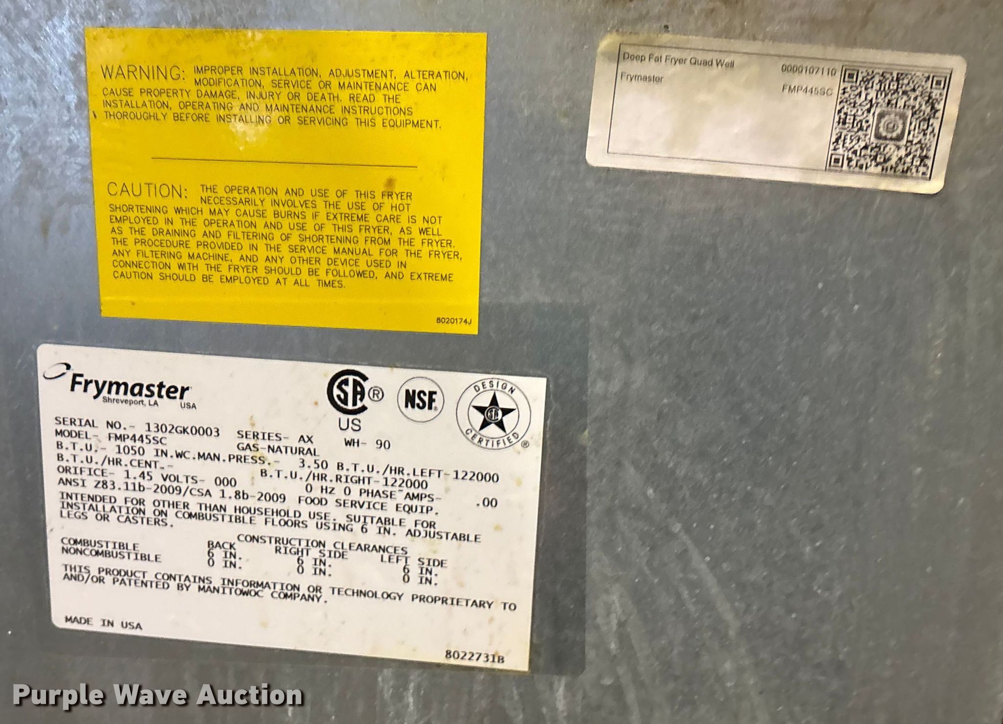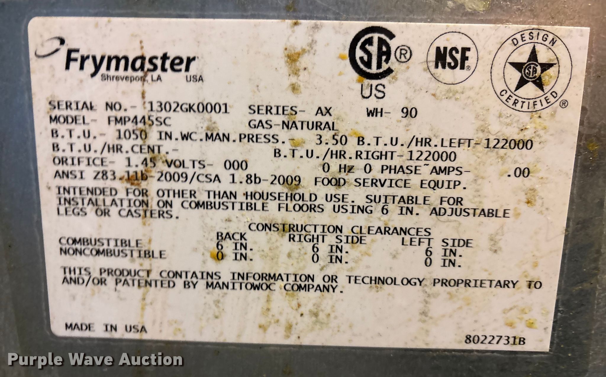 Purple Wave is selling a used Restaurant Equip. in Nebraska. This item is a Frymaster FMP445SC fryer with the following: Serial: 1302GK0001, Fuel type: Natural gas, 6' 6" L x 31.5" W x 48" H