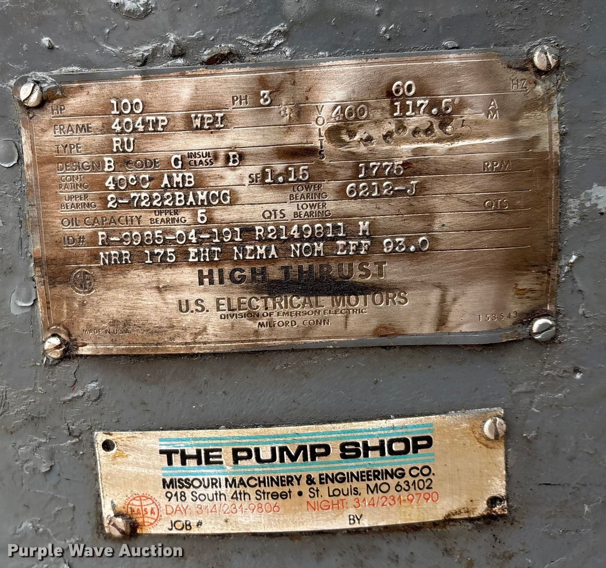 Purple Wave is selling a used Electric Motor in Missouri. This item is a U. S. Electrical Motors motor with the following: Electric, HZ: 60, HP: 100, PH: 3, Volts: 460