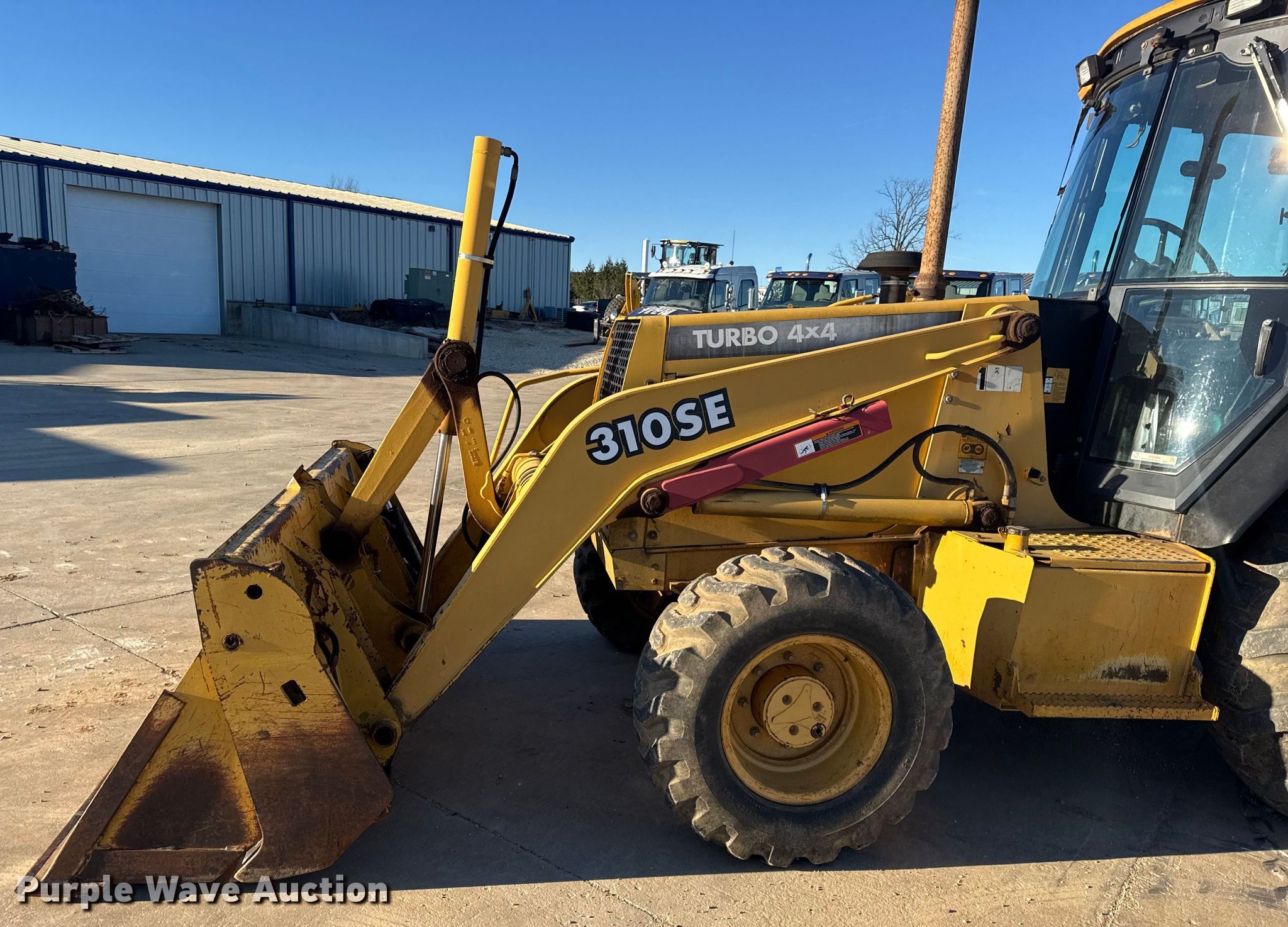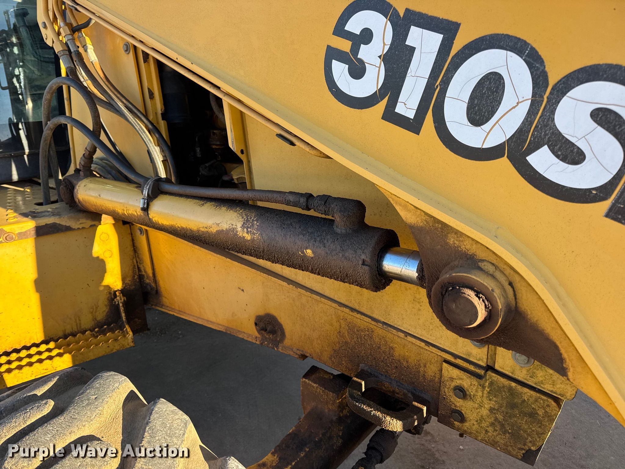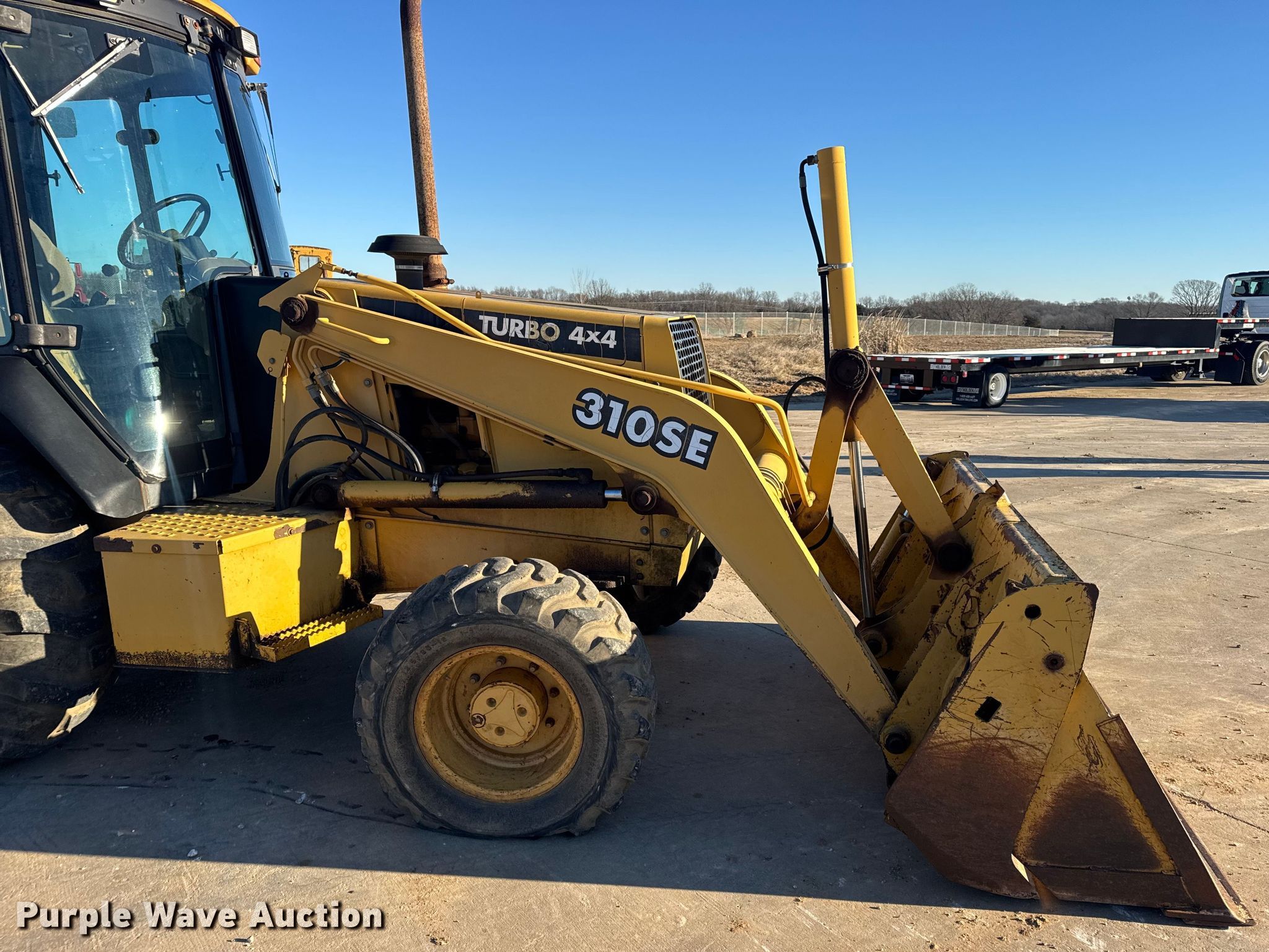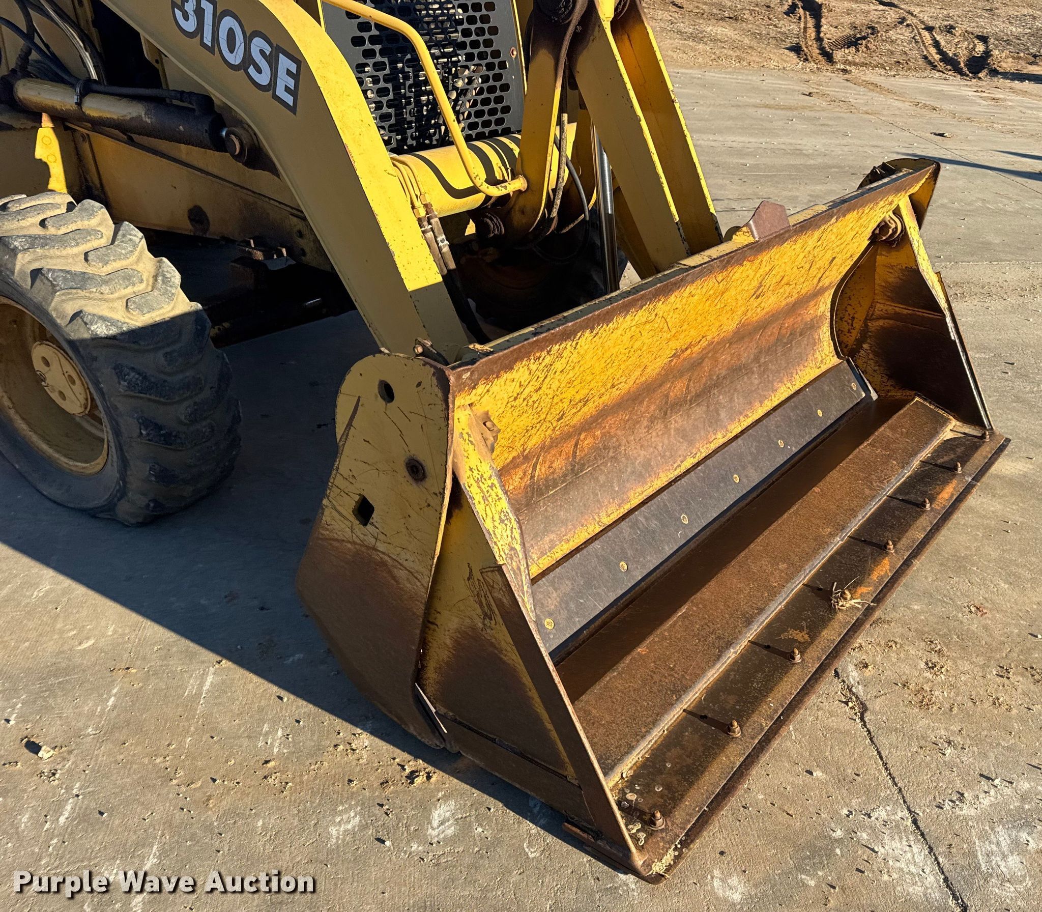 1999 John Deere 310SE backhoe. Hours: 10,767 on meter, Serial: T0310SE880144. Engine John Deere 4045TT050, Displacement: 4.5L, Cylinders: 4, Fuel type: Diesel. Transmission Shuttle shift. Chassis Four wheel drive, Differential lock. Operators station Enclosed cab, AC, Heat, Backhoe controls: Wobble stick / two stick. Features Loader Bucket John Deere AT175047, Four-in-one, Width: 92", Cutting edge: Bolt-on, Backhoe Extendable stick, Bucket Width: 24", Cutting edge: Weld-on, Teeth: 5.. Tires Front: 12.5/80-16, Rear: 19.5L-24. Notes Hydraulic leak, Tires damaged, weather cracking, Front right tire low pressure. LINN State Technical College. Linn, MO 65051