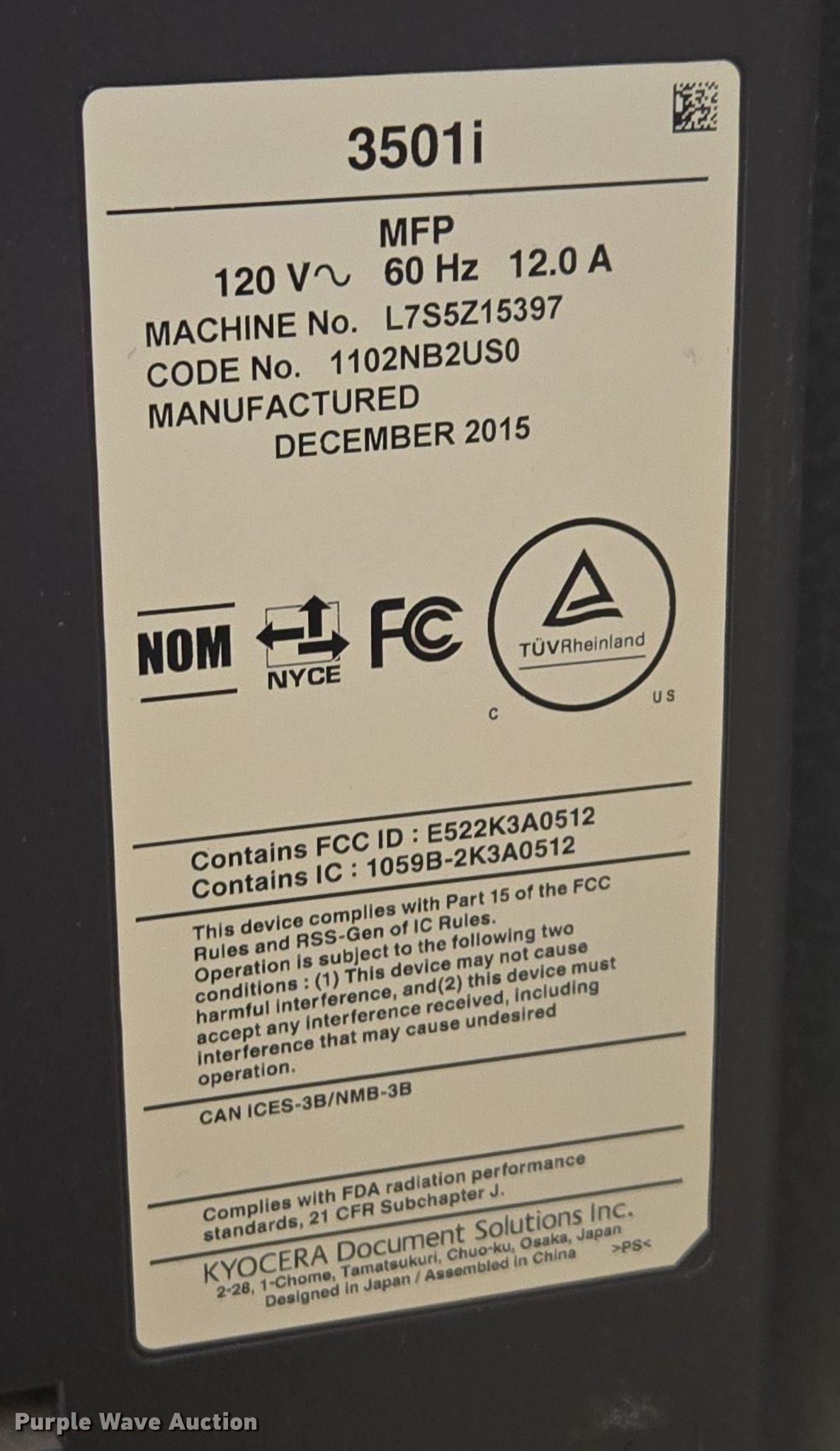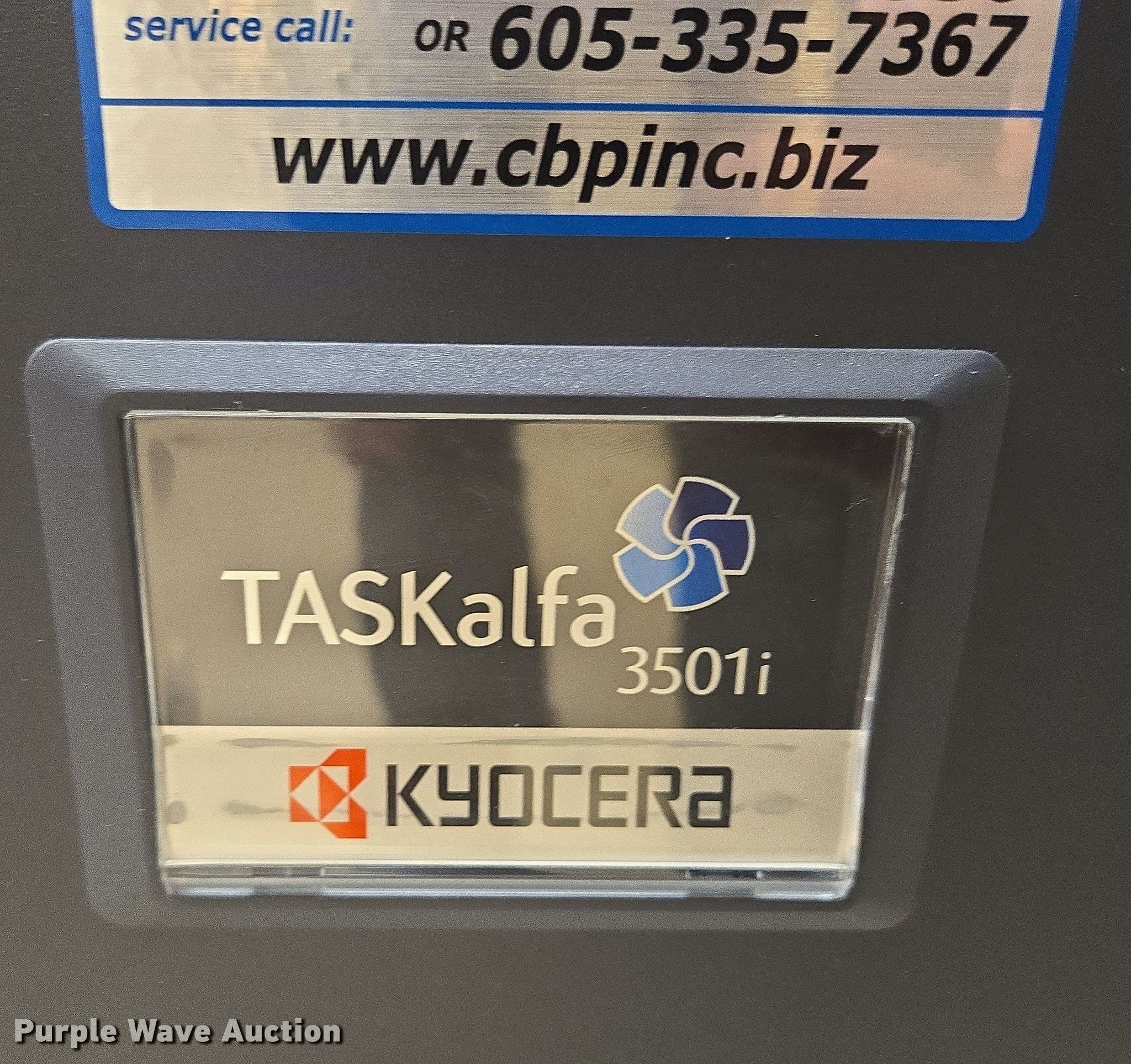 Purple Wave is selling a used Copy or Printing Machine in South Dakota. This item is a Taskalfa 3501i copier with the following: Hard drive/memory removed