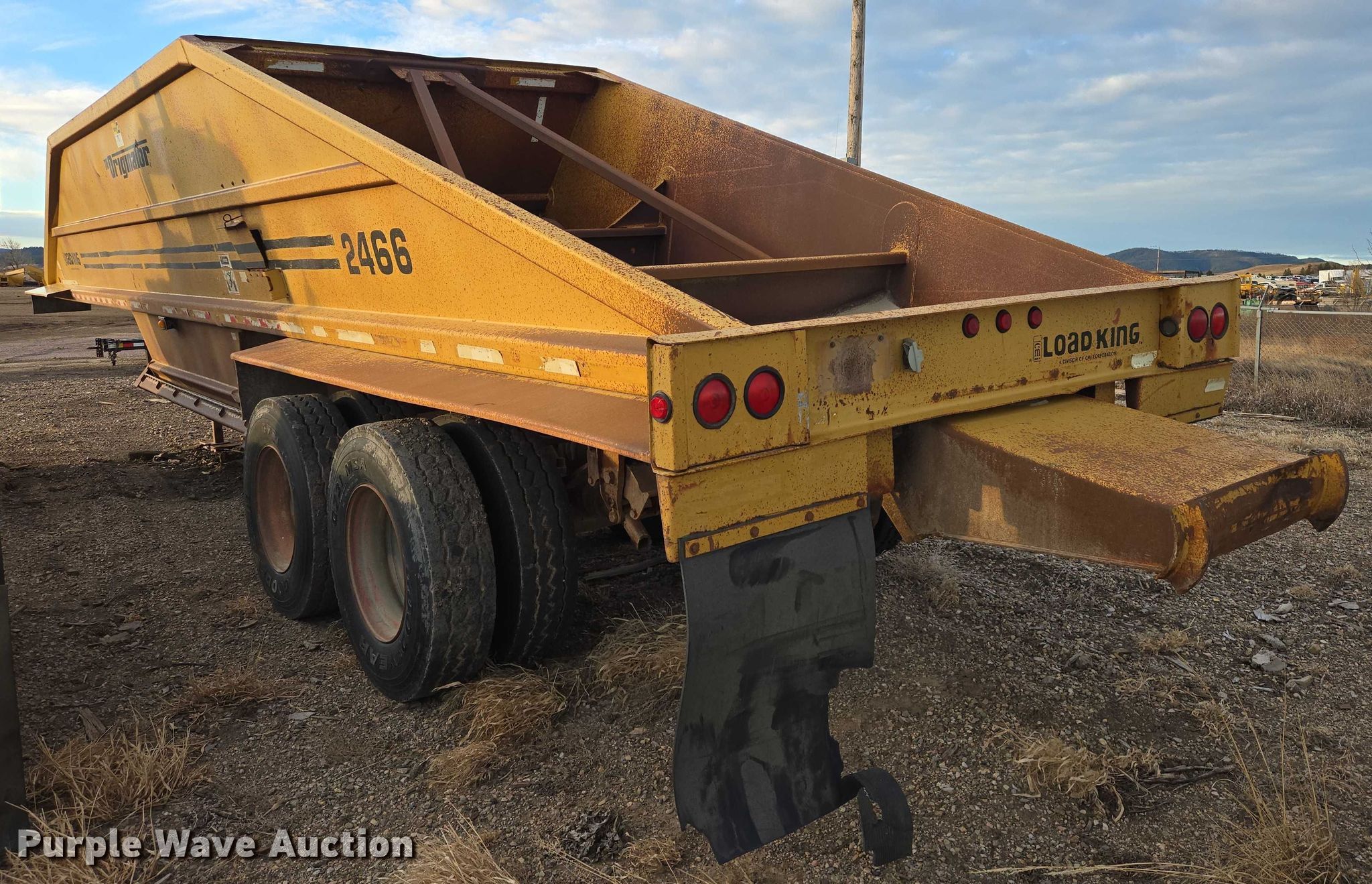 1996 Load King The Originator 2466 bottom dump trailer. VIN: 1B4B43331T4119982. Dimensions Overall Length: 45' 8", Width: 102", Side height: 61". Features Body type: Steel, Poly liner, Rear push block. Chassis Landing gear: Dual, Suspension: Spring, Brakes: Air, Axles: Triple. Tires Steel wheels, Size: 11R22.5. Notes Collision damage , Rear axle damaged , Frame damage , Unit must be hauled , Non-operational unit. South Dakota title. Title distribution may be delayed up to 14 days from verification of funds. Meade County. Sturgis, SD 57785