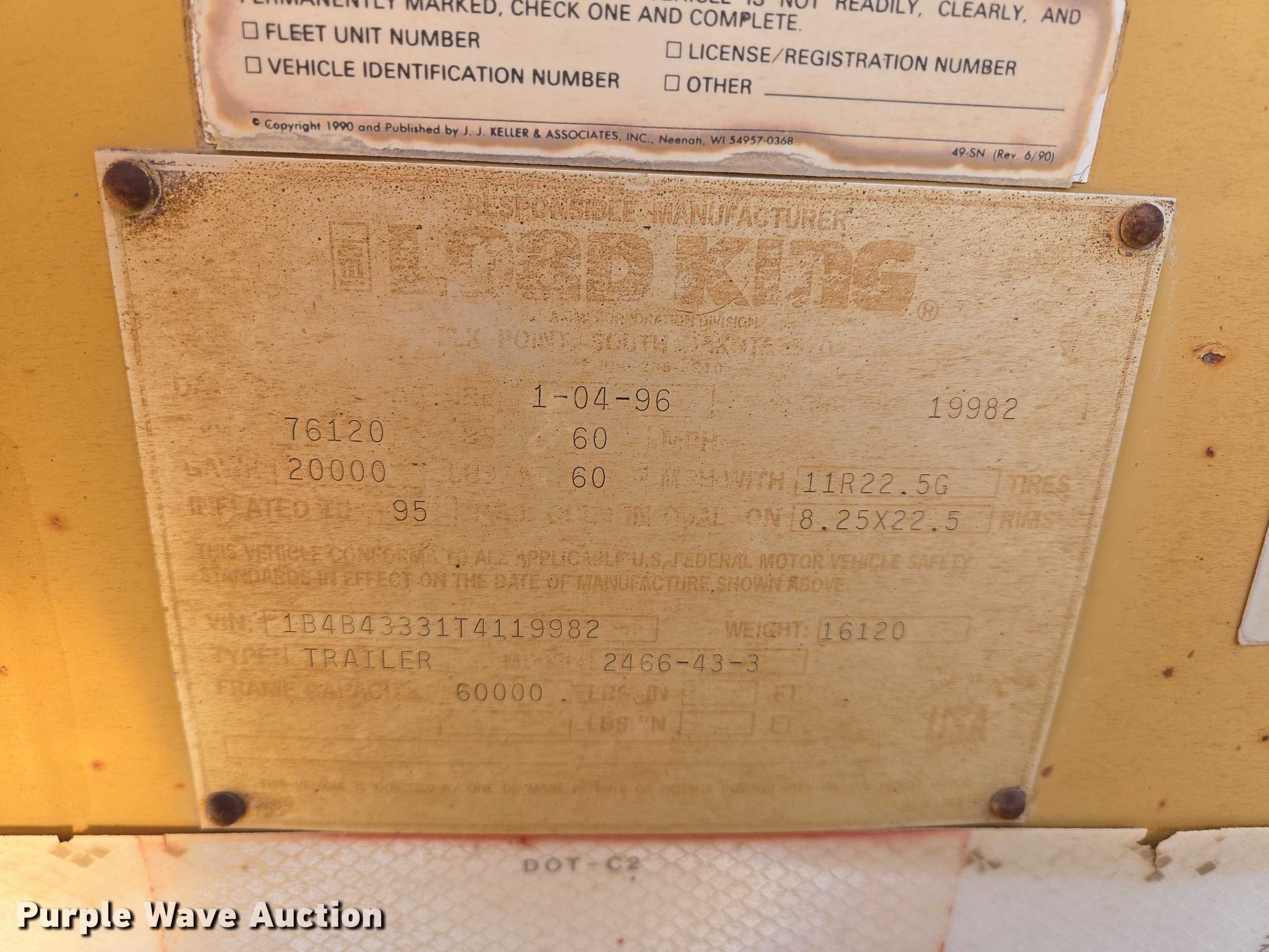 Purple Wave is selling a used Bottom Dump Trailer in South Dakota. This item is a 1996 Load King The Originator 2466 bottom dump trailer with the following: VIN: 1B4B43331T4119982