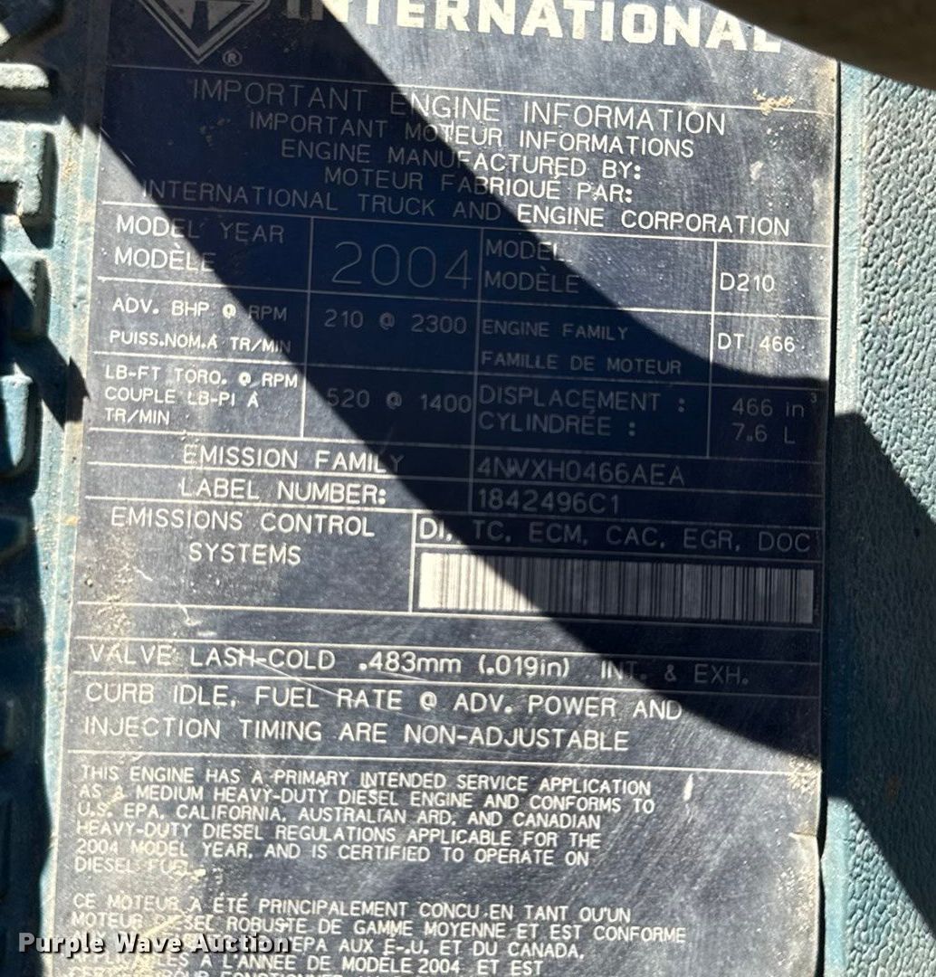 2005 International 7300 Crew Cab flatbed truck. Miles: 126,014 on odometer, Hours: 9,590 on meter, VIN: 1HTWAAAR75J006604, Unit #: 302-134. Engine International D210, Serial: 466HM2U2033282, Displacement: 7.6L, Cylinders: 6, Fuel type: Diesel, HP: 210. Transmission Spicer, Manual, Speed: 7. Chassis Axles: Single, Suspension: Spring, Brakes: Air, PTO, Wheelbase: 207". Interior AC, Heat, Heated mirrors, Cruise control, Auxiliary controls. Features Bed Utility bed, Length: 12' 2", Width: 96", Torch bottle rack, Crane Auto Crane 4004EH, Maximum boom length: 16' Maximum lift capacity: 4,000 lbs.. Tires Size: 11R22.5. Notes CB radio not included, Dash warning indicator: Fuel filter, Windshield chipped or cracked, Power steering pump issues, leaks. Oklahoma title. Title distribution may be delayed up to 14 days from verification of funds. Hughes County, OK. Wetumka, OK 74883