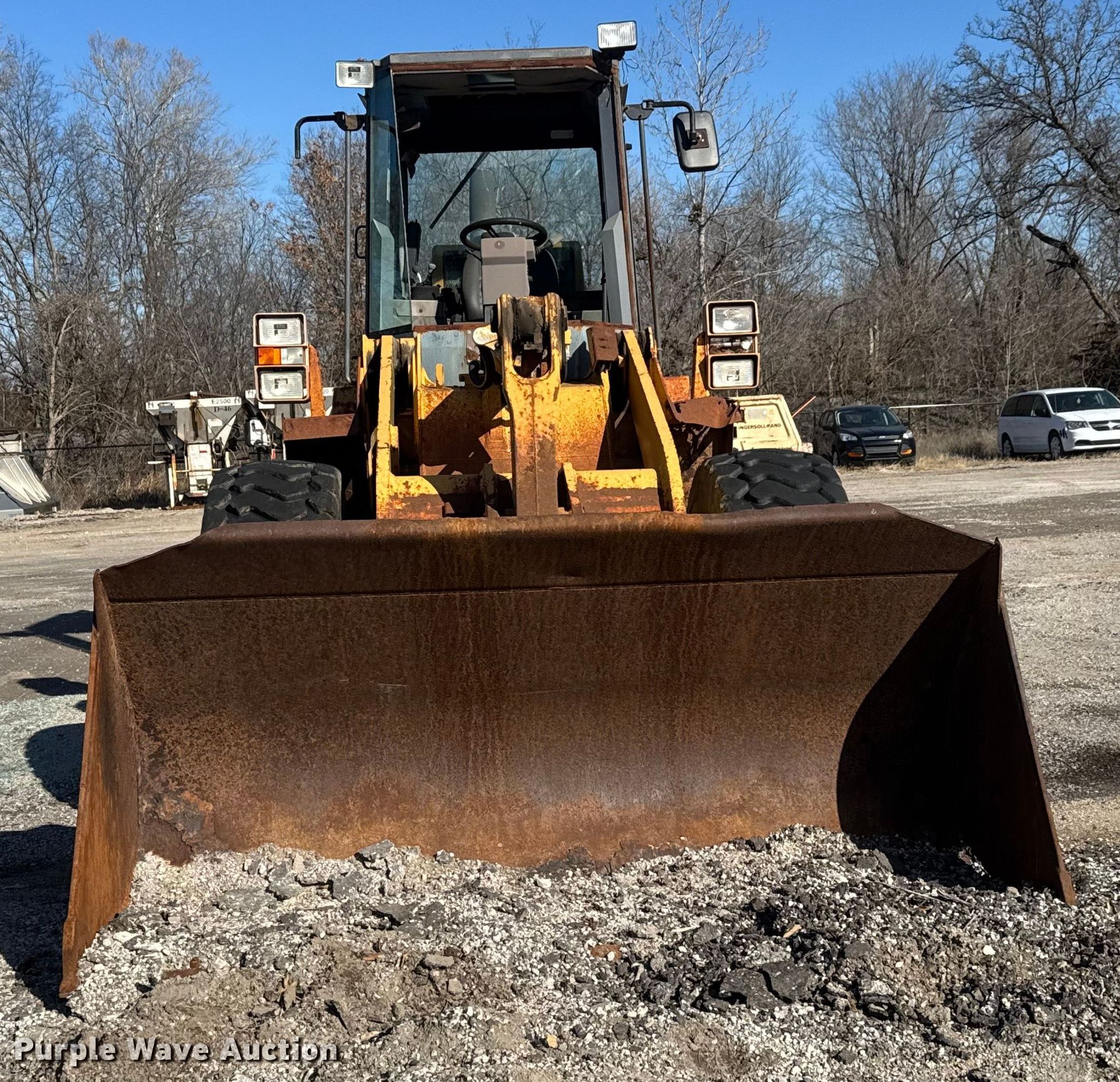 1997 Case 621B wheel loader. Hours: Unknown, Serial: JEE0054397, Unit #: WL-13-97. Engine Case 6T-590, Serial: 45562534, Displacement: 5.9L, Cylinders: 6, Fuel type: Diesel. Transmission Powershift, 4F - 3R. Operators station Enclosed cab, AC, Heat, Bucket controls: Two-lever. Features Bucket Width: 102", Cutting edge: Bolt-on. Tires Size: 20.5R25. Notes Dead battery, Cab glass missing, Rust damage, holes, Flat tires, Unknown operating condition. Oak Grove, MO 64075