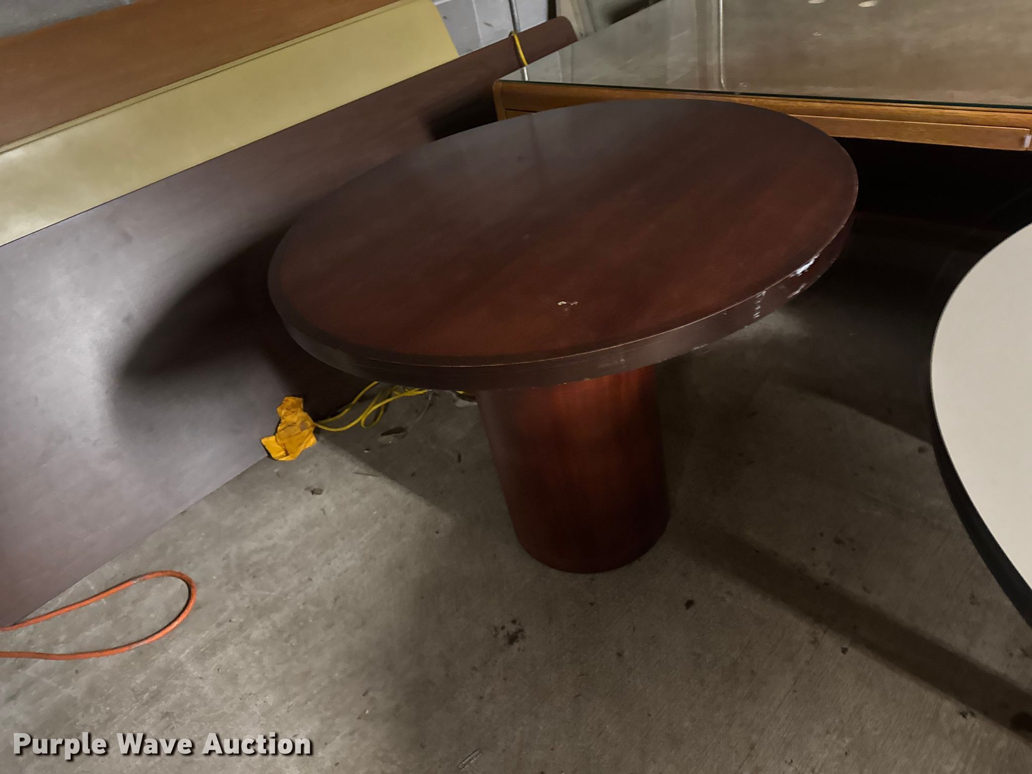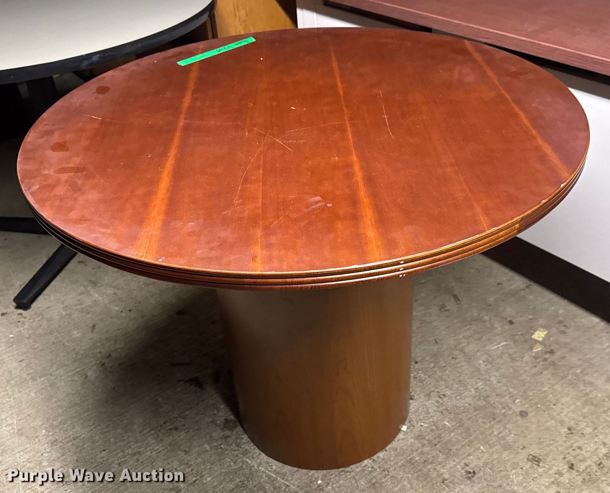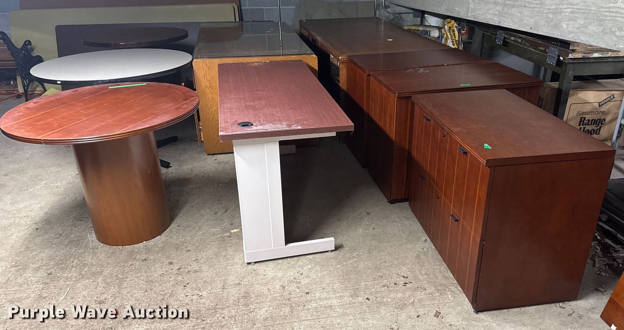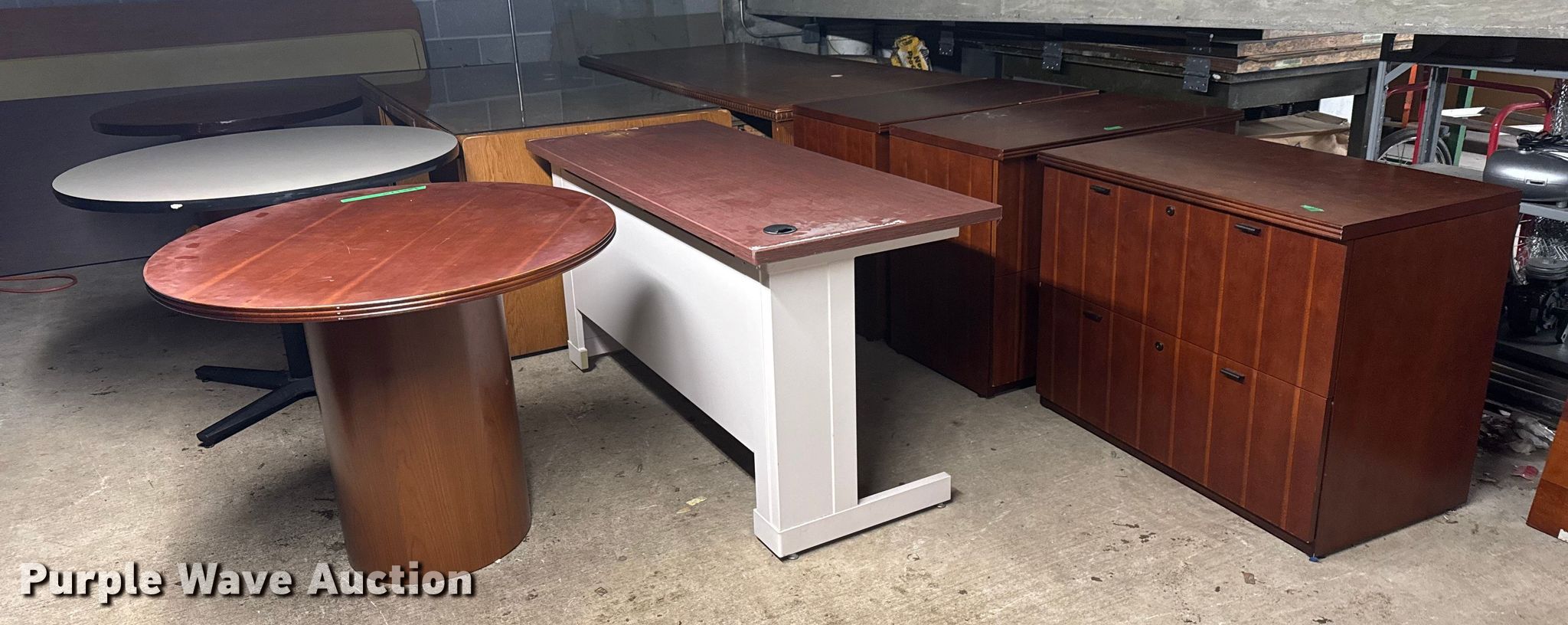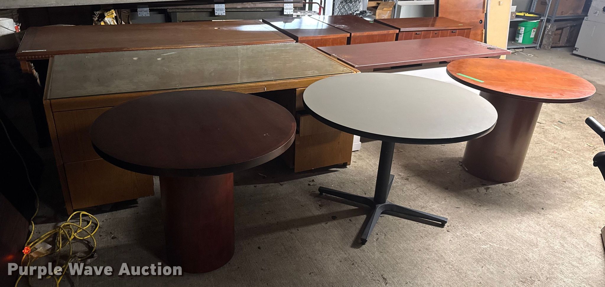 Purple Wave is selling a used Furniture in Kansas. This item is a Office furniture with the following: 3 round tables, 3 desks, 3 file cabinets