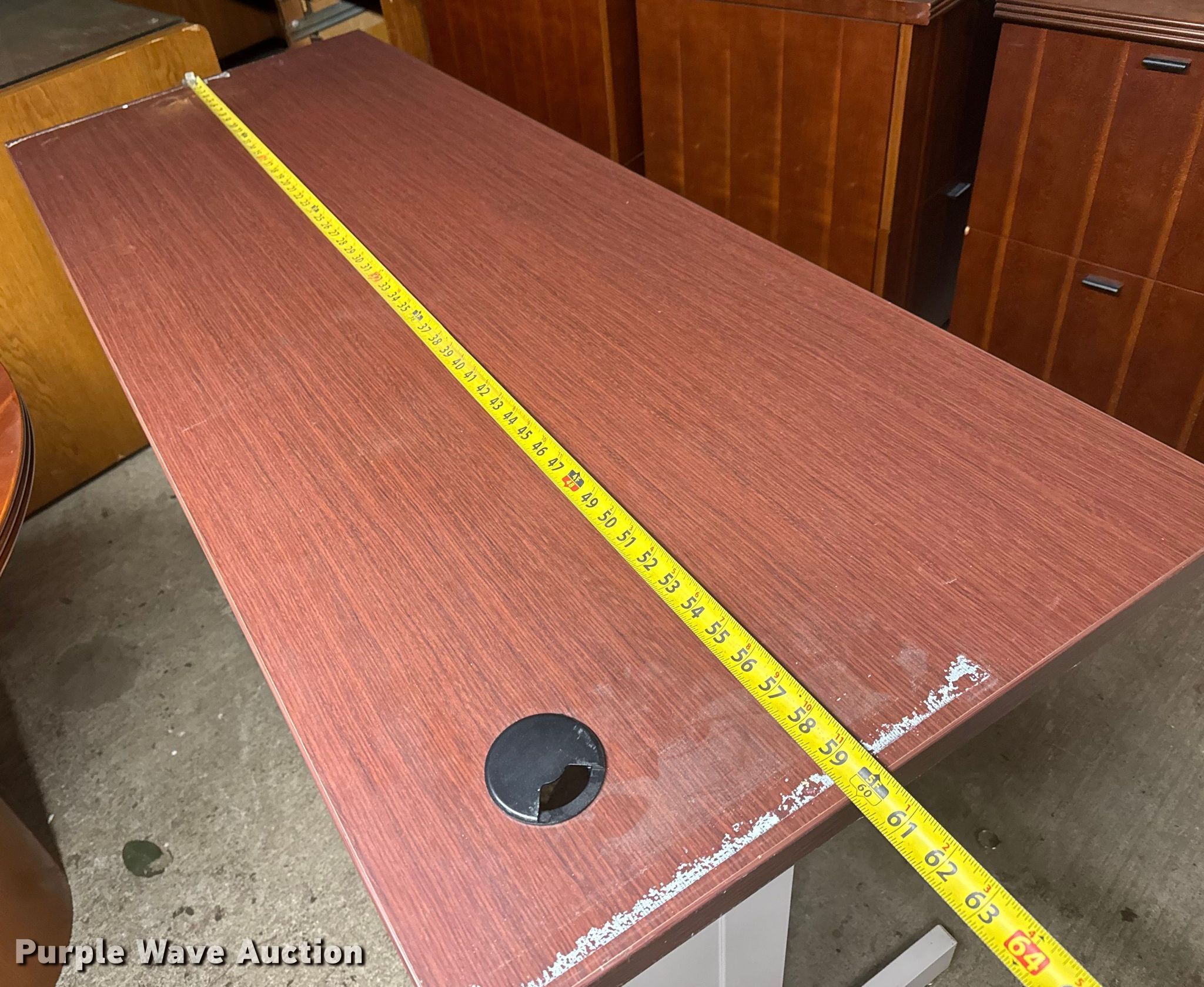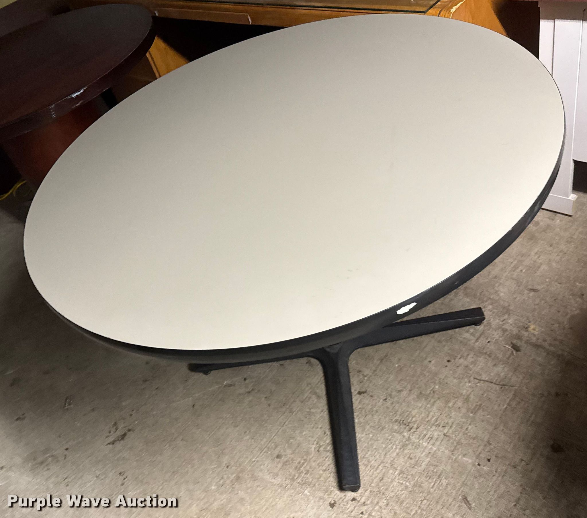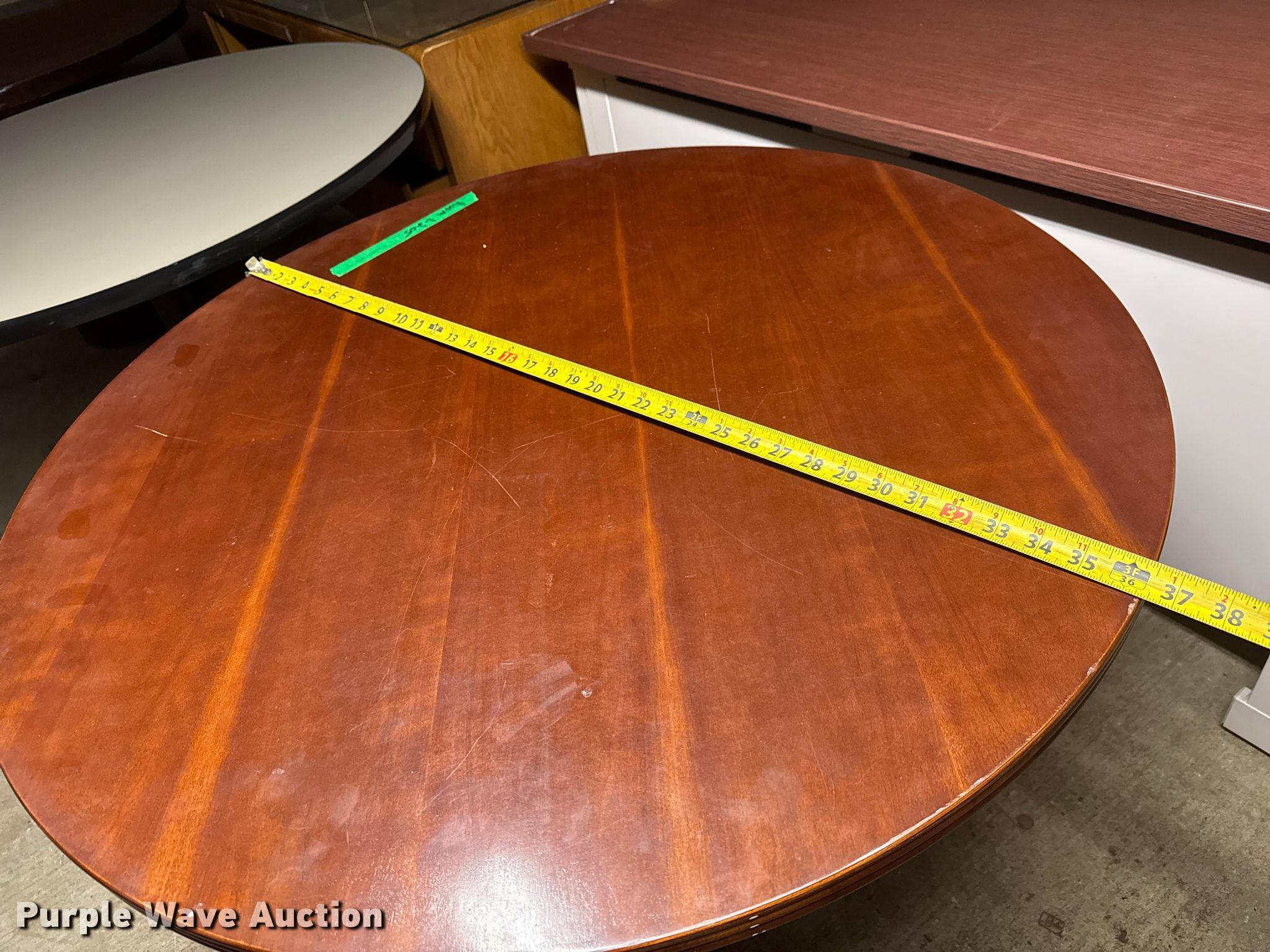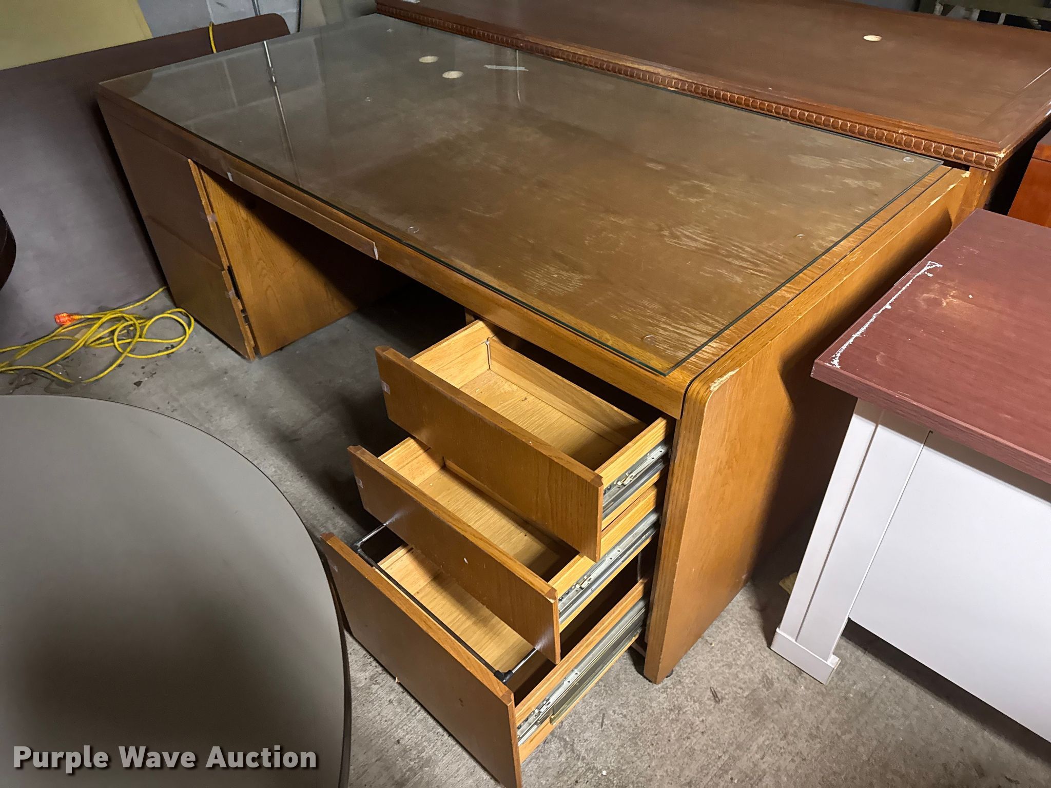 Purple Wave is selling a used Furniture in Kansas. This item is a Office furniture with the following: 3 round tables, 3 desks, 3 file cabinets