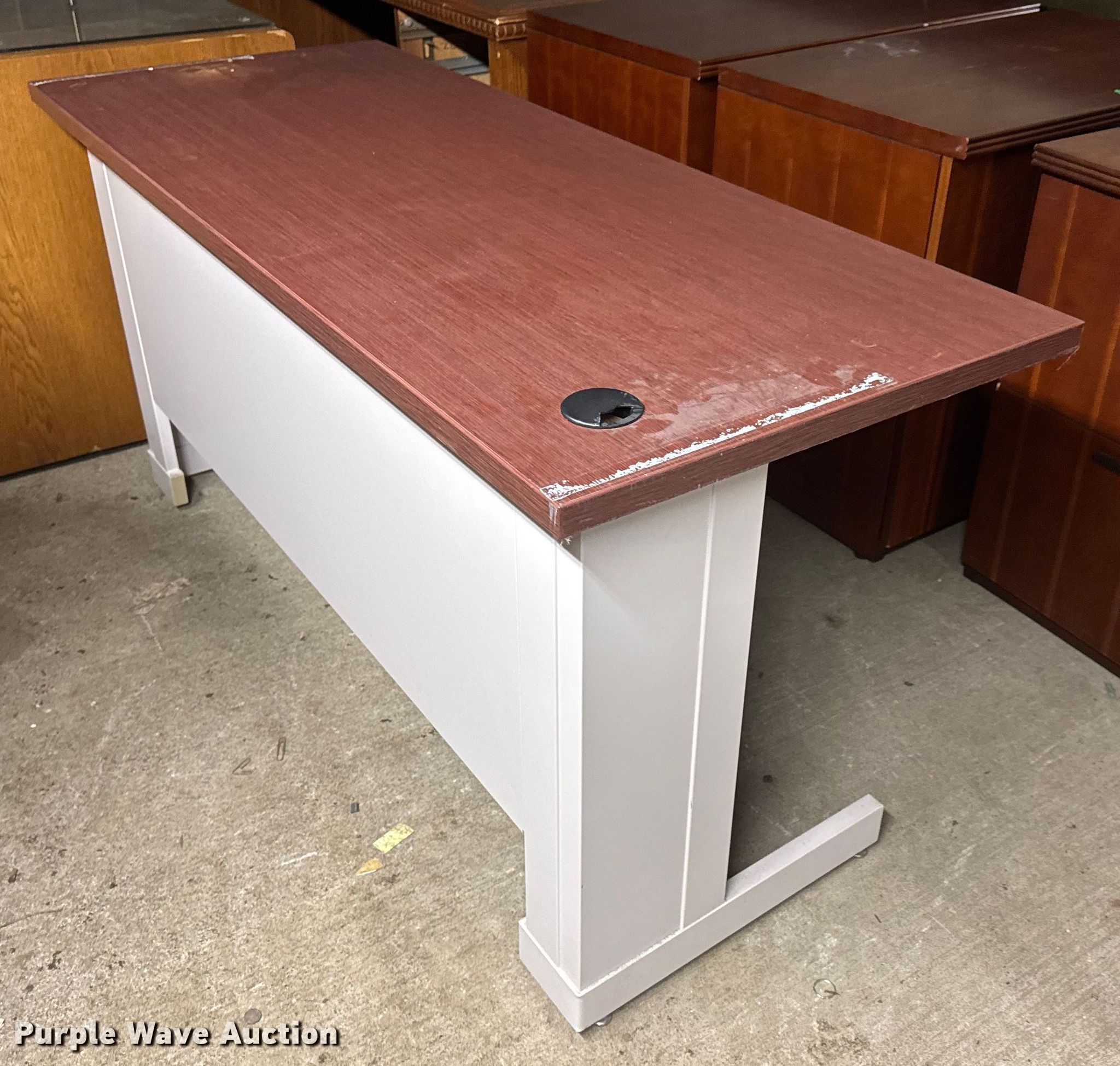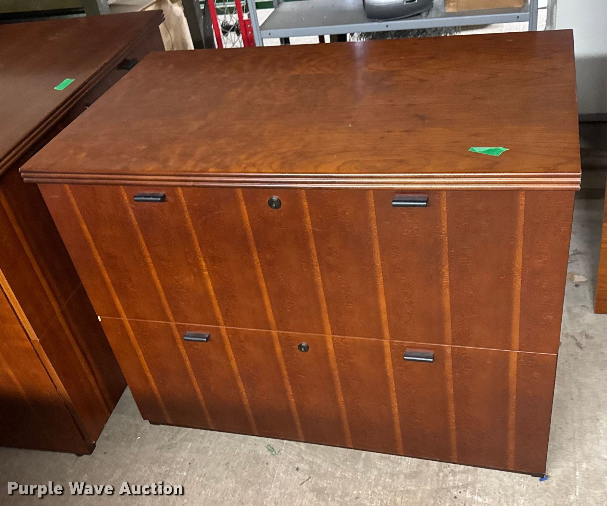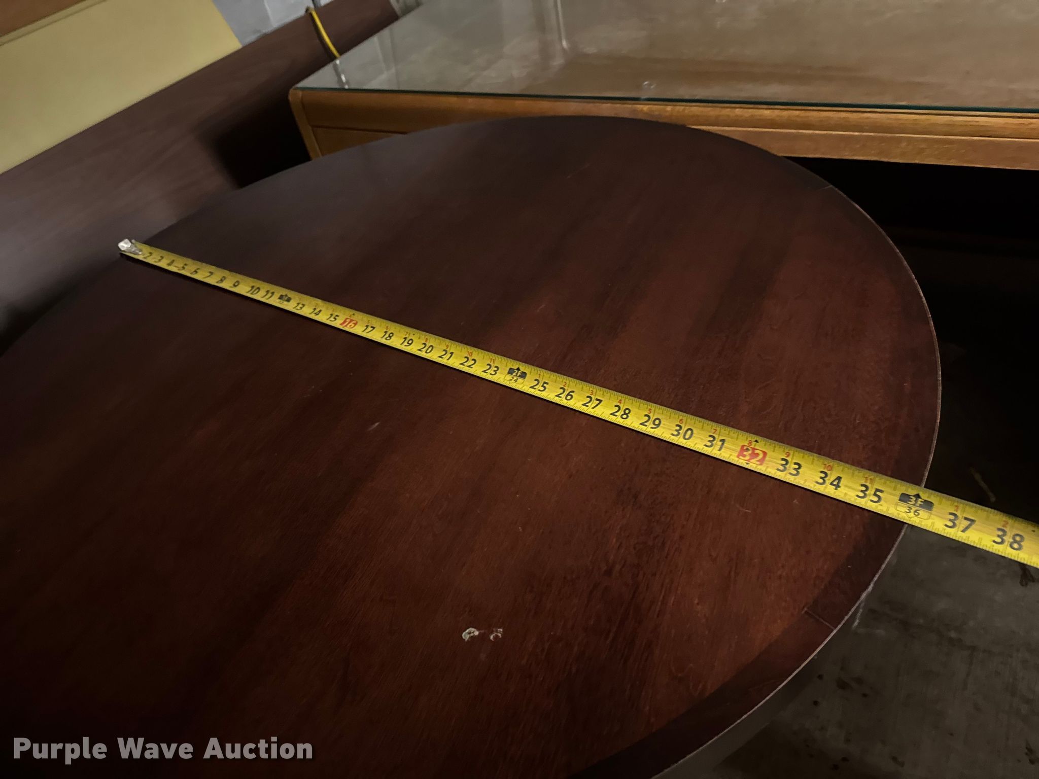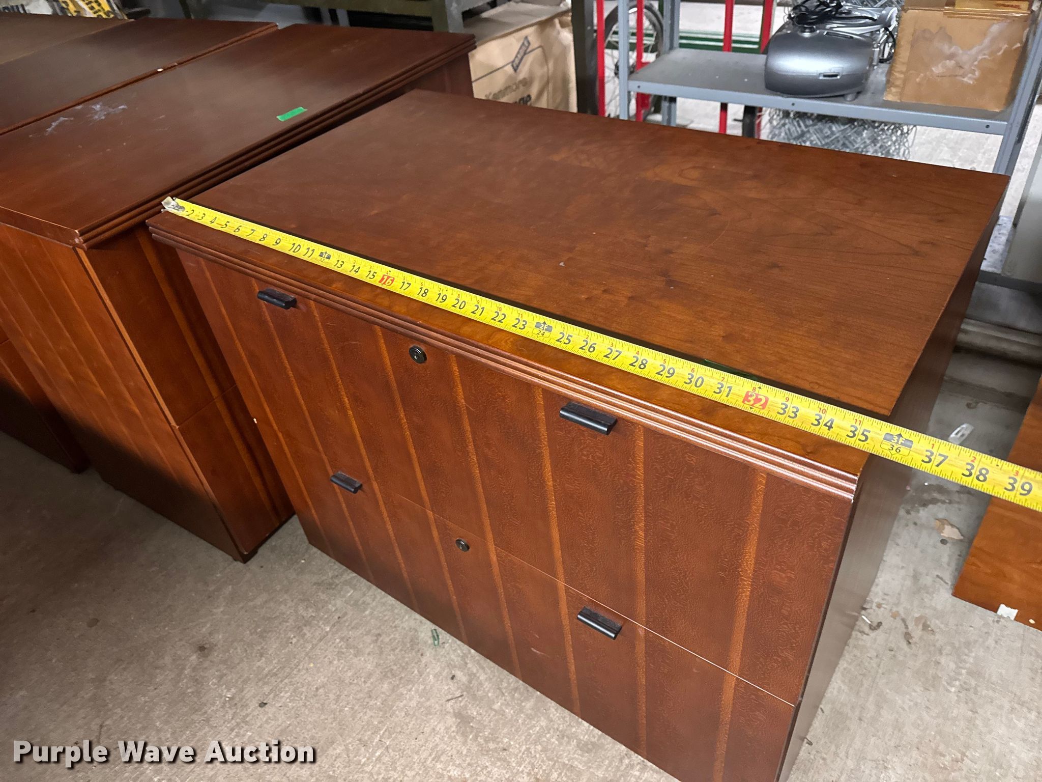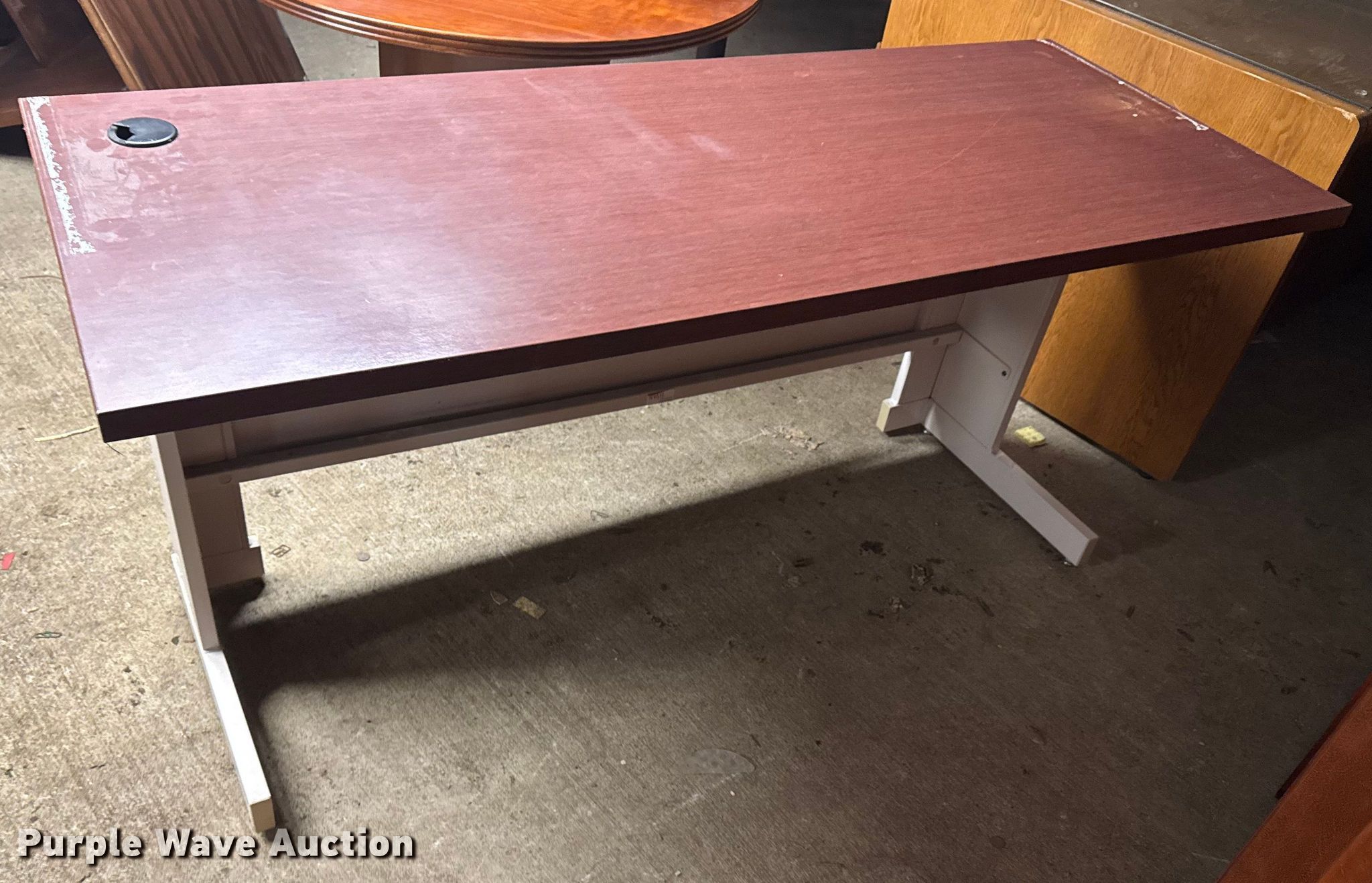 Purple Wave is selling a used Furniture in Kansas. This item is a Office furniture with the following: 3 round tables, 3 desks, 3 file cabinets
