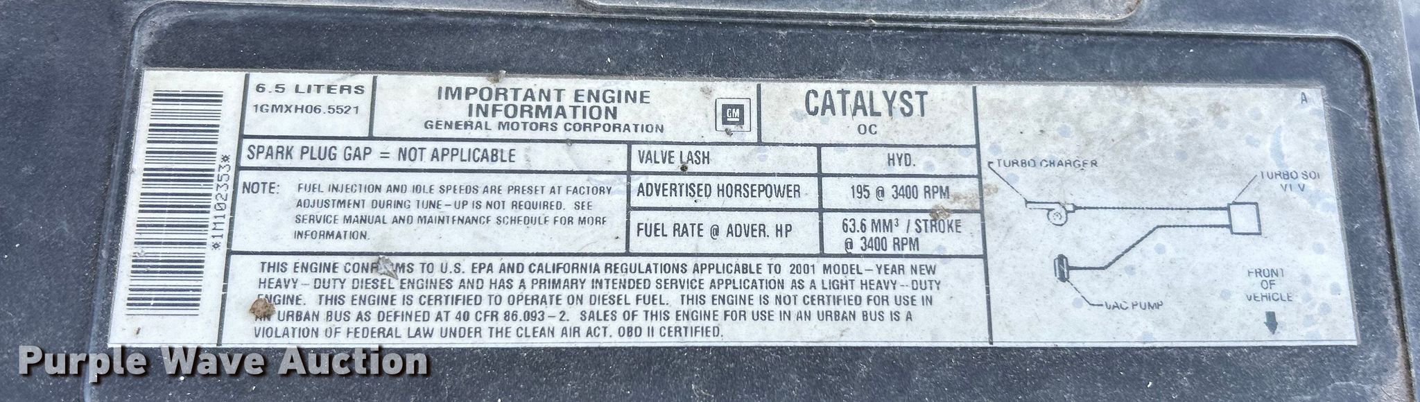 2001 GMC Sierra 3500HD SL dump bed pickup truck. Miles: 69,199 on odometer, VIN: 3GDKC34F11M102353. Engine Displacement: 6.5L, Cylinders: 8, Fuel type: Diesel. Transmission Automatic. Interior Heat. Features Bed Dump bed, Rugby, Length: 10', Width: 94", Height: 20", End gate: Manual, Plow Fisher, Width: 108". Tires Size: 225/70R19.5. Notes Jump start required during on-site data collection, Non-operational dump bed. Illinois title. Title distribution may be delayed up to 14 days from verification of funds. City of Red Bud, Illinois. Red Bud, IL 62278