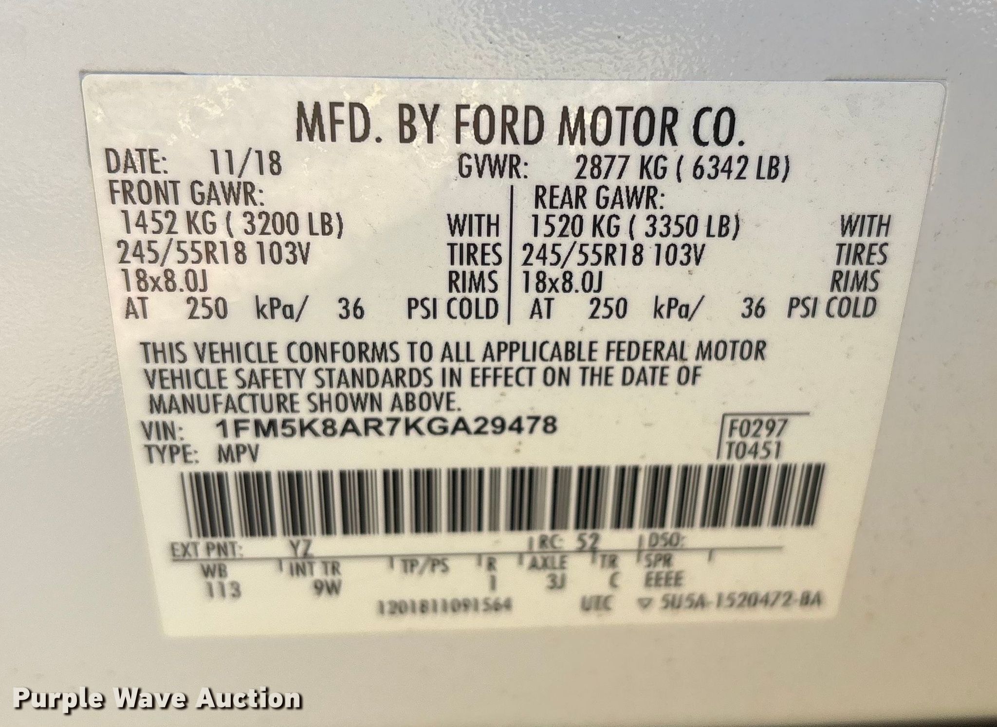 - VIN: 1FM5K8AR7KGA29478