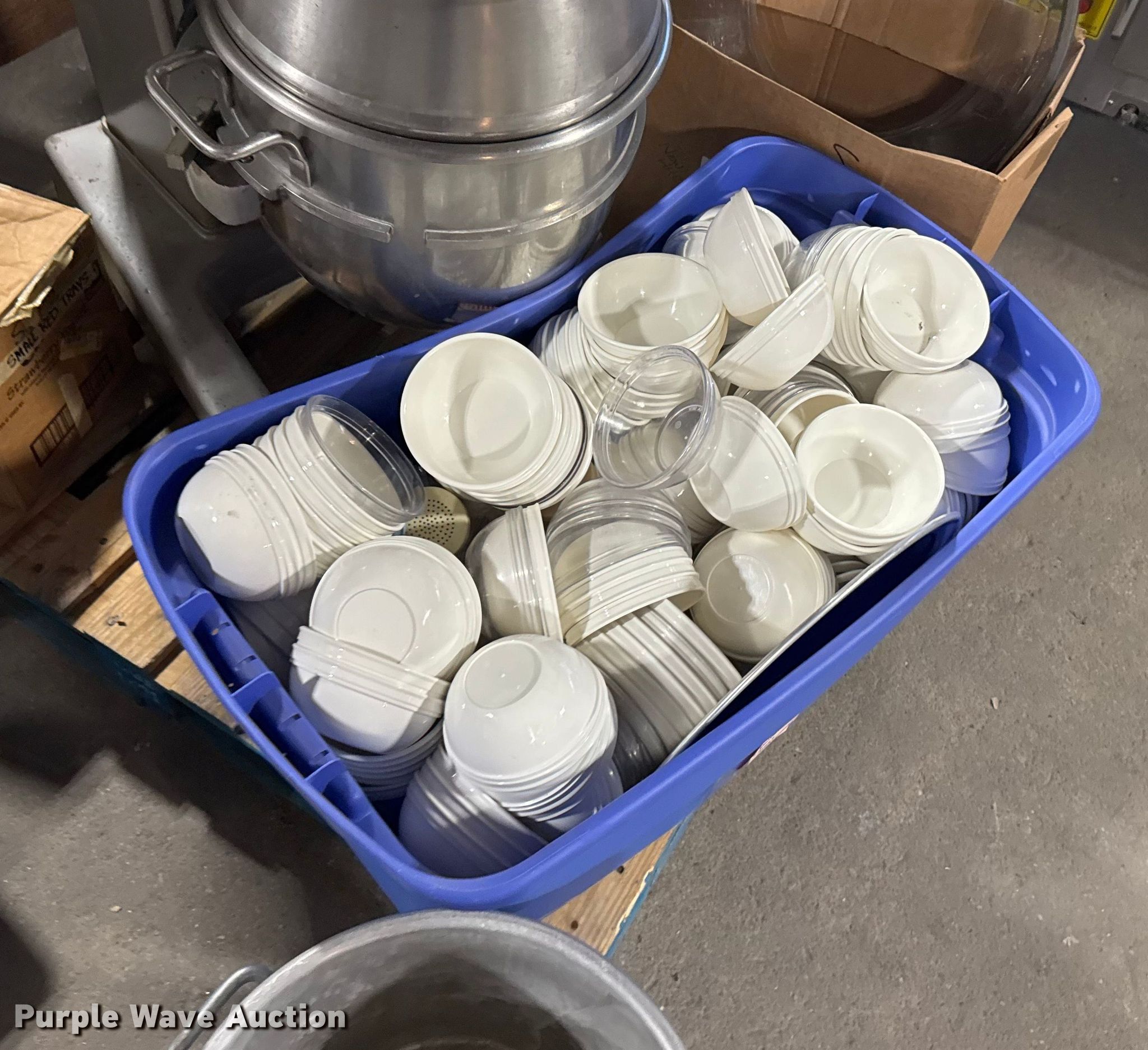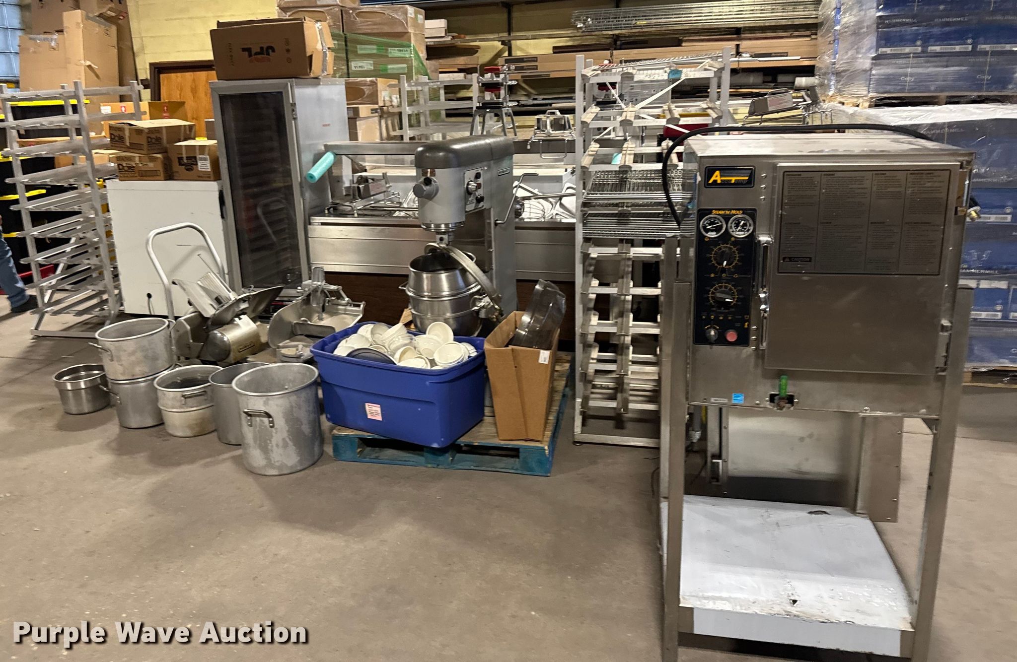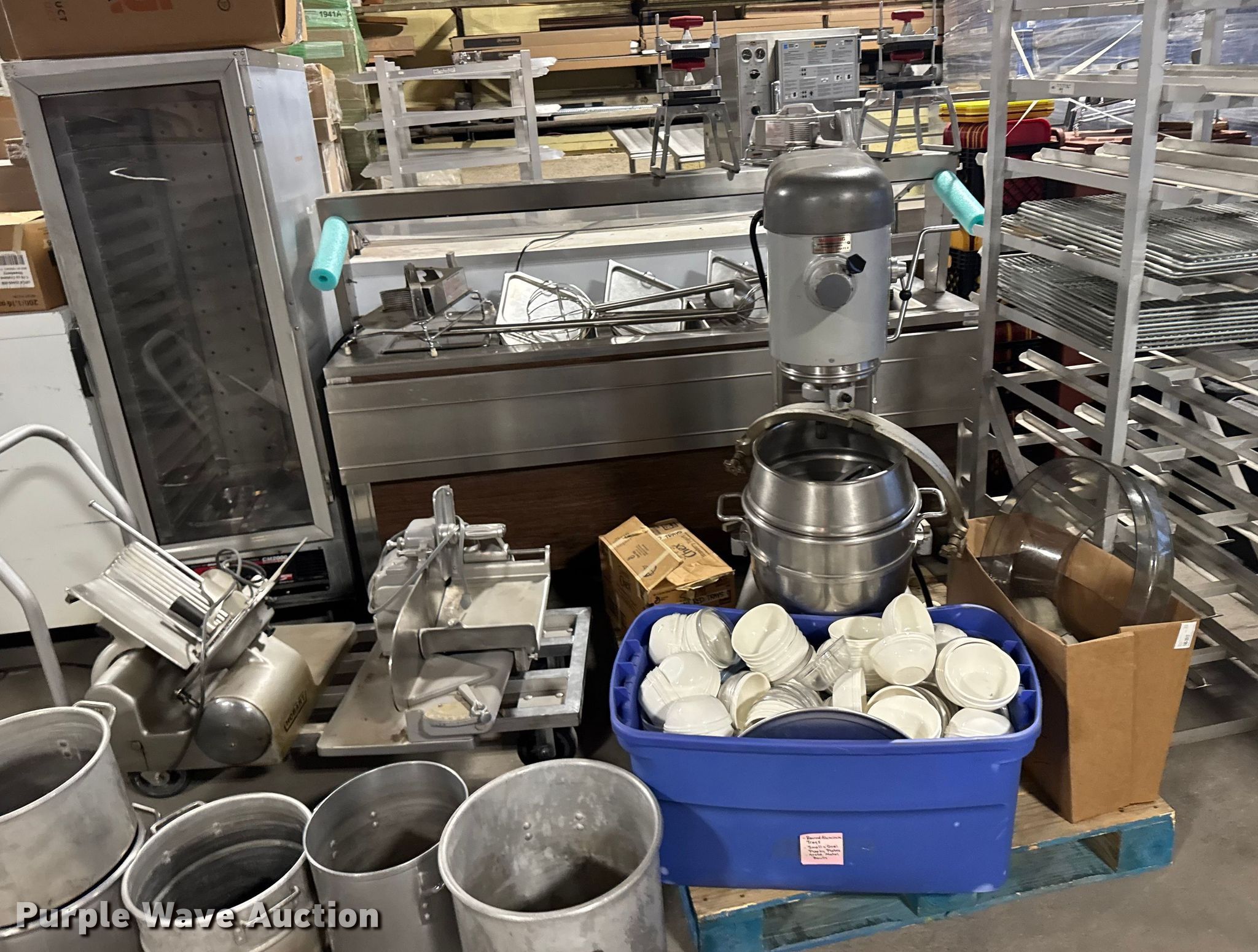 Purple Wave is selling a used Restaurant Equip. in Kansas. This item is a Restaurant equipment with the following: Mixer, Food warmers, Can racks, Meat slicers, Trays, Pots and more