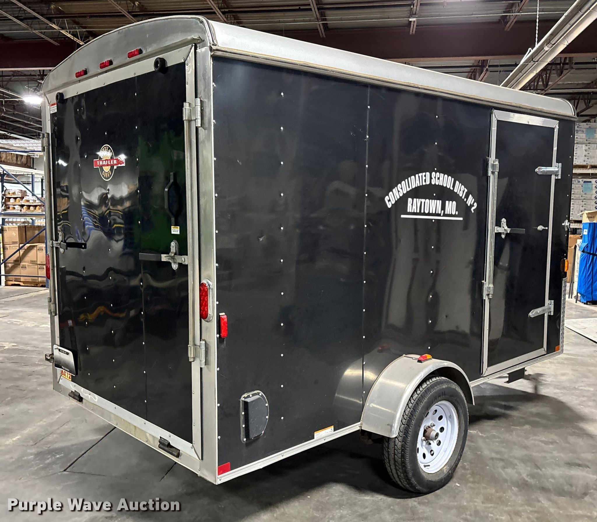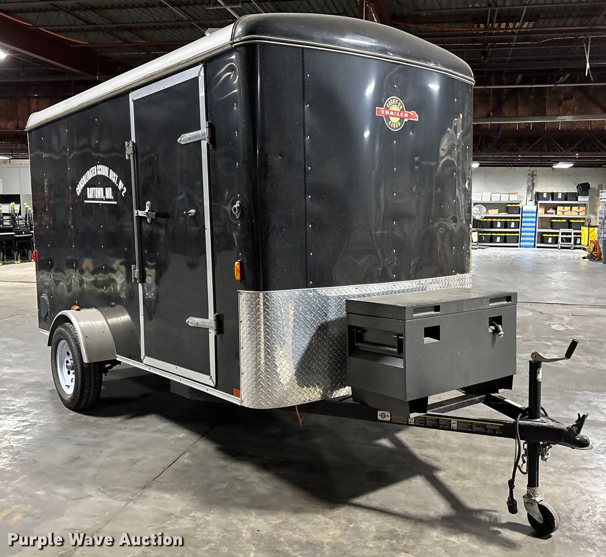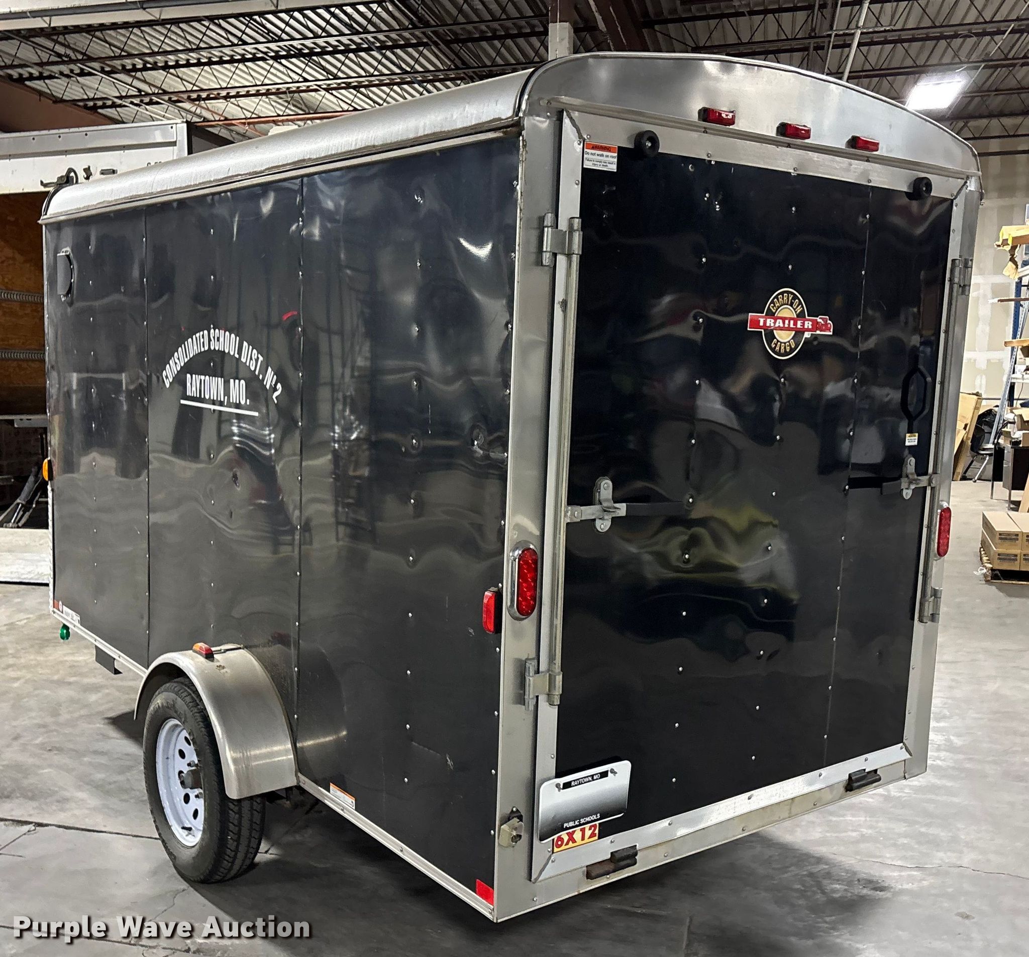 2012 Carry-On 6X12CGR enclosed cargo trailer. VIN: 4YMCL121XCM010545. Dimensions Overall Length: 16', Width: 88", Body Length: 12', Width: 6', Rear door / ramp 72" L x 60" W. Features Deck type: Wood. Chassis Ball hitch: 2", Landing gear: Single, Suspension: Spring, GVWR: 2,990 lbs, GAWR: 3,500 lbs. Tires Steel wheels, Size: 205/75D15. Missouri municipality owned asset. No title will be provided. Transfer of ownership documentation will be by notarized bill. of sale and a manufacturer's statement of origin in accordance. with MSR 301.260. Bidders are responsible for verifying if this. is sufficient to obtain title in their jurisdiction prior to bidding. Raytown C-2 School District. Raytown, MO 64133
