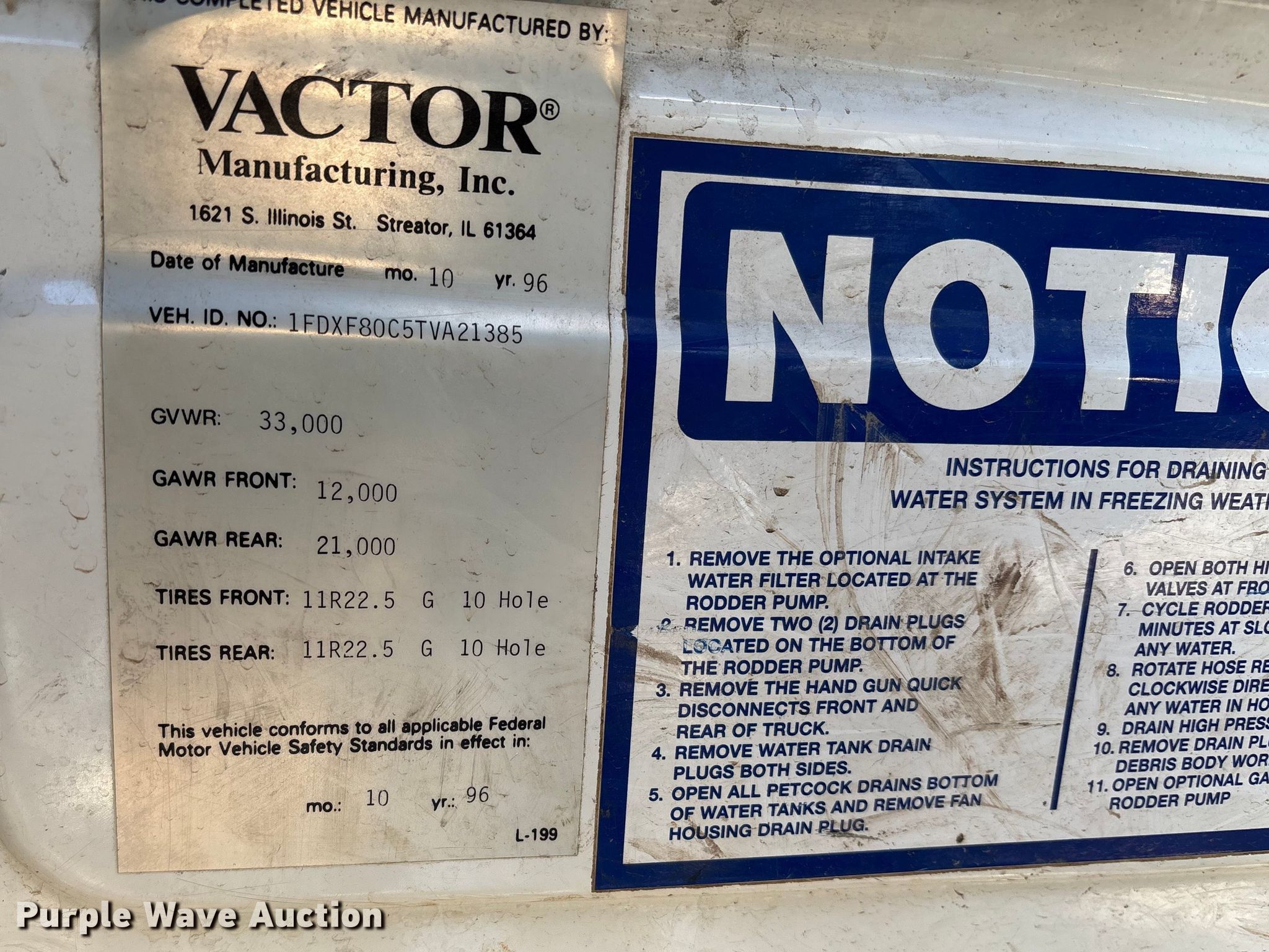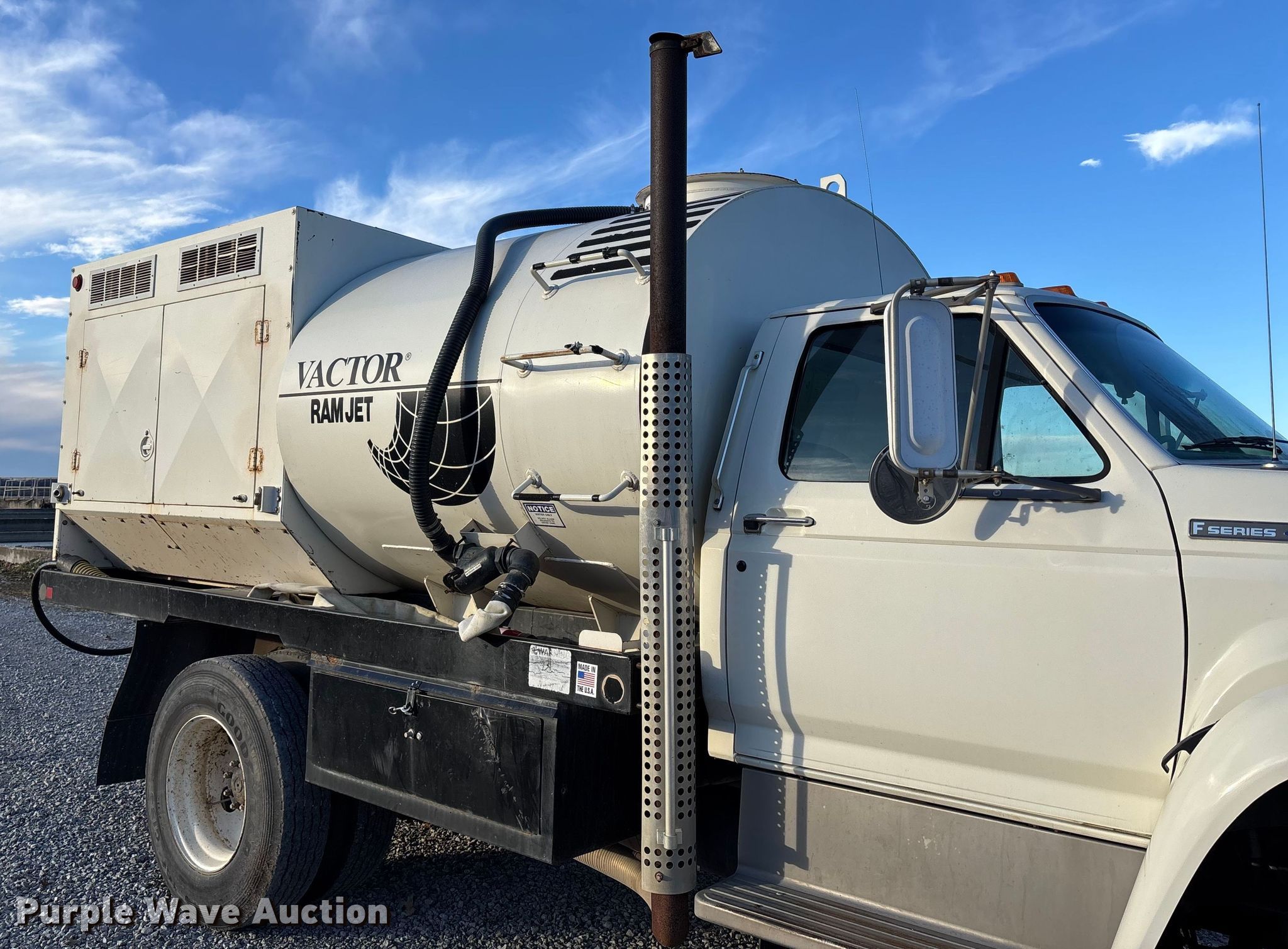 Purple Wave is selling a used Vacuum Truck in Missouri. This item is a 1996 Ford F800 sewer jetter truck with the following: Miles: 10,809 on odometer, VIN: 1FDXF80C5TVA21385