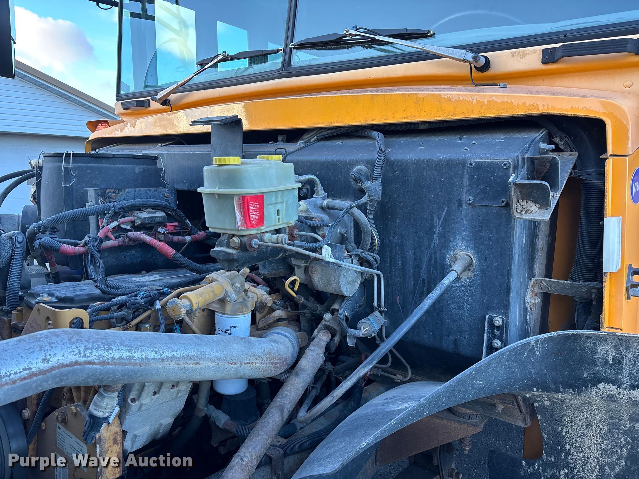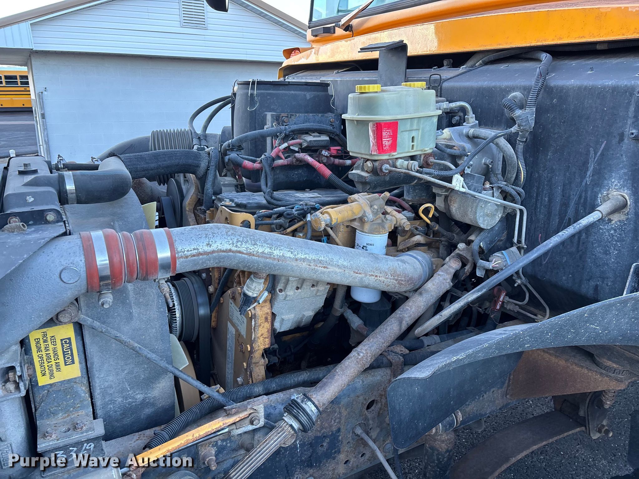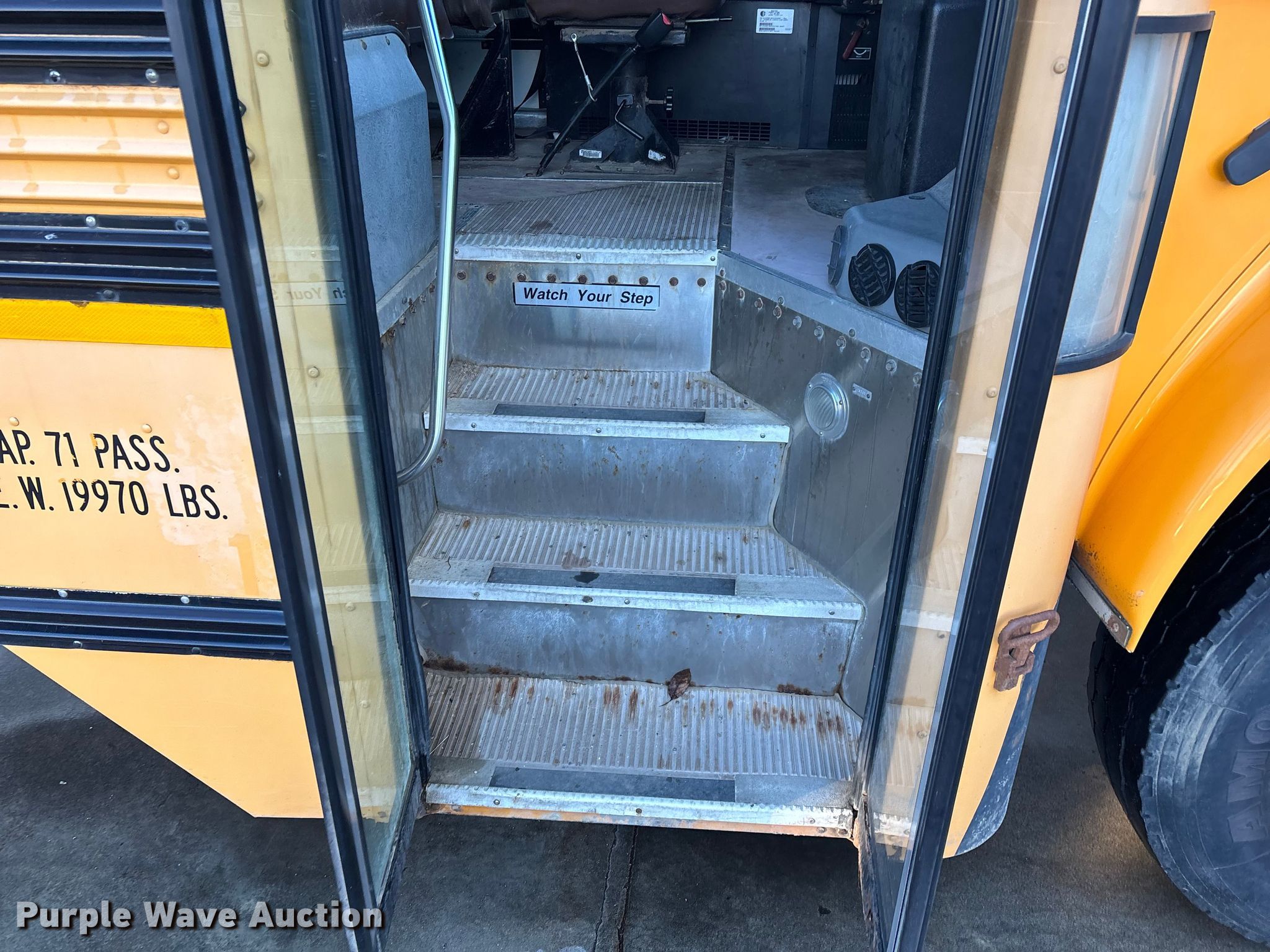 2007 Blue Bird Vision school bus. Miles: 130,525 on odometer, Hours: 6,866 on meter, VIN: 1BAKGCKH27F240158, Unit #: 19. Engine Caterpillar C7 Acert, Serial: WAX35397, Displacement: 7.2L, Cylinders: 6, Fuel type: Diesel, HP: 350, kW: 261. Transmission Automatic. Chassis Axles: Single, Suspension: Spring, Brakes: Hydraulic, GVWR: 31,000 lbs. Interior Heat, Heated mirrors, Cruise control, Passengers: 71. Tires Size: 11R22.5. Notes Non-operational rear left door, does not open, Dash warning indicator: ABS, Windshield chipped or cracked, Frame rust, Tires damaged, Possible engine issues, difficult to start when cold. Missouri title. Title distribution may be delayed up to 14 days from verification of funds. Eldon R-1. Eldon, MO 65026