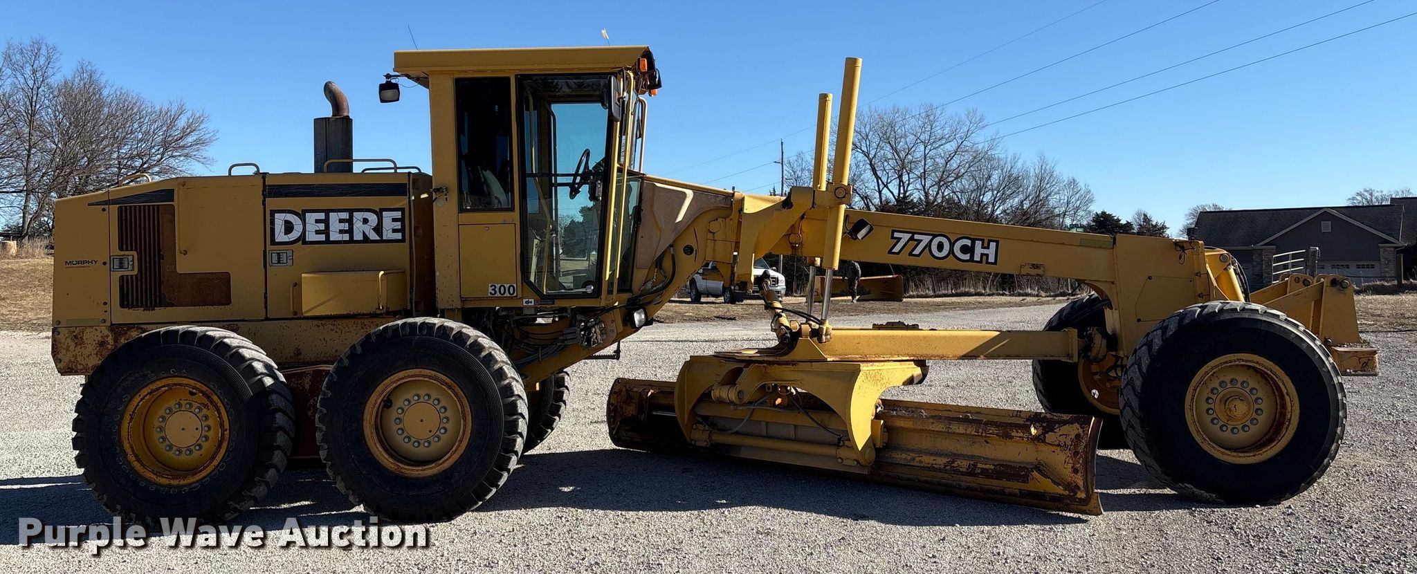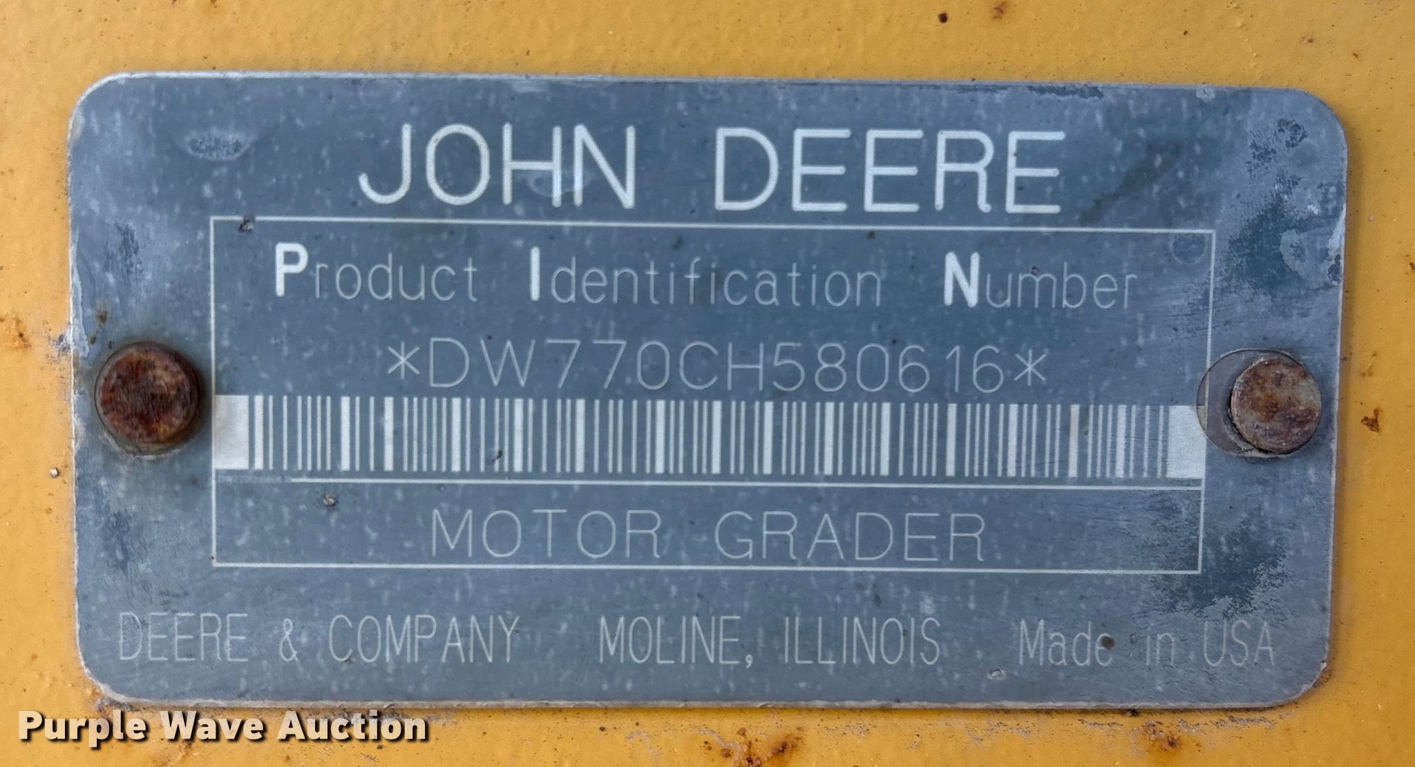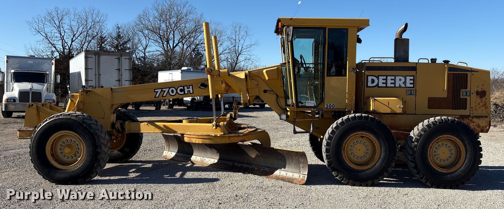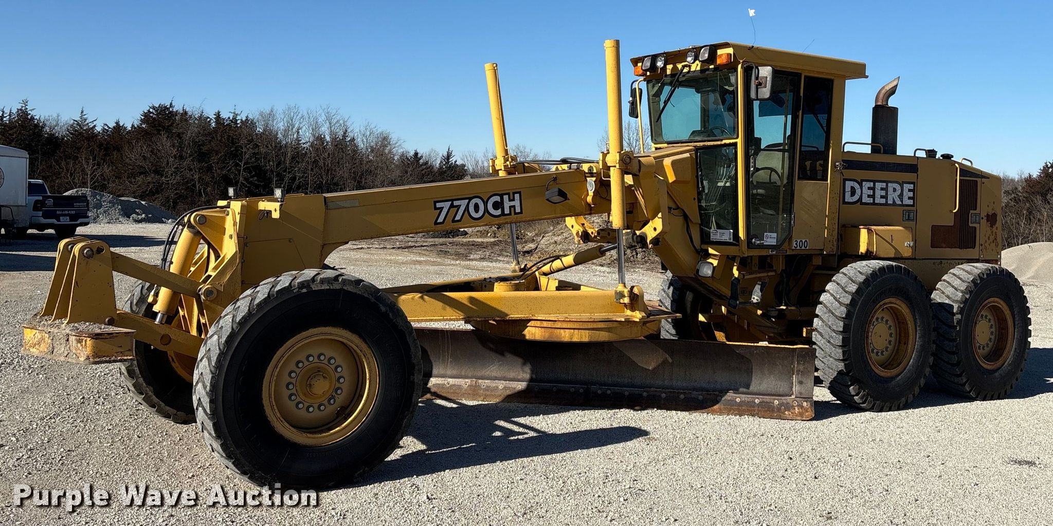 Purple Wave is selling a used Motor Grader in Iowa. This item is a 2001 John Deere 770CH motor grader with the following: Hours: 11,482 on meter, Serial: DW770CH580616