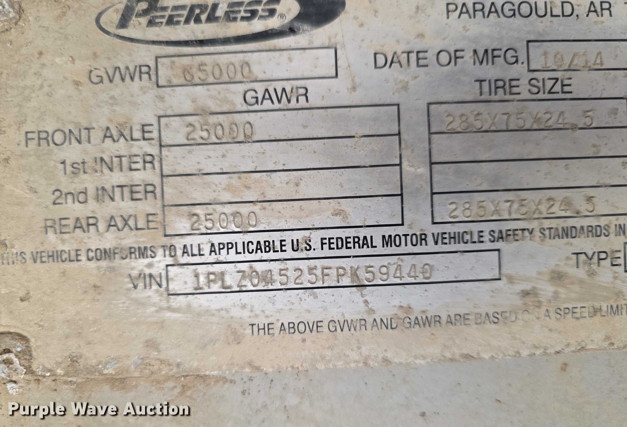 2015 Peerless 45SWO walking floor trailer. VIN: 1PLZ04525FPK59440. Dimensions Overall Length: 46', Width: 8' 3", Side height: 100". Features Deck type: Aluminum. Chassis Landing gear: Dual, Suspension: Spring, Brakes: Air, Axles: Tandem, GVWR: 65,000 lbs, GAWR: 25,000 lbs. Tires Steel wheels, Size: 285/75R24.5. Notes Rust damage, Unknown operating condition of walking floor, Unknown operating condition. Kansas title. Title distribution may be delayed up to 14 days from verification of funds. Marion County Highway Department. Marion, KS 66861