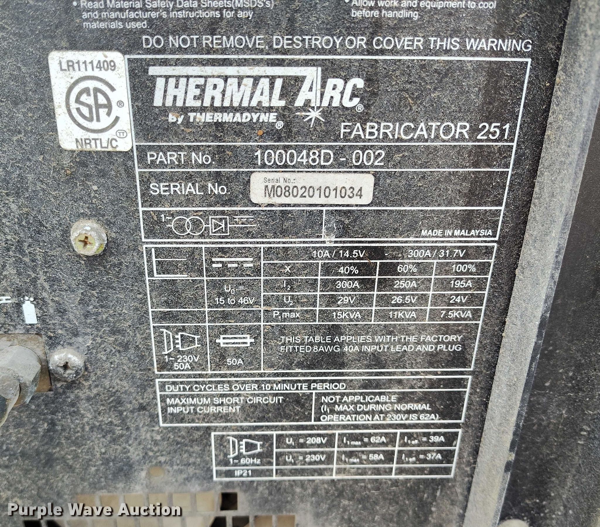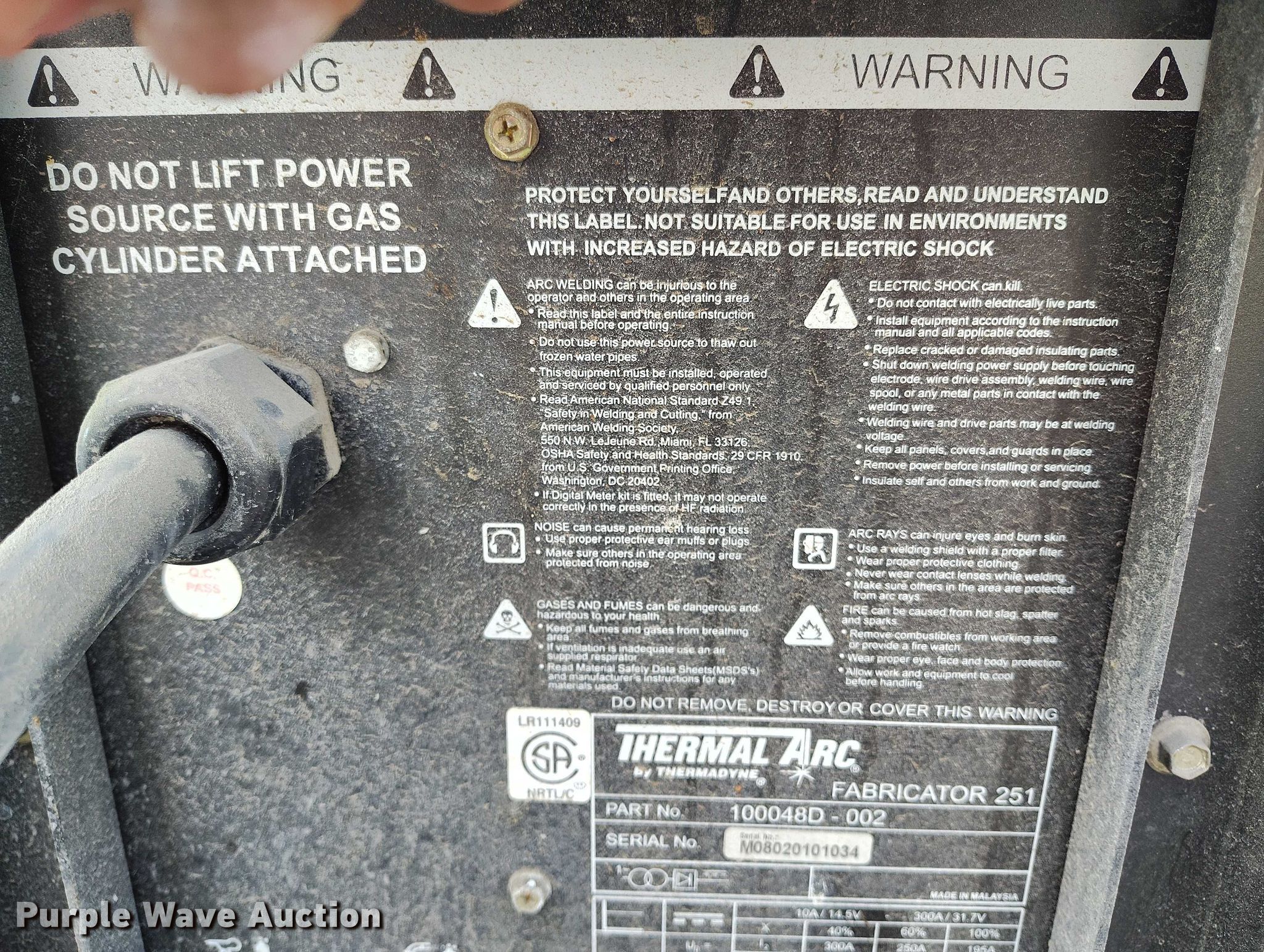 Purple Wave is selling a used Welder (Manual) in Colorado. This item is a Thermal Arc 251 welder with the following: Serial: M08020101034