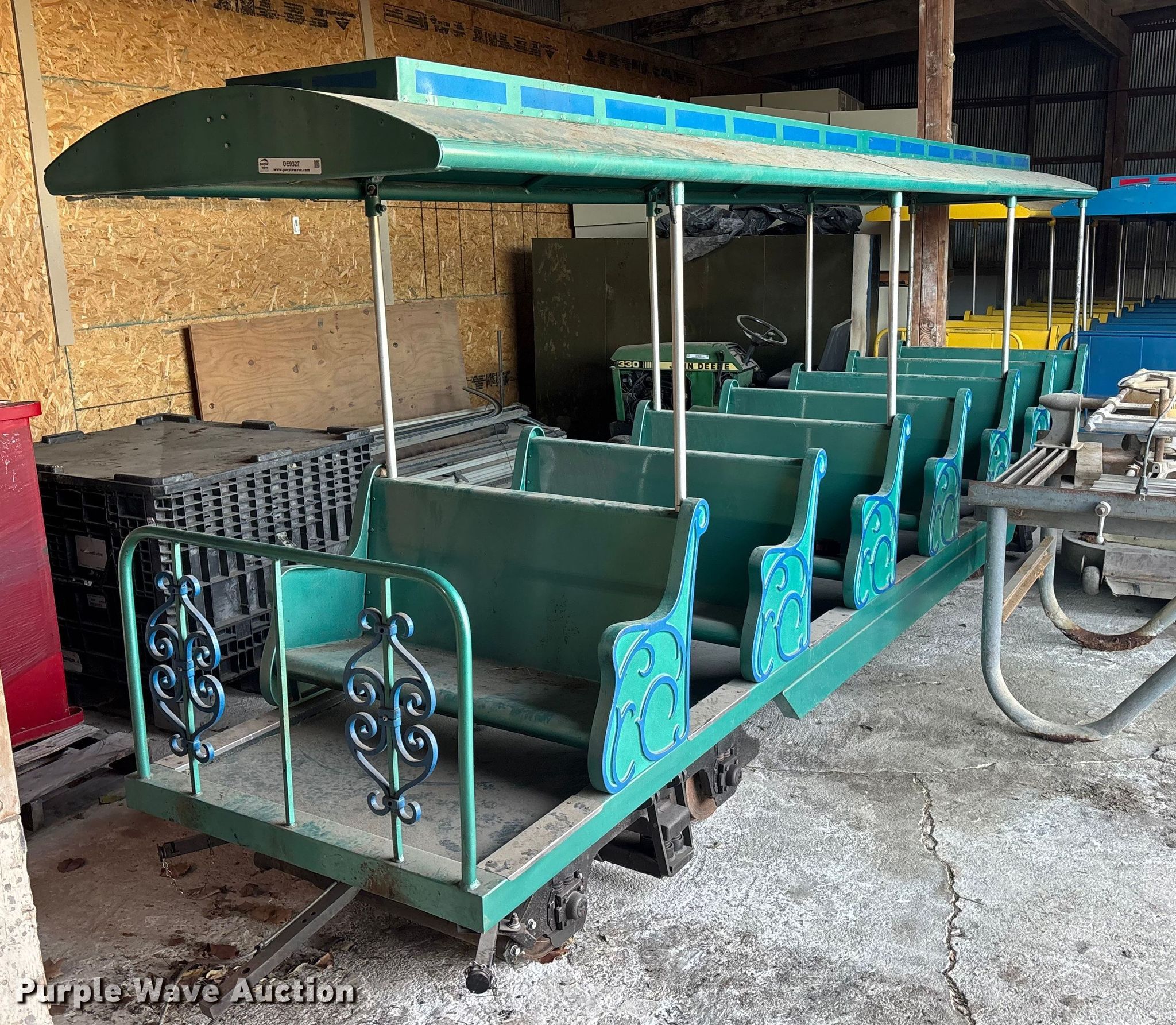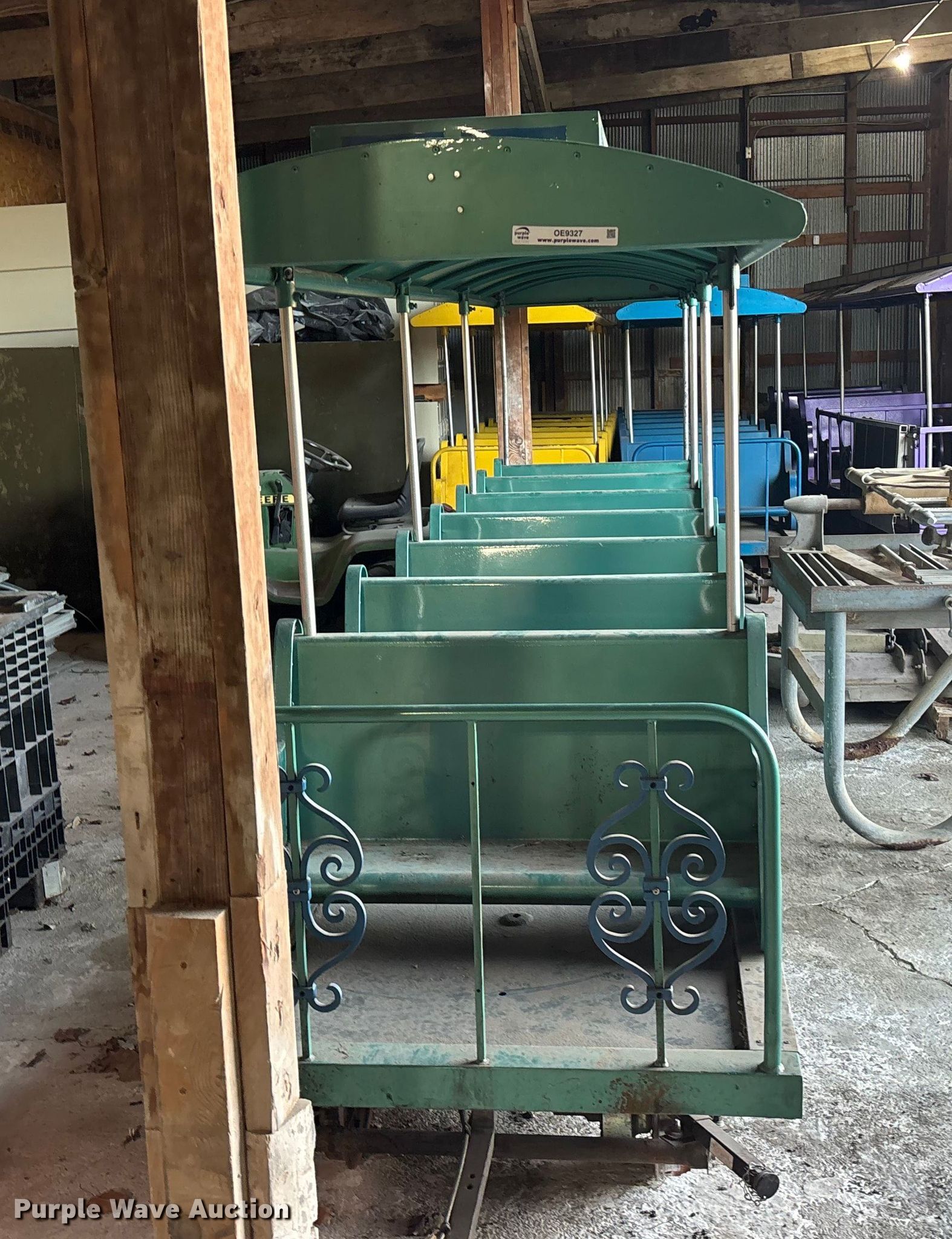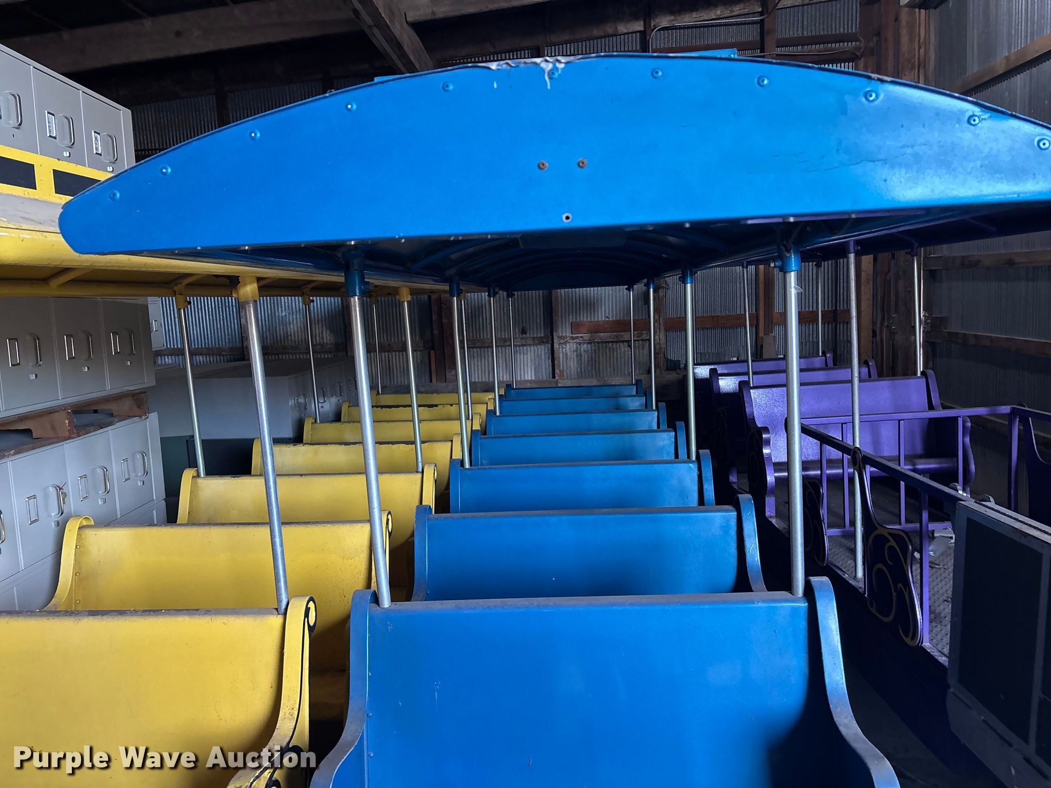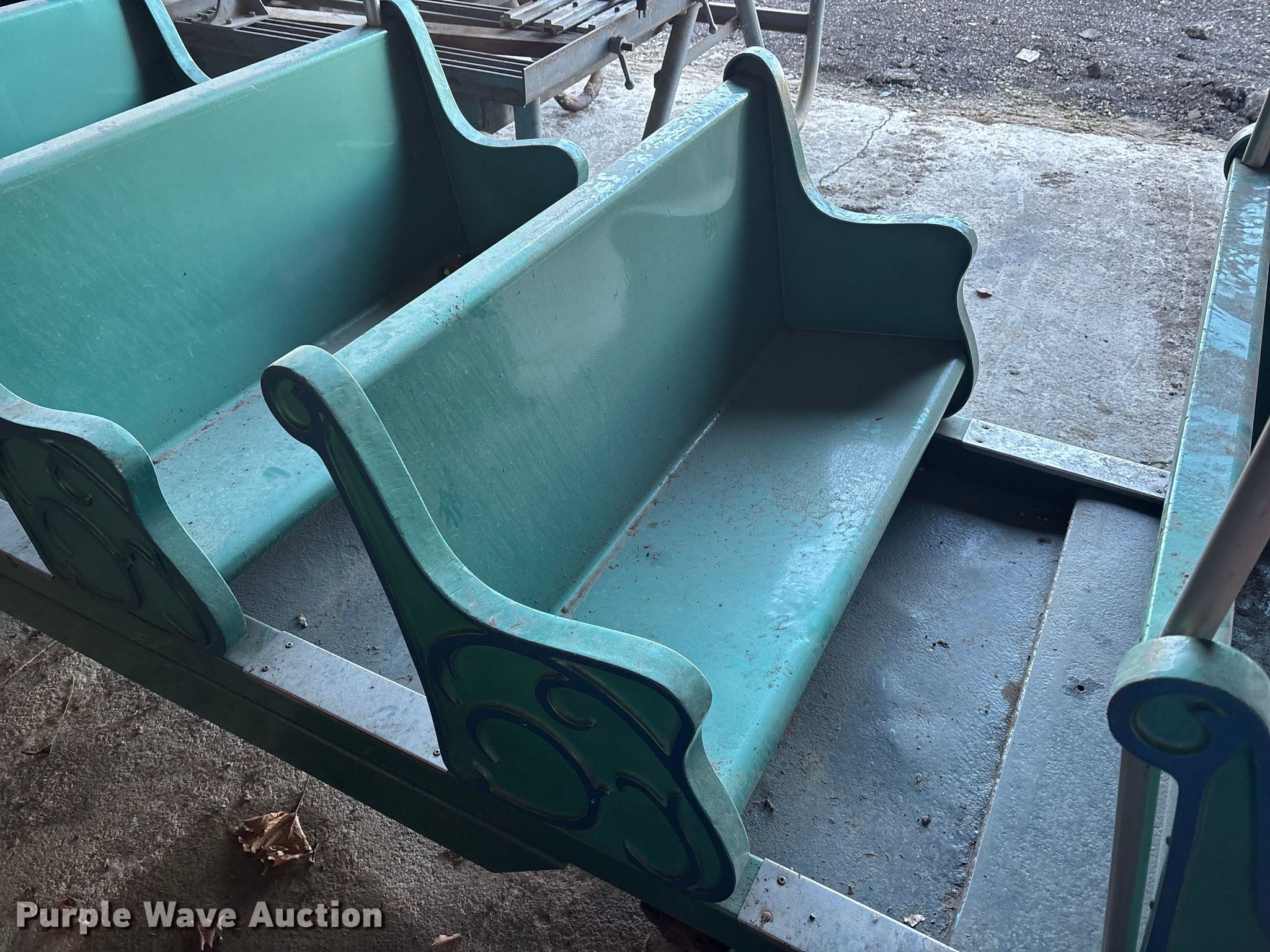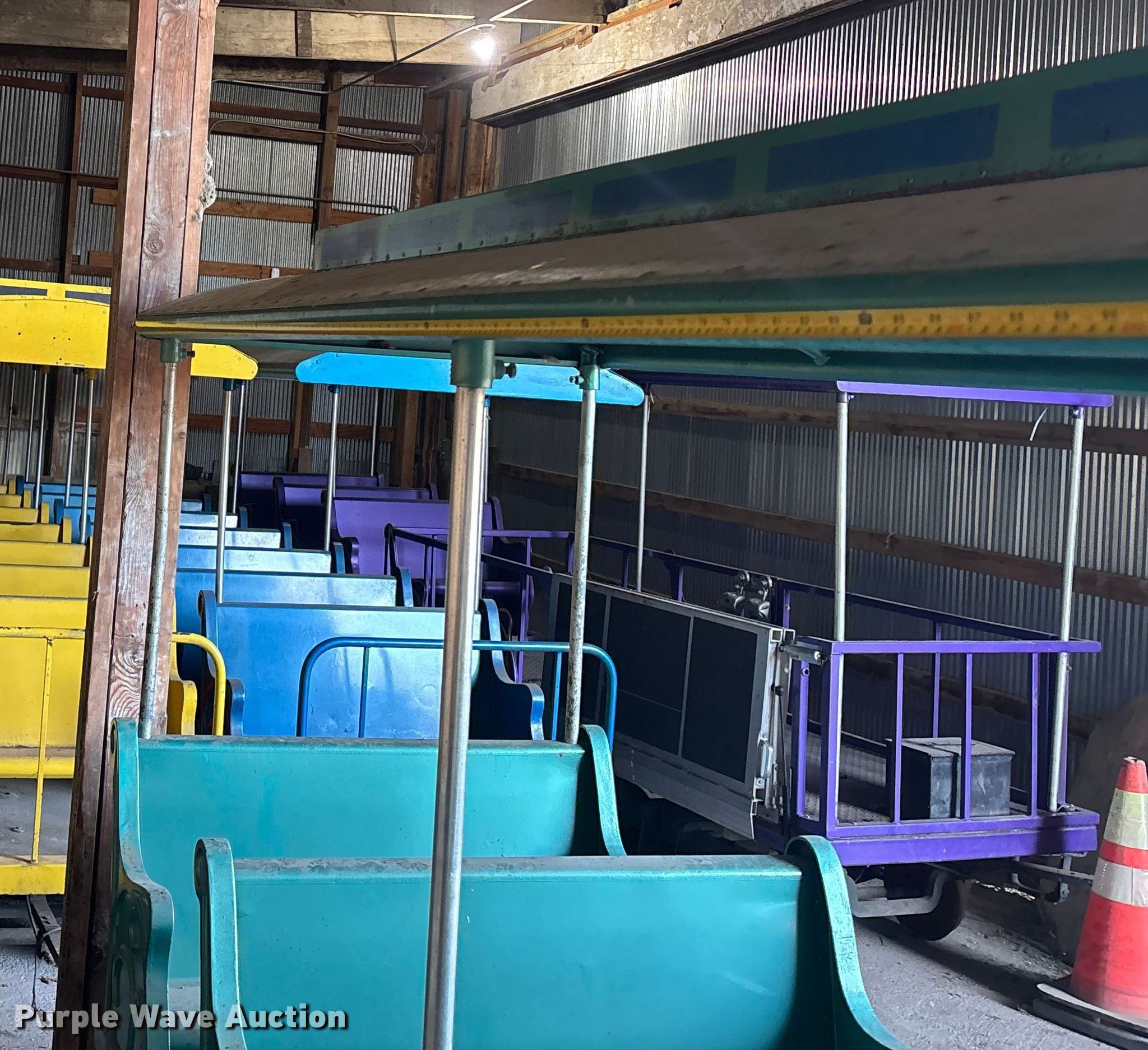 Purple Wave is selling a used Sporting Goods in Kansas. This item is a (3) passenger train cars with the following: Dimensions: 17' L x 40" W, Hitch: Pin, Brakes