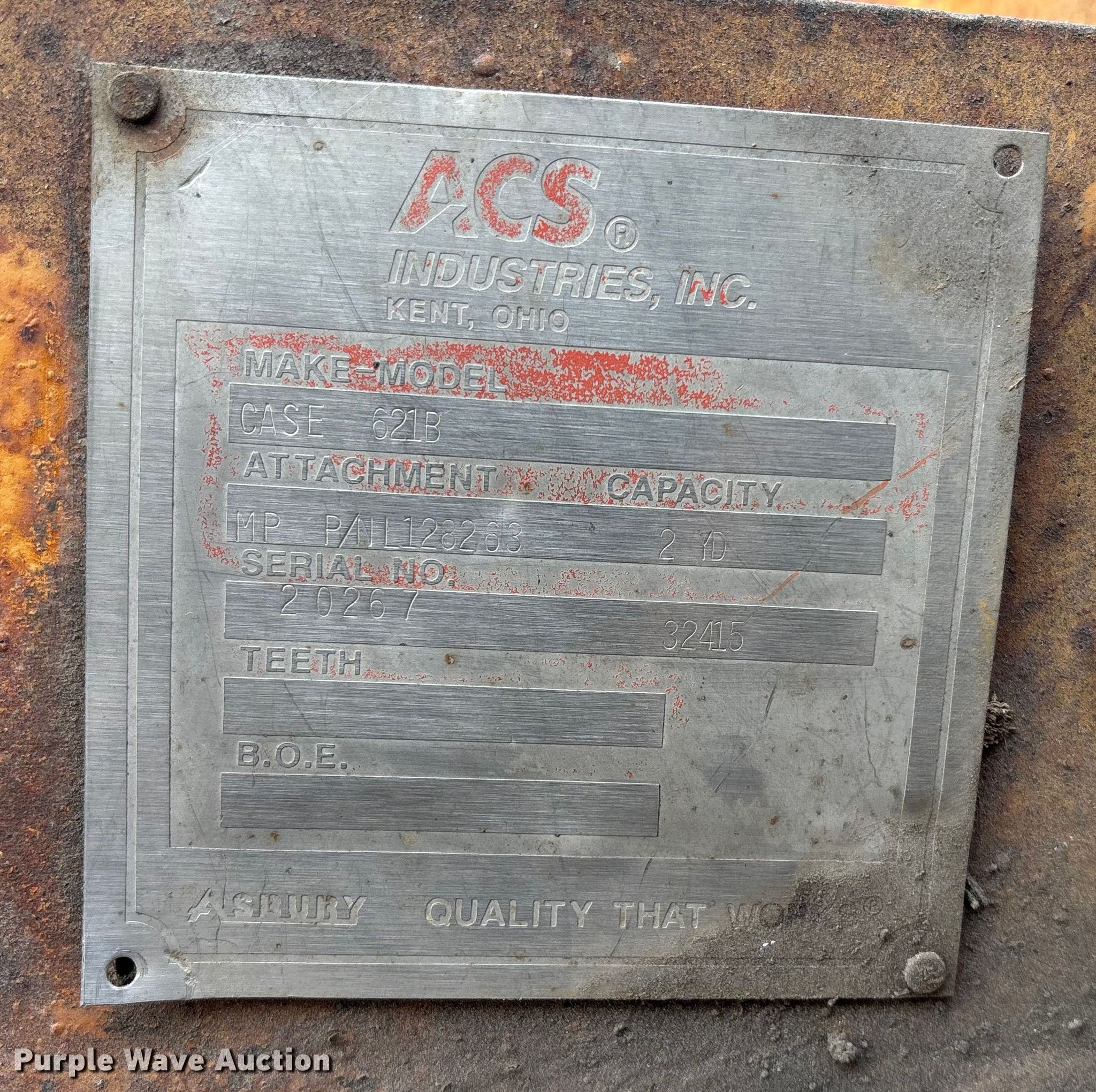 1996 Case 621B wheel loader. Hours: 4,926 on meter, Serial: JEE0052808. Engine Cylinders: 6, Fuel type: Diesel. Transmission Powershift, 3F - 3R. Operators station Enclosed cab, AC, Heat, Bucket controls: Two-lever. Features Auxiliary hydraulics: Front, Counter weights, Bucket ACS Case 621B, Capacity: 2 cu.yd., Width: 98", Four-in-one, Cutting edge: Bolt-on. Tires Size: 17.5R25. Shawnee County Parks and Rec. Topeka, KS 66605