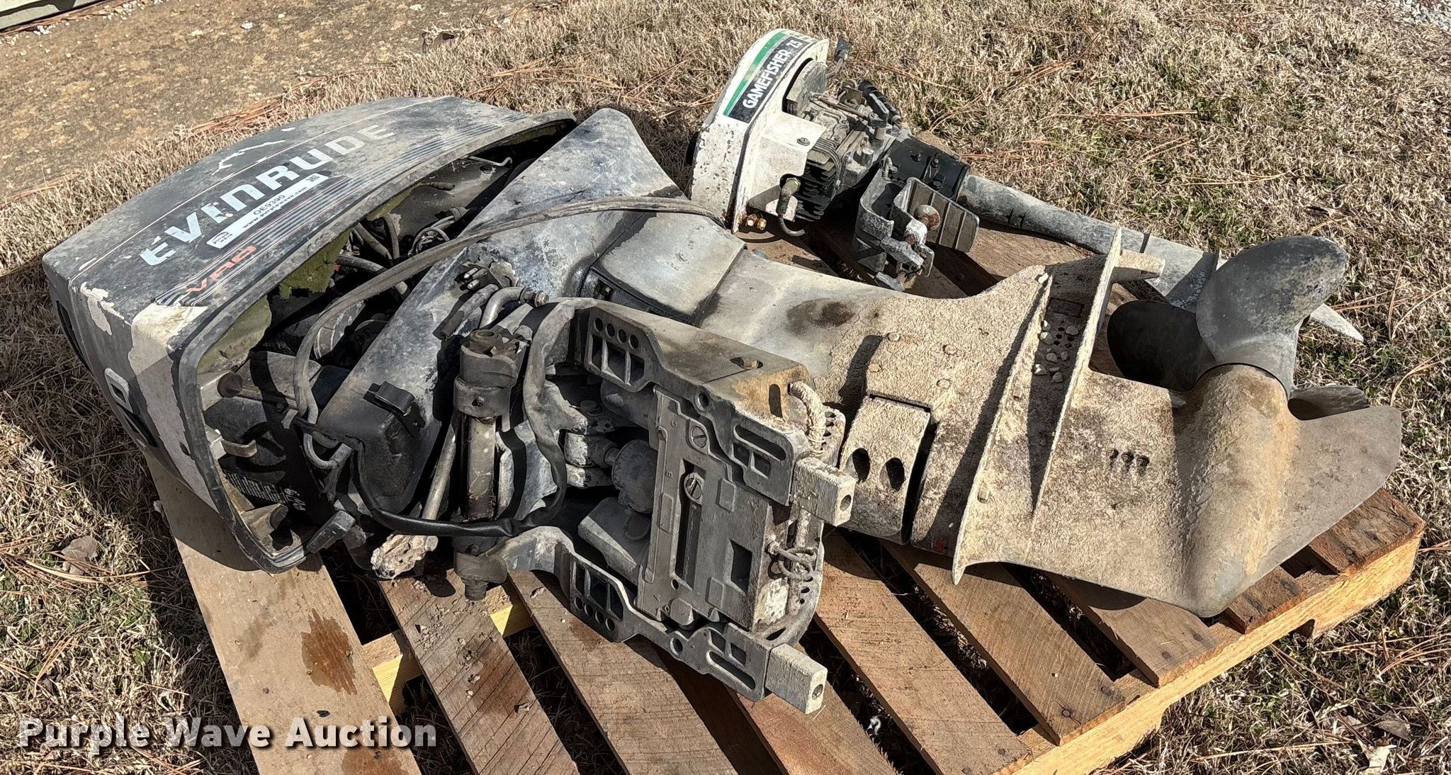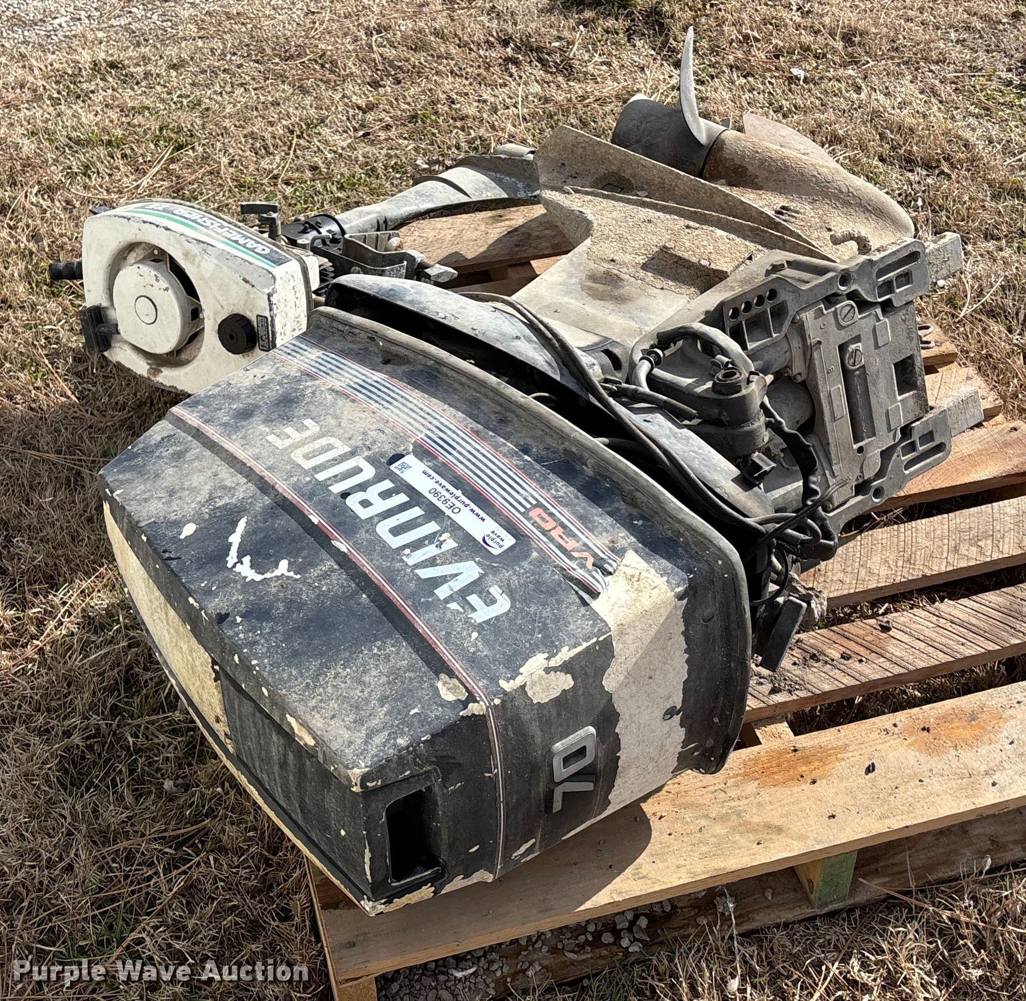 Purple Wave is selling a used Boat in Kansas. This item is a (2) boat engines with the following: Engine type: Outboard, Evinrude VRO 70, Serial: E70TLESB, Cylinders: 3, Fuel type: Gas, Outdrive, Propeller: Aluminum