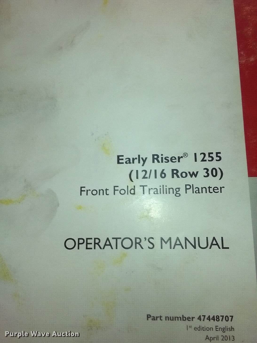 2014 Case IH Early Riser 1255 planter. Row units: 16, Row spacing: 30", Serial: YDS043375. Features Frame Hitch: Two point, Marker arm, Fold type: Front, Seed delivery Individual seed hoppers, Capacity: 3 bushels, Row units Vacuum metering, Meter drive: Ground, Seed meters: Corn, Soybeans, Other meters: Milo, Down pressure: Pneumatic, Row cleaners, Disk openers: Double, Gauge wheels: Double, Closing system: Single Type: Rubber, Electronics Monitor Case Early Riser IV.. Notes Frame fold controller included, Manual. Ferris Farms. Vinita, OK 74301